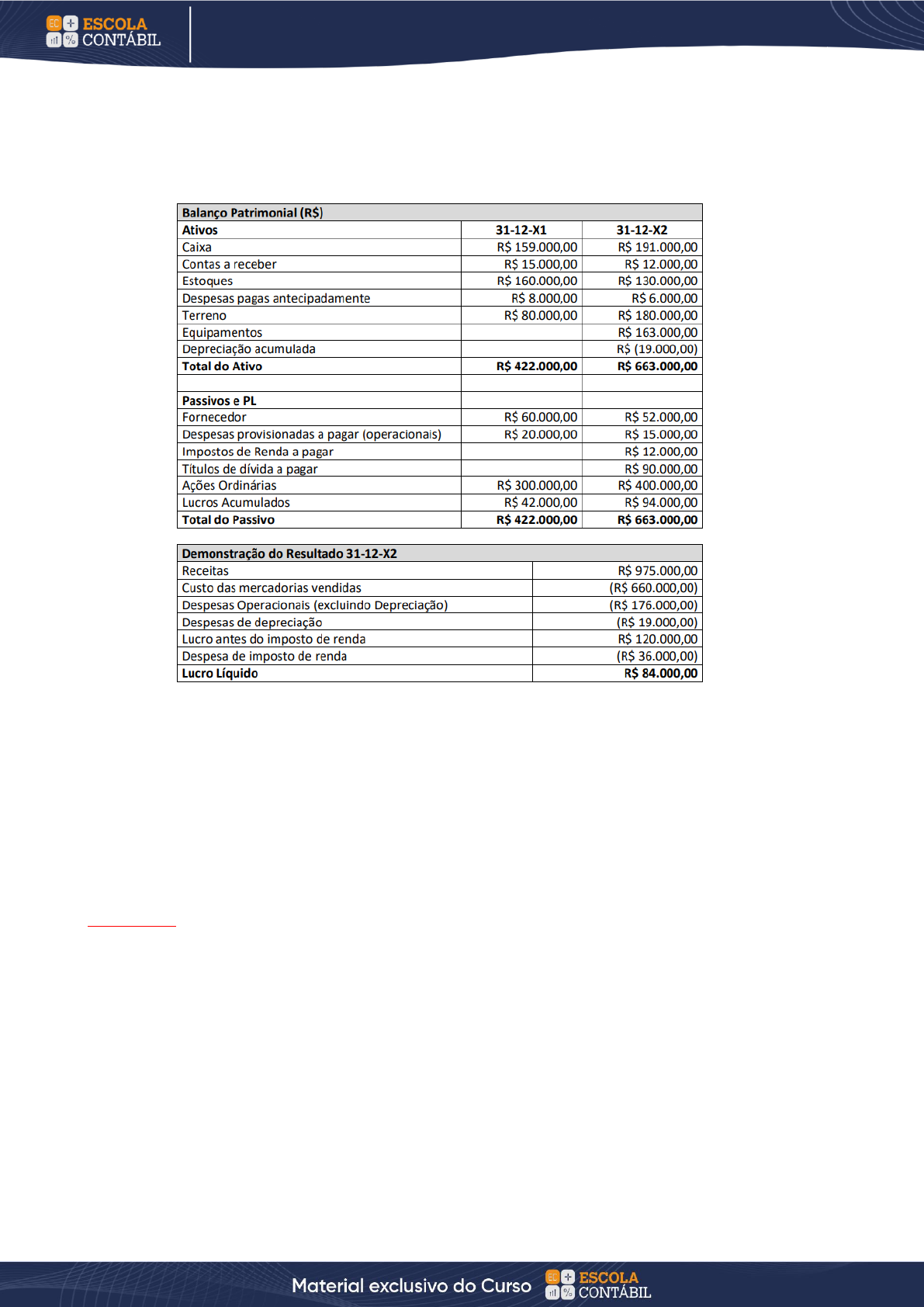CADERNO 300 QUESTÕES COMENTADAS COMENTADAS 67 CADERNO 300 QUESTÕES COMENTADAS COMENTADAS CADERNO 300 QUESTÕES EXAME DE SUFICIÊNCIA 51. (Consulplan/Exame CFC/2022.2) Determinada sociedade empresária apresentou o Balanço Patrimonial e a Demonstração de Resultado nos anos de X1 e X2 Considerando única e exclusivamente as informações disponibilizadas e, ainda, a NBC TG 03 (R3) – Demonstração do Fluxo de Caixa (DFC), em relação à DFC dessa empresa, apurada em 31-12-20X2, assinale a afirmativa correta. A) O caixa gerado nas atividades operacionais foi R$ 32.000,00. B) O caixa gerado nas atividades operacionais foi R$ 137.000,00. C) O caixa gerado nas atividades de investimento foi R$ 58.000,00. D) O caixa consumido nas atividades de financiamento foi R$ 163.000,00. Comentário: Mais uma questão com o gabarito erroneamente divulgado pela Consulplan. Comentamos o gabarito preliminar e esperamos que, com o gabarito definitivo, haja correção para a questão correta.