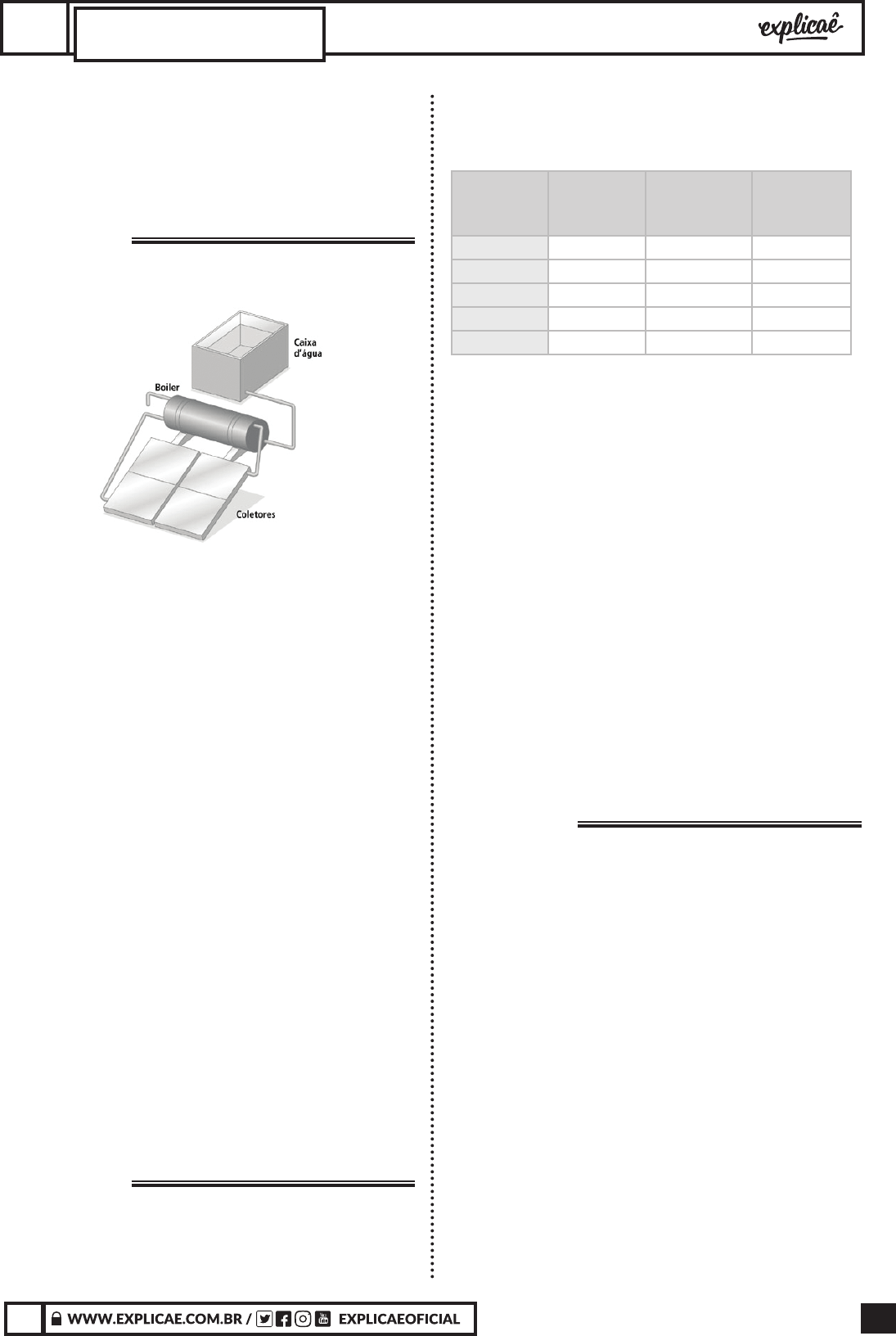 151X X CIÊNCIAS DA NATUREZA E SUAS TECNOLOGIASFÍSICA A. fóssil, nuclear, biomassa e eólica. B. eólica, fóssil, nuclear e biomassa. C. nuclear, biomassa, fóssil e eólica. D. fóssil, biomassa, eólica e nuclear. E. nuclear, fóssil, biomassa e eólica. QUESTÃO 27 (ENEM 2009 2ª APLICAÇÃO) A luz solar que atinge a parte superior da atmosfera terrestre chega a uma taxa constante de 135,2 mW/cm². Dessa radiação, apenas 50% conseguem chegar à superfície, pois parte dela é refletida pelas nuvens e absorvida pela atmosfera. A radiação solar pode ser aproveitada para aquecer água de reservatórios, entre outras aplicações. Um sistema básico para transformar energia solar em térmica é ilustrado na figura ao lado acima. Esse sistema é constituído de coletores solares e de um reservatório térmico, chamado boiler. Os coletores solares, geralmente, são feitos de materiais que absorvem bem a radiação solar, e o calor gerado nos coletores é transferido para a água que circula no interior de suas tubulações de cobre. A água aquecida é armazenada no boiler. Dessa forma, a água é mantida quente para consumo posterior. A caixa de água fria alimenta o boiler, mantendo-o sempre cheio. www.icb.ufmg.br. Acesso em: 22 jun. 2008 (adaptado). É correto afirmar que os coletores solares permitem boa economia de energia, pois A. se aplicam à produção tanto de energia térmica quanto elétrica. B. constituem fonte energética alternativa aos combustíveis fósseis usados no transporte. C. convertem energia radiante em energia térmica, que é usada no processo de aquecimento da água. D. permitem economizar até 135,2 mWh de energia elétrica, que seriam gastos com aquecimento elétrico. E. a energia luminosa coletada por eles pode ser usada para reduzir o número de lâmpadas usadas no ambiente. QUESTÃO 28 (ENEM 2009 2ª APLICAÇÃO) A eficiência de um coletor solar depende de uma série de variáveis. Na tabela abaixo, são mostradas diferenças na radiação solar incidente em diferentes capitais brasileiras localizadas em ordem crescente da latitude. Energia útil avaliada como média anual para um sistema de aquecimento de água via energia solar. (Coletores solares inclinados de um ângulo igual à latitude, acrescentados mais 10o) Capital Temperatura média anual 0C Radiação solar incidente média kWh/m2 por dia Energia útil média kWh/m2 por dia Natal 25,9 5,40 1,67 Salvador 25,1 4,95 1,52 Cuiabá 26,8 4,96 1,48 Curitiba 17,6 4,73 1,60 Florianópolis 20,8 4,24 1,32 * Energia útil média: índice de aproveitamento da energia solar incidente. Observação: o sistema de aquecimento conta com uma área de 4m2 de coletores solares. Considerando os dados mostrados na tabela, na transformação da energia luminosa, observa-se que A. a radiação solar média coletada independe do tamanho da superfície de captação do coletor solar. B. Curitiba, entre as capitais citadas, é inadequada para a utilização de energia solar porque é a capital onde ocorrem as maiores perdas de energia térmica para o ambiente. C. a energia útil média, um índice a ser considerado na comparação com outras opções energéticas, decresce com o aumento da latitude. D. a diferença de radiação solar incidente nas capitais listadas, apesar de ser maior que 20%, deixa de ser determinante em algumas situações. E. as temperaturas alcançadas independem da temperatura inicial da água no processo de aquecimento da água por meio de coletores solares. QUESTÃO 29 (ENEM 2010 1ª APLICAÇÃO) Deseja-se instalar uma estação de geração de energia elétrica em um município localizado no interior de um pequeno vale cercado de altas montanhas de difícil acesso. A cidade é cruzada por um rio, que é fonte de água para consumo, irrigação das lavouras de subsistência e pesca. Na região, que possui pequena extensão territorial, a incidência solar é alta o ano todo. A estação em questão irá abastecer apenas o município apresentado. Qual forma de obtenção de energia, entre as apresentadas, é a mais indicada para ser implantada nesse município de modo a causar o menor impacto ambiental? A. Nuclear, pois o modo de resfriamento de seus sistemas não afetariam a população. B. Hidrelétrica, pois o rio que corta o município é suficiente para abastecer a usina construída. C. Termoelétrica, pois é possível utilizar a água do rio no sistema de refrigeração. D. Fotovoltaica, pois é possível aproveitar a energia solar que chega à superfície do local. E. Eólica, pois a geografia do local é própria para a captação desse tipo de energia. Importante: Esse arquivo digital pertence ao CPF: 706.034.921-93. Proibida a reprodução e o compartilhamento 152 X X CIÊNCIAS DA NATUREZA E SUAS TECNOLOGIASFÍSICA QUESTÃO 30 (ENEM 2010 1ª APLICAÇÃO) A fonte de energia representada na fi gura, considerada uma das mais limpas e sustentáveis do mundo, é extraída do calor gerado A. pela queima do carvão e combustível fósseis. B. pelos detritos e cinzas vulcânicas. C. pela circulação do magma no subsolo. D. pelo sol que aquece as águas com radiação ultravioleta. E. pelas erupções constantes dos vulcões. QUESTÃO 31 (ENEM 2010 2ª APLICAÇÃO) No nosso dia a dia deparamo-nos com muitas tarefas pequenas e problemas que demandam pouca energia para serem resolvidos e, por isso, não consideramos a efi ciência energética de nossas ações. No global, isso signifi ca desperdiçar muito calor que poderia ainda ser usado como fonte de energia para outros processos. Em ambientes industriais, esse reaproveitamento é feito por um processo chamado de cogeração. A fi gura a seguir ilustra um exemplo de cogeração na produção de energia elétrica. HINRICHS, R.A.; KLEINBACH, M. Energia e meio ambiente. Em relação ao processo secundário de aproveitamento de energia ilustrado na fi gura, a perda global de energia é reduzida por meio da transformação de energia A. térmic
