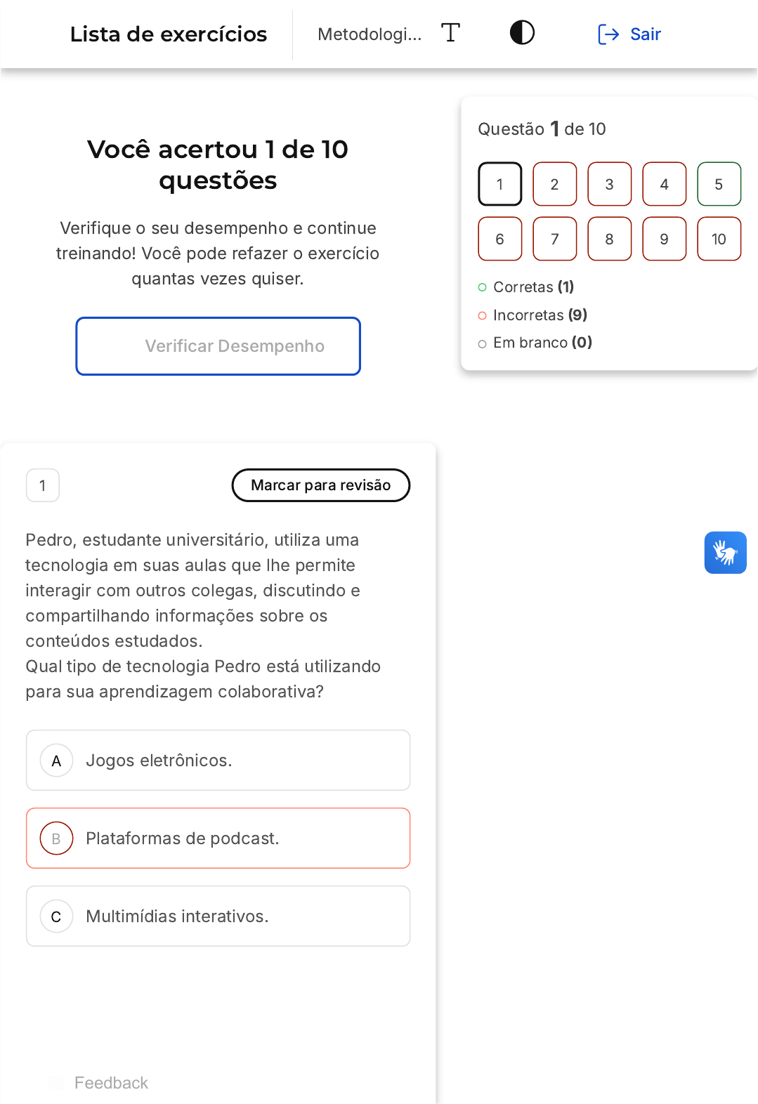 Você acertou 1 de 10 questões Verifique o seu desempenho e continue treinando! Você pode refazer o exercício quantas vezes quiser. Verificar Desempenho A B C 1 Marcar para revisão Pedro, estudante universitário, utiliza uma tecnologia em suas aulas que lhe permite interagir com outros colegas, discutindo e compartilhando informações sobre os conteúdos estudados. Qual tipo de tecnologia Pedro está utilizando para sua aprendizagem colaborativa? Jogos eletrônicos. Plataformas de podcast. Multimídias interativos. Questão 1 de 10 Corretas (1) Incorretas (9) Em branco (0) 1 2 3 4 5 6 7 8 9 10 Lista de exercícios Metodologi… Sair Feedback D E Plataformas de discussão. Óculos de realidade virtual. Resposta incorreta Opa! A alternativa correta é a letra D. Confira o gabarito comentado! Gabarito Comentado O estudo de caso descreve uma ferramenta que permite a Pedro interagir com outros estudantes, o que se encaixa com plataformas de discussão e colaboração em grupo. 2 Marcar para revisão De acordo com Patricia Behar, o modelo pedagógico pode ser visto como um "recorte multidimensional", que traz no cerne um elemento denominado de "Arquitetura Pedagógica" (AP), composta por aspectos organizacional, de conteúdo, metodológico e tecnológico. Todos esses aspectos de uma AP precisam ser concebidos de forma bem articulada e integrada para que a concepção da proposta educacional seja coesa. (BEHAR, P.A. (Org). Modelos pedagógicos para a educação a distância. Porto Alegre: Artmed, 2009.) Dessa forma, podemos afirmar que o aspecto metodológico compreende: A B C D E O planejamento das ações pedagógicas, ou seja, refere-se ao plano de ensino de uma disciplina, aula ou curso. A seleção do que será trabalhado (o tema, os conceitos, as competências a serem desenvolvidas). A forma, ou método, pelo qual será conduzido o currículo, isto significa como os conteúdos programáticos serão organizados e trabalhados para que o aluno aprenda. A seleção de recursos para trabalhar com os conteúdos planejados que precisam estar coerentes com a proposta pedagógica adotada. Os fundamentos teóricos e pedagógicos que embasam o uso das tecnologias em práticas educativas. Resposta incorreta Opa! A alternativa correta é a letra C. Confira o gabarito comentado! Gabarito Comentado O aspecto metodológico, dentro da Arquitetura Pedagógica, refere-se à forma ou método pelo qual o currículo será conduzido. Isso implica em como os conteúdos programáticos serão organizados e trabalhados para facilitar o aprendizado do aluno. Portanto, a alternativa correta é a letra C: "A forma, ou A B C D E método, pelo qual será conduzido o currículo, isto significa como os conteúdos programáticos serão organizados e trabalhados para que o aluno aprenda". 3 Marcar para revisão Dentro do ambiente educacional, há ferramentas tecnológicas que permitem ao estudante explorar cenários e simulações de maneira individual, recebendo feedbacks imediatos sobre suas ações. Qual ferramenta é amplamente reconhecida por permitir que os estudantes explorem cenários de maneira individualizada e recebam feedback imediato? Plataformas de podcast. Televisão educacional. Multimídias interativos. Salas de chat online. Rádio educacional. Resposta incorreta Opa! A alternativa correta é a letra C. Confira o gabarito comentado! Gabarito Comentado A B C Os multimídias interativos são projetados para permitir que os estudantes explorem cenários e conteúdos de maneira individualizada, proporcionando feedback imediato sobre suas interações. 4 Marcar para revisão Juliana, coordenadora pedagógica, está implementando uma plataforma educacional para promover a colaboração entre os alunos. Ela quer que eles interajam e aprendam juntos. Considerando o texto, analise as afirmativas abaixo. Afirmativas: I. Tecnologias que disponibilizam conteúdo de muitos para muitos favorecem a interação entre os alunos. II. Óculos de realidade virtual são ideais para promover a colaboração entre os alunos. III. Plataformas de aprendizado colaborativo não requerem interação do aluno. Assinale a opção que apresenta somente as alternativas corretas. Apenas a afirmativa I está correta. Apenas as afirmativas I e II estão corretas. Apenas a afirmativa III está correta. D E Apenas as afirmativas II e III estão corretas. Todas as afirmativas estão corretas. Resposta incorreta Opa! A alternativa correta é a letra A. Confira o gabarito comentado! Gabarito Comentado A afirmativa I está correta, pois tecnologias que disponibilizam conteúdo de muitos para muitos são projetadas para promover a colaboração e interação entre os alunos. A afirmativa II é incorreta, pois óculos de realidade virtual são mais voltados para experiências individuais. A afirmativa III é incorreta, pois plataformas de aprendizado colaborativo, por definição, requerem interação dos alunos. 5 Marcar para revisão No cenário educacional, existem ferramentas que priorizam a entrega de conteúdo sem a necessidade de interação direta ou feedback imediato para o aluno. Qual dos seguintes meios é tradicionalmente usado para transmitir conteúdo educacional sem necessidade de interação direta? A B C D E Jogos multiplayer online. Simuladores com feedback. Rádio educacional. Plataformas de quiz. Fóruns de discussão. Resposta correta Parabéns, você selecionou a alternativa correta. Confira o gabarito comentado! Gabarito Comentado O rádio educacional tem sido tradicionalmente usado para transmitir conteúdo educacional de forma unidirecional, sem a necessidade de interação direta ou feedback imediato para o aluno. 6 Marcar para revisão Na Escola Futuro, os professores são encorajados a usar várias ferramentas tecnológicas para aprimorar o aprendizado dos alunos. Maria, professora de História, está avaliando as melhores opções para suas aulas. Considerando o texto, analise as afirmativas abaixo: A B C D E Afirm