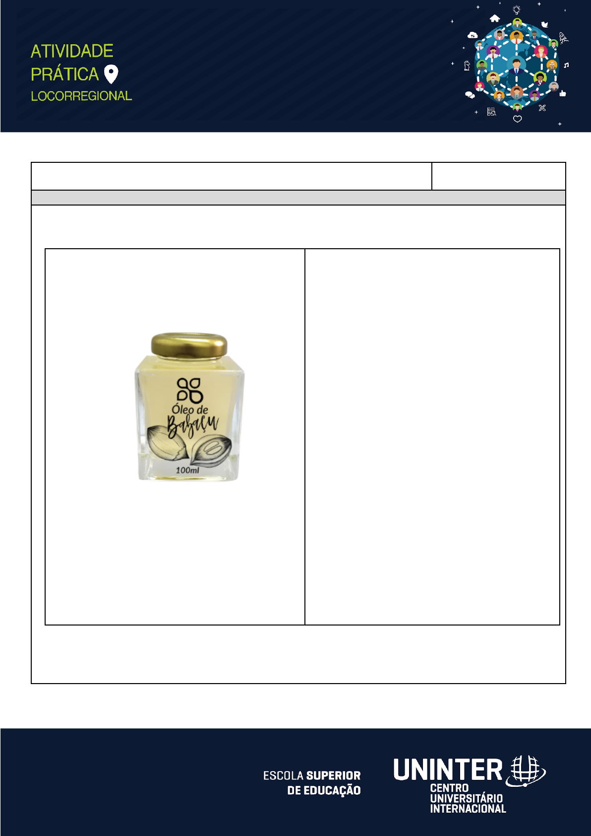 TEMPLATE – ATIVIDADE PRÁTICA LOCORREGIONAL DE COSMETOLOGIA Estudante: Juliana Gonçalves Costa RU: 4109114 Texto-resposta 1) Apresente uma imagem da matéria prima regional a ser utilizada e explique os seus benefícios, citando as propriedades terapêuticas que a matéria apresenta; O babaçu é uma palmeira nativa da região Nordeste do Brasil, cujos frutos são ricos em óleo, conhecido como óleo de babaçu. Este óleo é altamente valorizado em cosmetologia por suas propriedades emolientes, hidratantes e nutritivas. Propriedades Terapêuticas: ● Hidratante: O óleo de babaçu tem uma textura leve que facilita a absorção pela pele, proporcionando hidratação sem deixar a pele oleosa. ● Antioxidante: Contém vitamina E, que ajuda a combater os radicais livres, prevenindo o envelhecimento da pele. ● Antifúngico: Ação antifúngica que pode auxiliar em problemas de pele comomicoses. ● Anti-inflamatório: Possui propriedades que ajudam na redução de inflamações, benéficas para peles sensíveis. 2) Cite 3 cosméticos que podem ser formulados utilizando a fruta ou vegetal em questão; 1. Hidratante Corporal de Babaçu ● Ingredientes: 100ml de óleo de babaçu ○ 50ml de manteiga de karité ○ 10 gotas de óleo essencial de lavanda ○ 10ml de óleo de amêndoas ● Passo a Passo: ○ Em um banho-maria, derreta a manteiga de karité. ○ Retire do fogo e adicione o óleo de babaçu e o óleo de amêndoas. ○ Misture bem até a mistura ficar homogênea. ○ Adicione o óleo essencial de lavanda e misture novamente. ○ Despeje em um frasco de vidro e deixe esfriar. ● Função: Hidratação profunda da pele, indicada para uso diário após o banho. Benefícios: nutrição intensa, alívio para peles secas e relaxamento. 2. Sabonete Líquido de Babaçu ● Ingredientes: ○ 200ml de óleo de babaçu ○ 100ml de água destilada ○ 30g de base para sabonete líquido ○ 10ml de glicerina vegetal ○ 5 gotas de óleo essencial de laranja ● Passo a Passo: ○ Em um recipiente, misture a base para sabonete líquido com a água destilada. ○ Com amistura homogênea, adicione o óleo de babaçu e a glicerina. ○ Finalmente, adicione o óleo essencial de laranja e misture bem. ○ Transfira para um frasco de sabonete líquido. ● Função: Limpeza suave da pele, ideal para todos os tipos de pele. Benefícios: propriedades hidratantes, fácil de usar e evita ressecamento. 3. Máscara Facial de Babaçu e Argila ● Ingredientes: ○ 50g de argila verde ○ 30ml de óleo de babaçu ○ 10ml de água de rosas ○ 10 gotas de óleo essencial de Tea tree (melaleuca) ● Passo a Passo: ○ Em uma tigela, misture a argila verde com o óleo de babaçu e a água de rosas até formar uma pasta homogênea. ○ Adicione o óleo essencial de Tea tree e misture bem. ○ Armazene em um recipiente hermético. ● Função: Limpeza e purificação da pele. Benefícios: desintoxicação, controle da oleosidade e promoção de uma pele mais saudável e radiante. 3) Crie uma embalagem para a disponibilização dos cosméticos, pensando em uma apresentação sustentável; Proposta: Utilizar frascos de vidro reciclável com rótulos de papel reciclado. Para o sabonete, um frasco com dispensador que minimiza o desperdício. Os frascos podem ter uma tampa de bambu, que é um recurso sustentável e esteticamente agradável. 4) Apresenta uma tabela contendo todos os valores necessários para preparar os seus produtos, chegando ao valor final para a produção de cada um. Ingredientes | Custo por Unidade | Quantidade Usada | Custo Total| | Óleo de Babaçu | R$ 50,00/litro | 0,3 litro | R$ 15,00 | | Manteiga de Karité | R$ 30,00/100g | 50g | R$ 15,00 | | Óleo essencial de lavanda | R$ 20,00/10ml | 10 gotas (1,5ml) | R$ 3,00 | | Óleo de Amêndoas | R$ 40,00/100ml | 10ml | R$ 4,00 | | Base para sabonete líquido | R$ 25,00/100g | 30g | R$ 7,50 | | Glicerina Vegetal | R$ 15,00/100ml | 10ml | R$ 1,50 | | Água de Rosas 10,00/100ml | 10ml | R$ 1,00 | | Argila Verde | R$ 15,00/500g | 50g | R$ 1,50 | | Óleo essencial de tea tree | R$ 20,00/10ml | 10 gotas (1,5ml) | R$ 3,00 | | Frascos de vidro | R$ 5,00/unidade | 3 unidades | R$ 15,00 | | Rótulos de papel reciclado | R$ 2,00/unidade | 3 unidades | R$ 6,00 | Resumo dos Custos: ● Hidratante Corporal: R$ 38,50 ● Sabonete Líquido: R$ 22,50 ● Máscara Facial: R$ 10,50 Valor Final para Produção de Cada Produto: ● Hidratante Corporal: R$ 38,50 ● Sabonete Líquido: R$ 22,50 ● Máscara Facial: R$ 10,50 Total para produção de todos os cosméticos: R$ 71,50 Essas propostas oferecem alternativas de cosméticos naturais, explorando a riqueza das matérias-primas regionais e promovendo a sustentabilidade e o cuidado com a saúde da pele.