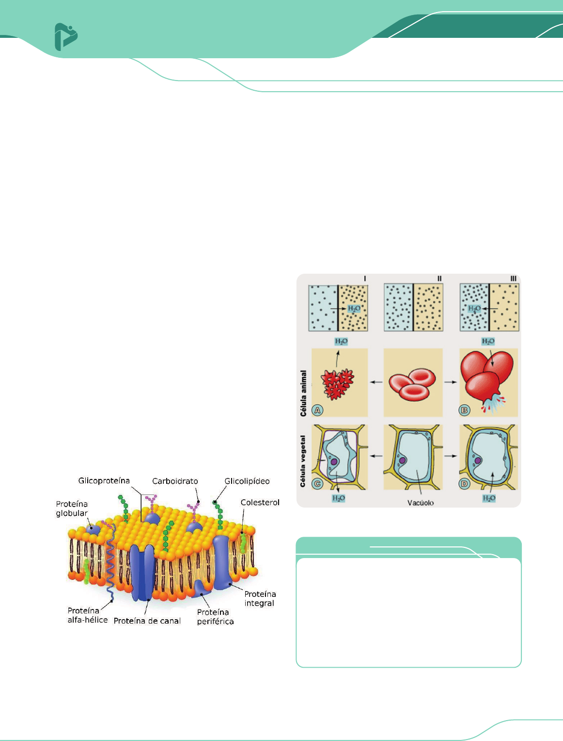 BIOLOGIA I PROMEDICINA 1SISTEMA PRODÍGIO DE ENSINO ORGANELAS MEMBRANOSAS INTRODUÇÃO DE MEMBRANA PLASMÁTICA Aprendemos no módulo anterior que a célula é uma estrutura complexa que contém em seu interior diversas organelas que exercem funções fundamentais para a manutenção da vida. Toda célula, independente do tipo de ser vivo, possui uma membrana plasmática que delimita e protege o interior da célula. Por meio dessa membrana atravessam substâncias para o interior ou exterior, permitindo, assim, a interação da célula com o meio externo. Dependendo do tipo de célula, podemos encontrar adaptações específicas da membrana relacionadas à função da célula. É na membrana também que se encontram proteínas que ajudam no reconhecimento celular, fundamental para o sistema imunológico do indivíduo. Vamos saber mais sobre a composição da membrana, as formas de transporte, as estruturas especializadas e os mecanismos de comunicação abaixo. MEMBRANA PLASMÁTICA É a membrana que delimita as células procarióticas e eucarióticas, estabelecendo a fronteira entre o meio intracelular, o citoplasma e o meio extracelular. Ela foi observada apenas após a descoberta do microscópio eletrônico. A membrana plasmática possui uma permeabilidade seletiva, controlando o que entra e sai dela, além de inúmeras especializações, como microvilosidades, interdigitações, desmossomos etc. CONSTITUIÇÃO DA MEMBRANA PLASMÁTICA A membrana plasmática segue o modelo do Mosaico Fluido (1972) proposto por Singer e Nicholson, no qual a membrana se assemelha a um mosaico constituído de proteínas e lipídios. A membrana plasmática é constituída de uma dupla camada fosfolipídica, que possui uma região hidrofóbica (apolar) voltada para dentro e uma região hidrofílica (polar) voltada para o meio extracelular, colesterol, proteínas e carboidratos. https://www.infoescola.com/citologia/membrana-plasmatica/ TRANSPORTE PELA MEMBRANA As substâncias podem atravessar a membrana plasmática sem gasto de energia (transporte passivo) ou gastando energia (transporte ativo). TRANSPORTE PASSIVO • Ocorre sem gasto de energia; • A favor do gradiente de concentração; • Tende a manter a igualdade entre os meios; • Classificam-se em: osmose e difusão. OSMOSE Passagem do solvente (água), do meio hipotônico (menos concentrado) para o meio hipertônico (mais concentrado). http://professormaiconbio.blogspot.com/2015/04/tema-osmose- turma-1-perioro-de-ciencias.html • A hemácia na situação A está perdendo água e murchando, logo, dizemos que ela sofreu crenação. Já quando uma célula vegetal ou célula animal perde água e murcha, chamamos de plasmólise, como ocorre na situação C. • A hemácia na situação B está ganhando água e inchando, ficando túrgida até se romper, processo este chamado de hemólise. A célula vegetal não sofre ruptura (plasmoptise) devido à presença da parede celular, como mostra a situação D. PROEXPLICA PROMEDICINASISTEMA PRODÍGIO DE ENSINO2 BIOLOGIA I ORGANELAS MEMBRANOSAS DIFUSÃO Passagem do soluto do meio hipertônico para o meio hipotônico. Essa passagem pode ser simples (através dos poros da membrana plasmática) ou facilitada (através de proteínas) carreadoras. • Simples: passagem do soluto através dos poros da membrana plasmática. https://cursoenemgratuito.com.br/osmose-difusao/ • Facilitada: passagem do soluto sendo facilitada por uma proteína. https://wikiciencias.casadasciencias.org/wiki/index.php/Difus%C3%A3o_Facilitada TRANSPORTE ATIVO • Ocorre com gasto de energia; • Contra o gradiente de concentração, ou seja, o soluto sai do meio hipotônico para o meio hipertônico; • Mantém a desigualdade entre os meios. Exemplo: Bomba de sódio e potássio e bomba de cálcio. https://planetabiologia.com/transporte-ativo-tipos-exemplos-resumo/ Os íons sódio e potássio encontram-se em concentrações diferentes no meio intracelular e extracelular dos axônios. O potássio encontra-se em maior concentração no meio intracelular do que em relação ao meio extracelular, logo, esse íon sairá da célula por difusão, e a bomba de sódio será encarregada de colocar o potássio de volta no interior da célula. Já o sódio encontra-se em maior concentração no meio extracelular em relação ao meio intracelular, logo, esse íon entrará na célula por difusão e será retirado por transporte ativo. A cada três íons de sódio que saem por transporte ativo entram dois íons de potássio. PROEXPLICA ESPECIALIZAÇÕES DA MEMBRANA PLASMÁTICA • Microvilosidades: São dobras na membrana plasmática que aumentam a superfície de contato e, consequentemente, aumentam a absorção de nutrientes. http://www.medicina-integrada.com/o-que-e-o-sip-sindrome-do-intestino- permeavel/epithelial-cells/ • Desmossomos: São estruturas formadas pelas membranas de duas células adjacentes. Aumentam a adesão entre as células, formando um revestimento contínuo. https://s3.amazonaws.com/ead_casa/ead_casa/ead_casa/CursoSecaoItem/5158- membranas-biologicas-enrico-blota.pdf PROMEDICINA SISTEMA PRODÍGIO DE ENSINO ORGANELAS MEMBRANOSAS 3 BIOLOGIA I • Interdigitações: São dobras nas membranas plasmáticas limítrofes de duas células. Estão relacionadas ao grau de adesão das células. http://www.educacional.com.br/upload/dados/materialapoio/60080001/3341254/ ENVOLT%C3%93RIO%20CELULAR%202.pdf • Plasmodesmos: São canais responsáveis pela conexão citoplasmática entre células vegetais vizinhas, possibilitando a troca de moléculas de informação, funcionais e estruturais. http://cienciasdavidaedaterra25.blogspot.com/2012/01/plasmodesmos.html Você já reparou que a alface após ser temperada com sal fi ca com a aparência de murcha mais rápido do que a alface que não foi temperada? Isso ocorre devido ao processo de osmose. A água no interior da alface sai para o meio externo, que está mais concentrado de sais. SAIBA ANOTAÇÕES