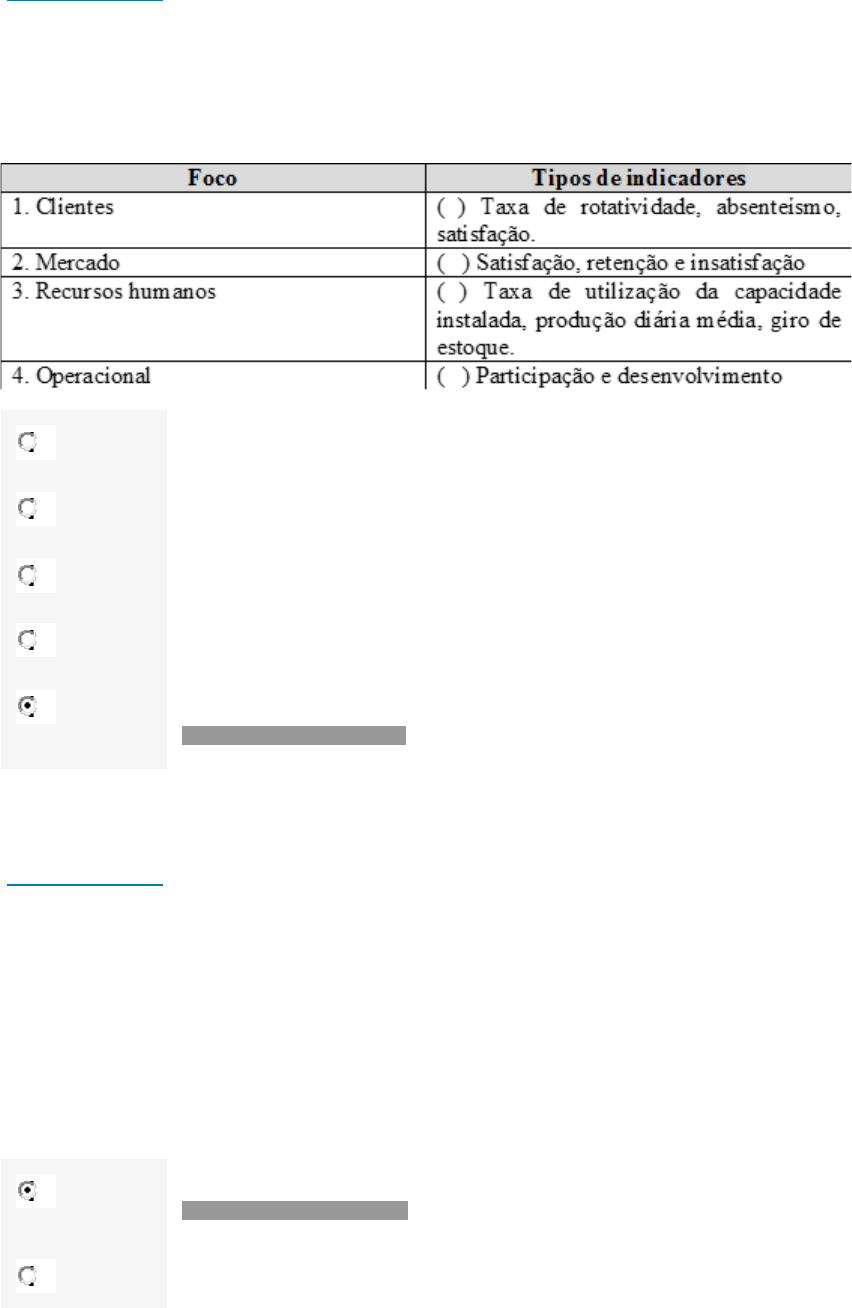 Questão 1/10 - Administração Estratégica Ler em voz alta Tradicionalmente, mede-se o desempenho organizacional por meio da comparação dos resultados com os objetivos estabelecidos ou com os padrões de competitividade. Para avaliarmos esses resultados, dependemos de indicadores, ou seja, de algo para efetivamente fazermos a medição. Análise a tabela abaixo e relacione a primeira coluna de competências “Foco” com a segunda coluna de competências “Tipos de indicadores” assinalando a alternativa correta. A 4,3,1 e 2. B 2,1,3,e 4. C 1,3,2 e 4 . D 3,2,1 e 4. E 3,1,4, e 2. Você assinalou essa alternativa (E) Questão 2/10 - Administração Estratégica Ler em voz alta Kaplan e Norton propõe uma nova ferramenta que, segundo eles, tem potencial de ser um sistema de gestão estratégica. Tal sistema auxiliaria a estabelecer o consenso em relação a estratégia, comunicar a estratégia a toda a empresa, alinhar as metas departamentais e pessoais à estratégia , associar os objetivos estratégicos com as metas de longo prazo e os orçamentos anuais, identificar e preparar iniciativas estratégicas e realizar revisões estratégicas. Seu objetivo principal é a comunicação da estratégia para toda a organização, de forma clara, e também a avaliação da estratégia com base nas quatro perspectivas (a financeira, a dos clientes, a dos processos internos e as do aprendizado e do crescimento). Adaptado de SERTEK et. al., 2012, p. 216 Assinale a alternativa que apresenta, corretamente, a ferramenta desenvolvida por Kaplan e Norton. A Balanced scorecard Você assinalou essa alternativa (A) B Matriz SWOT C Sistema de indicadores do tipo taxa D Benchmarking E Matriz BCG Questão 3/10 - Administração Estratégica Ler em voz alta Nos últimos anos, poucas teorias ligadas à administração fizeram tanto sucesso e provocaram tantas dúvidas como o balanced scorecard. Criado pela dupla de consultores americanos David Norton e Robert Kaplan, o BSC, como é mais conhecido, é uma ferramenta para medir até que ponto uma estratégia empresarial se transforma em resultado. Relacionado ao escopo do balance Scorecard - BSC analise as sentenças a seguir, assinalando V para as afirmativas verdadeiras e F para as afirmativas falsas. ( ) As quatro perspectivas do BSC são: Financeira, Clientes, Processos Externos e Aprendizado e Crescimento, que traduzem os objetivos da organização em indicadores e planos de ação/iniciativas. ( ) Alguns exemplos de indicadores dentro da perspectiva de clientes podem ser: fatia de mercado, custo de manutenção de clientes, eficácia geral dos equipamentos, taxa de satisfação, índice de perda de clientes. ( ) No processo de aprendizado se almeja construir as competências necessárias junto aos colaboradores, reduzir a rotatividade e manter um bom clima organizacional ( ) Alguns exemplos de indicadores da perspectiva financeira podem ser: receita gerada por novos produtos e/ou serviços, retorno sobre o valor dos ativos, taxa de redução de custos, custos unitários. Marque a sequência correta: A V, F, F, V B V, V, F, V C F, F, V, F D F, V, V, F E F, F, V, V Você assinalou essa alternativa (E) Questão 4/10 - Administração Estratégica Ler em voz alta Kaplan e Norton desenvolveram a ferramenta de Mapas Estratégicos, traduzindo a ideia de criar um sistema de gestão estratégica que visa expressar a missão/visão e a estratégia em um conjunto de perspectivas: a financeira, a do cliente, a dos processos internos e a de aprendizagem e crescimento. Assinale a alternativa que apresenta, corretamente, qual dessas perspectivas está sendo descrita no enunciado a seguir. “Essa perspectiva privilegia a análise de indicadores focada no crescimento e na capacidade da organização em criar e agregar valor pela análise de processos, procedimentos e acesso à informação necessária, a fim de atingir as estratégias do negócio.” A Perspectiva financeira B Perspectiva do cliente C Perspectiva de processos internos D Perspectiva de aprendizagem e crescimento Você assinalou essa alternativa (D) E Perspectiva contábil Questão 5/10 - Administração Estratégica Ler em voz alta Kaplan e Norton desenvolveram a ferramenta de Mapas Estratégicos, traduzindo a ideia de criar um sistema de gestão estratégica que visa expressar a missão/visão e a estratégia em um conjunto de perspectivas: a financeira, a do cliente, a dos processos internos e a de aprendizagem e crescimento. Assinale a alternativa que apresenta, corretamente, qual dessas perspectivas está sendo descrita a seguir. “Refere-se à maneira pela qual os sócios ou os avalistas avaliam a lucratividade e o retorno financeiro do negócio.” Você não pontuou essa questão A Perspectiva financeira B Perspectiva do cliente C Perspectiva de processos internos Você assinalou essa alternativa (C) D Perspectiva de aprendizagem e crescimento E Perspectiva do produto Questão 6/10 - Administração Estratégica Ler em voz alta A figura abaixo demonstra como funciona um mapa estratégico associado ao Balanced Scorecard, traduzindo a estratégia em objetivos, indicadores, metas e planos de ação. Considerando as informações da figura, avalie as asserções a seguir e a relação proposta entre elas I. Para Kaplan e Norton (2004) a estratégia equilibra forças contraditórias. Os investimentos em ativos intangíveis (pessoas, informação e conhecimento) para aumentar a receita a longo prazo não raro conflitam com o corte de custos para melhorar o desempenho financeiro de curto prazo PORQUE II. No curto prazo o investimento em treinamento e capacitação da mão-de-obra pode ser considerados um custo, porém no longo prazo representam um investimento que pode trazer bons resultados a organização. A respeito dessas asserções, assinale a opção correta A As asserções I e II são proposições verdadeiras, e a II é uma justificativa correta da I. Você assinalou essa alternativa (A) B As
