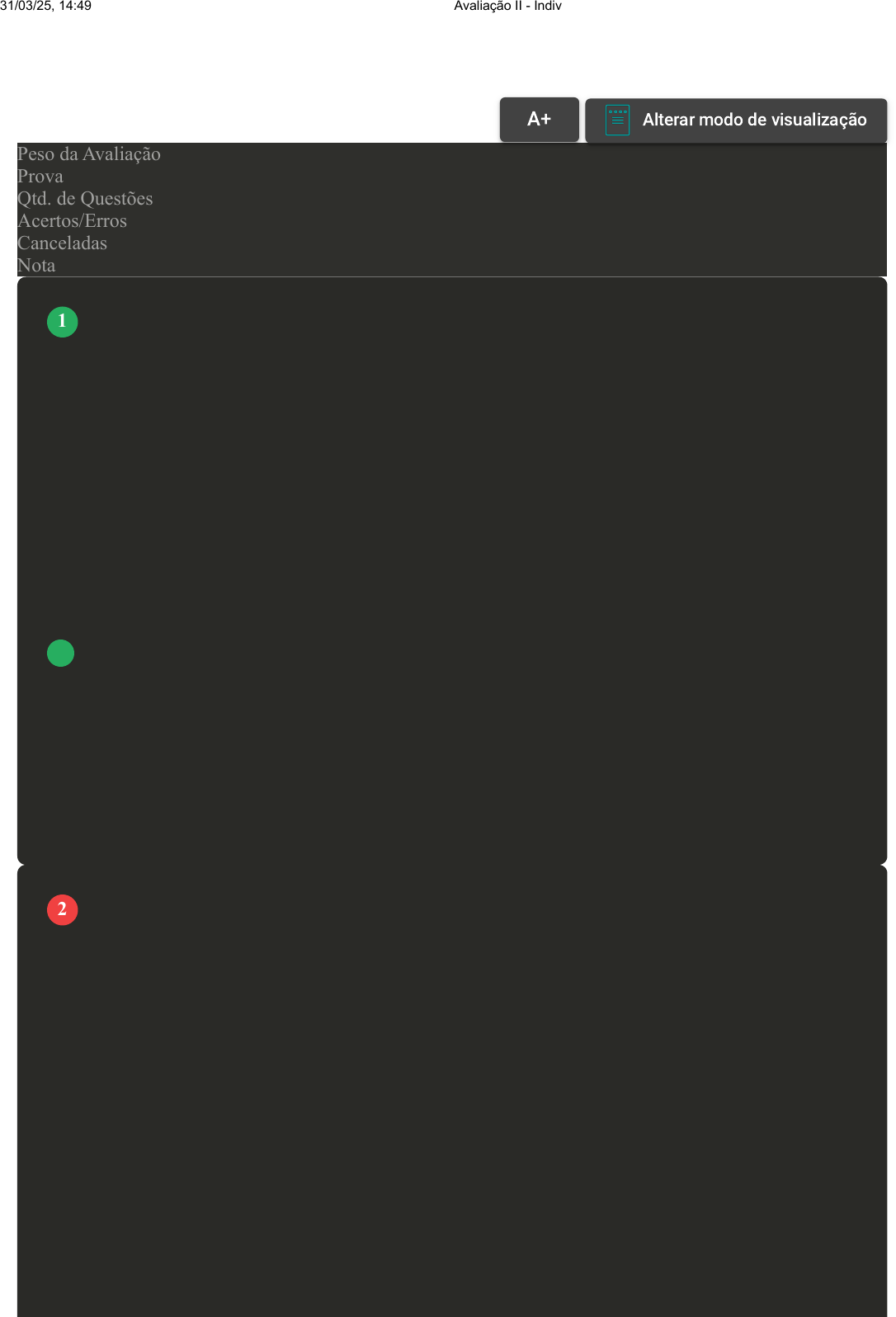Prova Impressa GABARITO | Avaliação II - Individual (Cod.:823684) Peso da Avaliação 1,50 Prova 65791780 Qtd. de Questões 10 Acertos/Erros 7/1 Canceladas 2 Nota 9,00 As funções inorgânicas denominadas ácidos podem ser nomeadas segundo as regras internacionais de nomenclatura da IUPAC (UNIÃO INTERNACIONAL DE QUÍMICA PURA E APLICADA). Com relação à nomenclatura dos ácidos, segundo a IUPAC, associe os itens, utilizando o código a seguir: I- HCl. II- HCN. III- HClO. ( ) Ácido hipocloroso. ( ) Ácido clorídrico. ( ) Ácido cianídrico. Agora, assinale a alternativa que apresenta a sequência CORRETA: A III - I - II. B II - I - III. C I - III - II. D I - II - III. As bases ou hidróxidos são funções inorgânicas que apresentam valores de pH que variam entre oito e quatorze. Esses compostos básicos também são chamados de alcalinos. Alimentos alcalinos são usados para restaurar o equilíbrio do pH do sangue, evitar o acúmulo de peso, proteger ossos e músculos e garantir a disposição. Com relação as bases, avalie as asserções a seguir e a relação proposta entre elas: I- As bases possuem diversas aplicações no cotidiano. Dependendo da base, pode ser utilizada para limpeza pesada, fabricação de papel, tratamento de efluentes, em inseticidas, fungicidas ou na redução da acidez do solo, fabricação de sabões, usada também como laxante e antiácido e muitas outras aplicações. PORQUE II- As bases são formadas pela combinação de um cátion e um ânion, sendo esse ânion unicamente a hidroxila. Cátions e ânions são íons que necessitam ganhar ou perder elétrons para adquirirem a estabilidade. Isso acontece através das ligações químicas. Assinale a alternativa CORRETA: VOLTAR A+ Alterar modo de visualização 1 2 31/03/25, 14:49 Avaliação II - Individual about:blank 1/5 A As asserções I e II são proposições verdadeiras, sendo a II uma justificativa da I. B As asserções I e II são proposições verdadeiras, no entanto, a II não é uma justificativa da I. C As asserções I e II são proposições falsas. D A asserção I é uma proposição verdadeira, e a II é uma proposição falsa. O suco gástrico é formado basicamente por água, ácido clorídrico e enzimas digestivas. Seu pH varia entre 1,5 e 2, no entanto, alguns fatores como alimentação, tensão nervosa e doenças podem aumentar a quantidade de HCl no estômago, o que diminui ainda mais o pH, o que pode dar azia ou evoluir para gastrite e até mesmo úlceras. Sobre uma forma de tratar os primeiros sintomas da azia, assinale a alternativa CORRETA: A Tomar leite de magnésia, que é o nome popular da suspensão aquosa de hidróxido de magnésio. B A neutralização desse meio ácido com bases, principalmente com o hidróxido de sódio puro. C A neutralização do HCl com uma solução de cloreto de sódio concentrada. D Tomar vinagre diluído em água. As bases ou hidróxidos são compostos que apresentam pH alcalino e inúmeras utilizações em nosso cotidiano, como antiácidos estomacais, por exemplo. Com relação ao exposto, classifique V para as sentenças verdadeiras e F para as falsas: ( ) As monobases apresentam o valor de pH = 1. ( ) O hidróxido ferroso é classificado como uma dibase. ( ) Na presença de fenolftaleína, apresentam cor rosa/vermelha. ( ) As bases reagem com ácidos e formam um sal + óxido. Assinale a alternativa que apresenta a sequência CORRETA: A V - F - F - V. B V - F - V - F. C F - V - F - V. D F - V - V - F. Muitas funções inorgânicas estão presentes em nosso dia a dia e podem ser observadas nos mais diversos lugares, como as funções inorgânicas óxidos, que podem ser encontrados na areia, nos gases atmosféricos, na ferrugem dos metais etc. Com relação aos óxidos, associe os itens, utilizando o código a seguir: Revisar Conteúdo do Livro 3 4 5 31/03/25, 14:49 Avaliação II - Individual about:blank 2/5 I- São compostos binários. II- Óxidos anfóteros. III- Óxidos básicos. ( ) Os óxidos são funções inorgânicas formadas por apenas dois elementos. ( ) Reagem com água, produzindo uma base ou reagem com um ácido formando sal e água. ( ) São os óxidos que podem se comportar tanto como óxido básico como óxido ácido. Agora, assinale a alternativa que apresenta a sequência CORRETA: A II - III - I. B III - I - II. C I - II - III. D I - III - II. Atenção: Esta questão foi cancelada, porém a pontuação foi considerada. Uma reação química significa uma transformação de substâncias em outras. A reação química é representada por equações, que descrevem como as reações acontecem, como os reagentes se transforam em produtos. Considerando a equação química a seguir, assinale a alternativa CORRETA que apresenta os reagentes e os produtos que pertencem, respectivamente, às funções: N2O5 + 2NaOH → 2NaNO3 + H2O A Sal, base, sal e hidreto. B Ácido, base, sal e água. C Óxido, base, sal e óxido. D Óxido, base, sal e água. [Laboratório Virtual – Ensaio de Chamas] Cada cátion presente em cada solução disponível no laboratório virtual do ensaio de chamas apresenta uma coloração diferente. Ao testar a solução de cloreto de lítio (LiCl), a coloração característica do cátion Li+ é apresentada. Sobre a coloração observada para este cátion, assinale a alternativa CORRETA: A Vermelho. B Verde. C Violeta. D Azul. 6 7 31/03/25, 14:49 Avaliação II - Individual about:blank 3/5 As funções a seguir pertencem às funções inorgânicas sais e base ou hidróxido, respectivamente, e, desta forma, recebem nomenclaturas específicas a sua função inorgânica, que são determinadas pela União Internacional de Química Pura e Aplicada (IUPAC). Com relação à nomenclatura das funções inorgânicas representadas, assinale a alternativa CORRETA: A Bromato de cobalto I - nitroso de cálcio - hidróxido auroso. B Bromato de cobre - nitrito de cálcio - hidróxido de ouro I. C Brometo de cobalto II - nitra