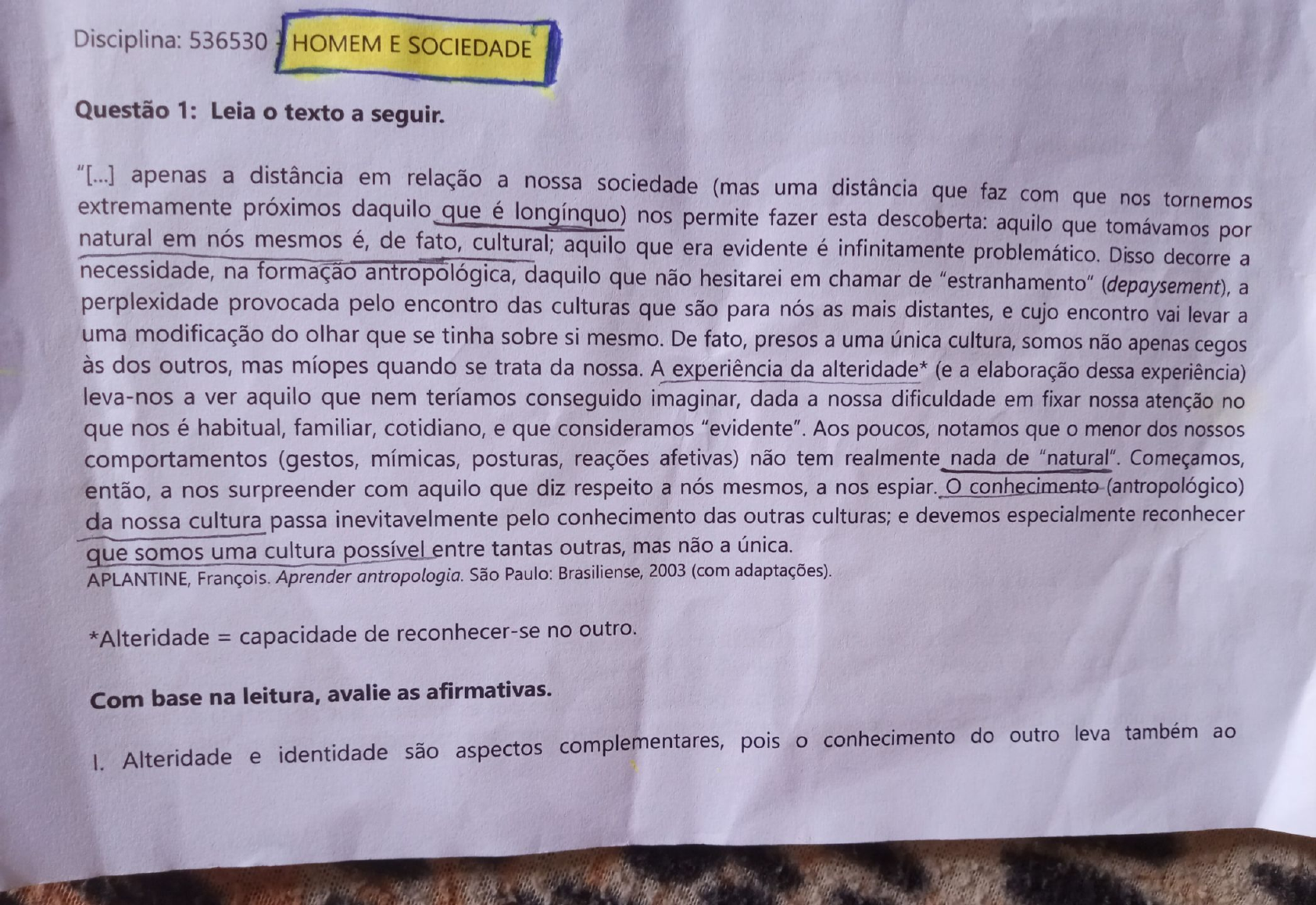 Disciplina: 536530 HOMEM E SOCIEDADE Questão 1: Leia o texto a seguir. "[...] apenas a distância em relação a nossa sociedade (mas uma distância que faz com que nos tornemos extremamente próximos daquilo que é longínquo) nos permite fazer esta descoberta: aquilo que tomávamos por natural em nós mesmos é, de fato, cultural; aquilo que era evidente é infinitamente problemático. Disso decorre necessidade, na formação antropológica, daquilo que não hesitarei em chamar de "estranhamento" (depaysement), a a perplexidade provocada pelo encontro das culturas que são para nós as mais distantes, e cujo encontro vai levar a uma modificação do olhar que se tinha sobre si mesmo. De fato, presos a uma única cultura, somos não apenas cegos às dos outros, mas míopes quando se trata da nossa. A experiência da alteridade* (e a elaboração dessa experiência) leva-nos a ver aquilo que nem teríamos conseguido imaginar, dada a nossa dificuldade em fixar nossa atenção no que nos é habitual, familiar, cotidiano, e que consideramos "evidente". Aos poucos, notamos que o menor dos nossos comportamentos (gestos, mímicas, posturas, reações afetivas) não tem realmente nada de "natural". Começamos, então, a nos surpreender com aquilo que diz respeito a nós mesmos, a nos espiar. da nossa cultura passa inevitavelmente pelo conhecimento das outras culturas; e devemos especialmente reconhecer que somos uma cultura possível entre tantas outras, mas não a única. APLANTINE, François. Aprender antropologia. São Paulo: Brasiliense, 2003 (com adaptações). *Alteridade = capacidade de reconhecer-se no outro. Com base na leitura, avalie as afirmativas. 1. Alteridade e identidade são aspectos complementares, pois o conhecimento do outro leva também aoconhecimento da própria cultura. estranhamento que sentimos com culturas diferentes da nossa contribui para a percepção de que os nossos comportamentos não são "naturais". III. encontro com culturas longínquas é problemático, uma vez que elas são estranhas e, muitas vezes, Assinale a alternativa correta. A) Nenhuma afirmativa é correta. B) Todas as afirmativas são corretas. C) Apenas as afirmativas e III são corretas. D) Apenas as afirmativas I e são corretas E) Apenas a afirmativa é correta. Questão 2: Leia o texto a seguir. "O antropólogo Claude Lévi-Strauss estudou o "pensamento selvagem" para mostrar que os chamados selvagens não são são atrasados nem primitivos, mas operam com o pensamento mítico. mito e o rito, escreve Lévi-Strauss, não lendas nem fabulações, mas uma organização da realidade a partir da experiência sensível enquanto tal. [...] mito tem, assim, três características principais, citadas a seguir. 1. Função explicativa: o presente é explicado por alguma ação passada cujos efeitos permaneceram no foram Por exemplo, uma constelação existe porque, no passado, crianças fugitivas e famintas morreram na floresta e levadas ao céu por uma deusa que as transformou em estrelas; as chuvas existem porque, nos tempos passados, uma deusa apaixonou-se por um humano e, não podendo unir-se a ele diretamente, uniu-se pela tristeza, fazendo suas 2. Função organizativa: o mito organiza as relações sociais (de parentesco, de alianças, de trocas, de sexo, de idade, lágrimas sobre o mundo etc. de poder etc.) de modo a legitimar e garantir a permanência de um sistema complexo todas de proibições sociedades e selvagens permissões. e as Por exemplo, um mito como o de Édipo existe (com sem narrativas a qual o sistema diferentes) sociopolítico, em quase baseado nas leis de parentesco e tem a função de garantir a proibição do incesto, de alianças, não pode ser mantido. Função compensatória: o mito narra uma situação passada, que é a negação do presente e que serve no tanto para de 3. compensar os humanos de alguma perda como para garantir-lhes que um erro passado foi corrigido presente, modo a oferecer uma visão estabilizada e regularizada da Natureza e da vida comunitária." CHAUÍ, M. Convite à filosofia. São Paulo: Ática, 1994 (com adaptações). Com base na leitura e em seus conhecimentos, analise as afirmativas a seguir: A proibição do incesto indica que, em determinado momento da nossa história, definiu-se a noção de família e de parentesco. pensamento mítico, que exerce as funções explicativa, organizativa e compensatória de forma irracional, não faz parte III. A abordagem de Lévi-Strauss apresenta base eurocêntrica porque hierarquiza as sociedades de acordo com a sua da cultura de um povo. evolução científica e cultural, desvalorizando o pensamento mítico. É correto o que se afirma apenas em: A) (A) B) II. C) III. D) e Questão 3: Leia o texto a seguir. em São Paulo, atrai turistas do mundo inteiro. A região parques é conhecida e construções por abrigar características a maior "O comunidade bairro da japonesa Liberdade, do mundo fora do Japão. Além das disso, feiras, que restaurantes, passam por este bairro que se destaca no centro e da arquitetura asiática também chamam o que pouca a atenção gente sabe pessoas é que a região antes era habitada pela comunidade negraque, ao longo das últimas décadas, parte dessa foi ocultada Nos últimos anos, alguns episódios que ocorreram na Liberdade trouxeram à tona o debate da região. De acordo com o jornalista e pesquisador Abilio Ferreira, sobre o multiculturalismo acontecimentos começou em 2016, quando o cantor Letra escreveu que estuda a região, esta cadeia de que fala sobre a história da No mesmo ano de lançamento da canção, uma Conselho música chamada "Rua da do Patrimônio Histórico, Cultural e Ambiental da Cidade de São Paulo (Conpresp) o iniciou Municipal de Preservação da paisagem local. patrimonial do bairro, Segundo a entidade, a decisão é uma forma de preservar a dimensão o processo sociocultural de tombamento da história e Dois anos depois, em 2018, um empresário demo