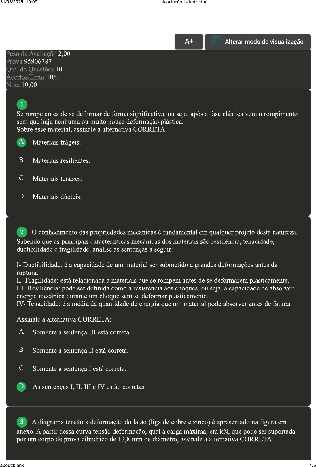 31/03/2025, 19:09 Avaliação Individual A+ Alterar modo de visualização Peso da Avaliação 2,00 Prova 95906787 Qtd. de Questões 10 Acertos/Erros 10/0 Nota 10,00 1 Se rompe antes de se deformar de forma significativa, ou seja, após a fase elástica vem rompimento sem que haja nenhuma ou muito pouca deformação plástica. Sobre esse material, assinale a alternativa CORRETA: A Materiais frágeis. B Materiais resilientes. C Materiais tenazes. D Materiais dúcteis. 2 O conhecimento das propriedades mecânicas é fundamental em qualquer projeto desta natureza. Sabendo que as principais características mecânicas dos materiais são resiliência, tenacidade. ductibilidade e fragilidade, analise as sentenças a seguir: I- Ductibilidade: é a capacidade de um material ser submetido a grandes deformações antes da ruptura. II- Fragilidade: está relacionada a materiais que se rompem antes de se deformarem plasticamente. III- Resiliência: pode ser definida como a resistência aos choques, ou seja, a capacidade de absorver energia mecânica durante um choque sem se deformar plasticamente. Tenacidade: é a média da quantidade de energia que um material pode absorver antes de faturar. Assinale a alternativa CORRETA: A Somente a sentença III está correta. B Somente a sentença II está correta. C Somente a sentença I está correta. D As sentenças I, II, III e IV estão corretas. 3 A diagrama tensão X deformação do latão (liga de cobre e zinco) é apresentado na figura em anexo. A partir dessa curva tensão deformação qual a carga máxima, em kN, que pode ser suportada por um corpo de prova cilíndrico de 12,8 mm de diâmetro, assinale a alternativa CORRETA: about:blank 1/51/03/2025, 19:09 Avaliação Individual FONTE: CALLISTER, William RETHWISCH, David G. Materials science and engineering: an Stress (MPa) 500 Tensile strength 450 MPa 400 A MPa 40 300 200 30 Yield strength 200 250 MPa (36,000 psi) 20 100 10 100 o 0 0.005 0 0,10 introduction. New York: Wiley, 2018. p. 165. Strain A 57,9. B 250. C 231,6. D 450. 4 Muitos materiais apresentam comportamentos distintos quando sujeitos a esforços mecânicos. Dependendo da intensidade do carregamento, poderá apresentar um comportamento linear ou Com base no exposto, classifique V para as sentenças verdadeiras e F para as falsas: ( ) Durante O comportamento elástico de um material que recebe um carregamento, este resulta em deformação, mas que quando é retirada essa carga material retorna ao seu estado inicial. ( ) Quando material recebe um segundo carregamento, após uma deformação plástica, seu limite elástico apresentará valores menores ao inicial. ( ) Se material atingir escoamento e a carga for retirada, sofrerá uma deformação permanente, mesmo após a retirada da carga aplicada. Assinale a alternativa que apresenta a sequência CORRETA: A B C D 5 Consiste em uma aplicação da lei de Hooke à resistência dos materiais, relacionando tensão X deformação. Sobre exposto, assinale a alternativa CORRETA:31/03/2025, 19:09 Avaliação Individual A Força tangencial. B Carga intermitente. C Força normal. D Módulo de elasticidade. 6 Os esforços internos solicitantes são os que atuam no corpo de uma estrutura no seu ponto interno. É possível compreender as forças atuantes de um corpo é desenhar diagrama de corpo livre. Sobre os tipos de esforços que atuam em um corpo, associe os itens, utilizando código a seguir: I- Esforço Normal. II- Força de cisalhamento. III- Momento fletor. ( ) Está contida no plano da seção, ou seja, tende de realizar movimento de deslizamento entre uma seção e outra. ) Tende a realizar uma rotação na seção de um eixo no seu próprio plano, ou seja, momento contido em um plano perpendicular ao plano de ação ( ) Atua perpendicular ao plano da seção, ou seja, promove separação das permanecendo paralelas uma à outra. Assinale a alternativa que apresenta a sequência CORRETA: A II I - III. B C II III. D 7 O conhecimento das propriedades mecânicas é vital para que um engenheiro, ou profissional especializado, possa tomar a decisão acertada a respeito dos materiais utilizados em um determinado projeto. Neste contexto, analisando gráfico em anexo, assinale a alternativa CORRETA: about:blank 3/531/03/2025, 19:09 Avaliação Individual FONTE: SHACKELFORD, James F. Introduction to materials science for engineers. Upper Saddle Stress 3 2 1 4 Strain River: Pearson, 2016. p. 155 A O número 5 representa a resiliência do material. B Os números 2 e 3 respectivamente, a tensão máxima e a tensão de ruptura. C O número 4 diz respeito à ductibilidade do material. D O número 1 é conhecido como limite de proporcionalidade. 8 Robert Hooke (1635-1703) foi um cientista inglês que definiu, através de um experimento com molas, uma equação que hoje conhecemos com a Lei de Hooke, a qual descreve a relação linear entre a força e a deformação de um corpo. De acordo com esta lei, analise as sentenças a seguir: I- A tensão e a deformação são diretamente proporcionais quando atuam dentro do limite de proporcionalidade. II- O módulo de elasticidade indica quanto um material resiste à deformação, ou seja, a sua rigidez. III- O coeficiente que define a proporcionalidade entre tensão e deformação, na Lei de é conhecido como coeficiente de Poisson. Assinale a alternativa CORRETA: A As sentenças II e III estão corretas. B As sentenças I e II estão corretas. C As sentenças I e III estão corretas. D Somente a sentença I está correta. 9 Palavras como ductilidade e fragilidade são muito utilizadas na área da resistência dos materiais. Portanto, é de suma importância entendimento desses termos. Sobre os materiais dúcteis, assinale a alternativa CORRETA: A Qualquer material que possa ser submetido a grandes deformações antes da ruptura é chamado de material dúctil. about:blank 4/531/03/2025, 19:09 Avaliação Individual B Estão diretamente relacionados à resiliência 