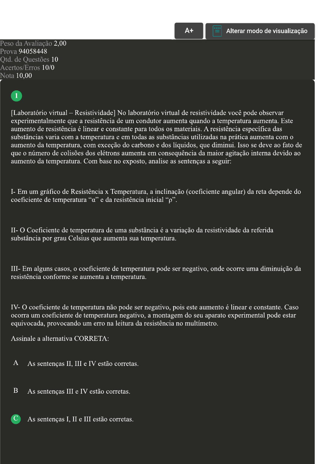 A+ Alterar modo de visualização Peso da Avaliação 2,00 Prova 94058448 Qtd. de Questões 10 Acertos/Erros 10/0 Nota 10,00 1 [Laboratório virtual - Resistividade] No laboratório virtual de resistividade você pode observar experimentalmente que a resistência de um condutor aumenta quando a temperatura aumenta. Este aumento de resistência é linear e constante para todos os materiais. A resistência específica das substâncias varia com a temperatura e em todas as substâncias utilizadas na prática aumenta com aumento da temperatura, com exceção do carbono e dos líquidos, que diminui. Isso se deve ao fato de que número de colisões dos elétrons aumenta em consequência da maior agitação interna devido ao aumento da temperatura. Com base no exposto, analise as sentenças a seguir: I- Em um gráfico de Resistência X Temperatura, a inclinação (coeficiente angular) da reta depende do coeficiente de temperatura "a" e da resistência inicial "p". II- O Coeficiente de temperatura de uma substância é a variação da resistividade da referida substância por grau Celsius que aumenta sua temperatura. Em alguns casos, coeficiente de temperatura pode ser negativo, onde ocorre uma diminuição da resistência conforme se aumenta a temperatura. IV- O coeficiente de temperatura não pode ser negativo, pois este aumento é linear e constante. Caso ocorra um coeficiente de temperatura negativo, a montagem do seu aparato experimental pode estar equivocada, provocando um erro na leitura da resistência no multímetro. Assinale a alternativa CORRETA: A As sentenças II, III e IV estão corretas. B As sentenças III e IV estão corretas. C As sentenças I, II e III estão corretas.D As sentenças I e IV estão corretas. 2 Em um circuito de associação em paralelo há dois resistores, os quais possuem resistência de e 30 Determine a resistência equivalente e assinale a alternativa CORRETA: A B C D 3 Os materiais cujo comportamento está entre de um condutor e de um isolante, são classificados com esse nome. Sobre como se chamam esses materiais, assinale a alternativa CORRETA: A B Térmicos. C Semicondutores. D Silícios. 4 [Laboratório virtual - Associação de Resistores] Através do laboratório virtual, você mediu a resistência equivalente de diferentes associações de resistências. Um resistor é um componenteelétrico usado para introduzir resistência elétrica entre dois pontos em um circuito. Os resistores podem ser conectados de duas maneiras, em série e em paralelo. É conhecido em série quando dois resistores são conectados um após outro. O que nos permite obter uma resistência equivalente simplesmente adicionando as resistências. Por outro lado, resistores em paralelo são conectados em suas extremidades. Para encontrar a resistência equivalente destes, temos que somar seus inversos. Com relação ao experimento virtual sobre associação de resistores em série e em paralelo, analise as afirmativas a seguir: I- Em uma associação em série de dois resistores, a corrente do circuito será igual nos dois resistores. II- Em uma associação em paralelo de dois resistores, a tensão sobre cada resistor da associação é a mesma. III- Em uma associação de resistores em paralelo, a corrente elétrica total resulta da soma das correntes que circulam por cada resistor. IV- Em uma associação de resistores em paralelo, a resistência equivalente é sempre maior do que a resistência de menor valor que circuito contém. Assinale a alternativa CORRETA: A As afirmativas I, II e III estão corretas. B As afirmativas III e IV estão corretas. C As afirmativas I e IV estão corretas. D As afirmativas II, III e IV estão corretas. 5 Sobre a corrente que essa combinação consumirá de uma bateria de 35V, com resistência interna desprezível, quando ela está conectada através de determinada analise a figura a seguir: b a Sobre a ac, assinale a alternativa CORRETA:A B C D 6 Um corpo está eletricamente neutro, quando passa por um processo de eletrização (processo que força a troca de cargas elétricas), ficando, ao final, com uma carga de -2,5 mC. A respeito do que ocorreu com este corpo material, é correto afirmar que: A O corpo recebeu elétrons. B O corpo perdeu prótons. C O corpo recebeu prótons. D O corpo perdeu 7 Um farol de automóvel, de resistência desconhecida, é colocado em paralelo com acendedor de cigarros de 75 ohms de resistência, conforme a figura anexa. Se a corrente total exigida pelos dois componentes é de 0,8 A, quando ligados a uma bateria de tensão de 12 V, analise as sentenças a seguir: I- A resistência do farol é de 18,8 ohms. O conceito de resistência elétrica consiste na flexibilidade de um condutor circular sobre fluxo de elétrons. III- O termo resistência elétrica acontece quando os átomos de um condutor tentam bloquear fluxo de elétrons. A resistência do farol é de 3,36 ohms. I=0,8 A 12 V do Assinale a alternativa CORRETA: A As sentenças II e III estão corretas. B As sentenças I e III estão corretas.C As sentenças II e IV estão corretas. D As sentenças I e IV estão corretas. 8 Dentro da matriz energética brasileira, existe uma fonte de geração de energia elétrica que é considerada como principal. Sobre essa fonte, assinale a alternativa CORRETA: A Geração Hidráulica. B Geração Fotovoltaica. C Geração Eólica. D Geração 9 Duas lâmpadas incandescentes A e B são ligadas em série a uma pilha, conforme mostra a figura 1. Nesse arranjo, A brilha mais que B. Um novo arranjo é feito, em que a polaridade da pilha é invertida no circuito, conforme mostrado na figura 2. + A B A B figura 1 figura 2 Sobre a relação entre as resistências elétricas das duas lâmpadas e as suas respectivas luminosidades na nova situação, assinale a alternativa CORRETA: A A tem menor resistência elétrica e, na nova situação, brilha menos que B. B As duas resistências elétricas são iguais e, na nova situação, A br