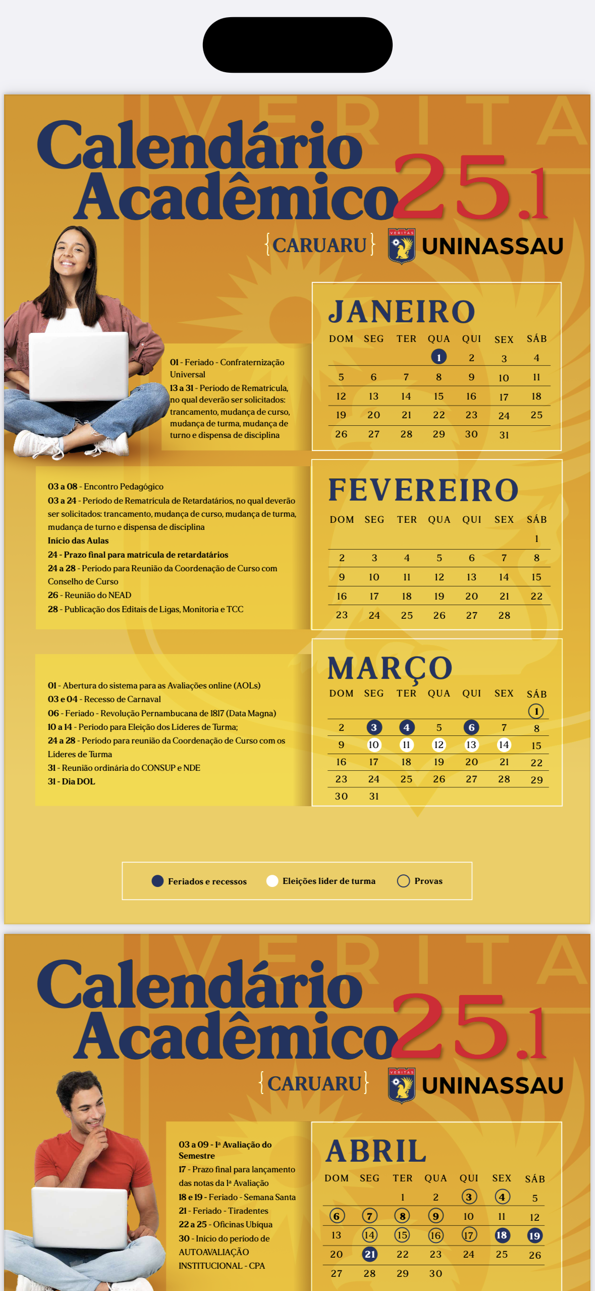 Calendário Acadêmico 25. VERITAS CARUARU} UNINASSAU JANEIRO DOM SEG TER QUA QUI SEX 1 2 3 4 Feriado Confraternização Universal 5 6 7 8 9 10 11 13 a 31 Período de Rematrícula no qual deverão ser solicitados: 12 13 14 15 16 17 18 trancamento, mudança de 19 20 21 22 23 24 25 mudança de turma, mudança de turno e dispensa de disciplina 26 27 28 29 30 31 03 a 08 Encontro Pedagógico FEVEREIRO 03 a 24 Período de Rematrícula de no qual deverão ser solicitados: trancamento, mudança de curso, mudança de turma, DOM SEG TER QUA QUI SEX mudança de turno e dispensa de disciplina Início das Aulas 1 24 Prazo final para matrícula de retardatários 2 3 4 5 6 7 8 24 a 28 Período para Reunião da Coordenação de Curso com 9 10 11 12 13 14 15 Conselho de Curso 26 Reunião do NEAD 16 17 18 19 20 21 22 28 Publicação dos Editais de Ligas, Monitoria e TCC 23 24 25 26 27 28 MARÇO 01 Abertura do sistema para as Avaliações online (AOLs) DOM SEG TER QUA QUI SEX 03 e 04 Recesso de Carnaval 06 Feriado Revolução Pernambucana de 1817 (Data Magna) 1 10 a 14 Período para Eleição dos de Turma: 2 3 4 5 6 7 8 24 a 28 Período para reunião da Coordenação de Curso com os 9 10 11 12 13 14 15 de Turma 16 17 18 19 20 21 22 31 Reunião ordinária do CONSUP e 31 Dia DOL 23 24 25 26 27 28 29 30 31 Feriados e recessos Eleições líder de turma Provas Calendário A Acadêmico 25. CARUARU} UNINASSAU 03 09 Avaliação do Semestre ABRIL 17 Prazo final para lançamento das notas da 1a Avaliação DOM SEG TER QUA QUI SEX 18 e 19 Feriado Semana Santa 1 2 3 4 5 21 Feriado Tiradentes 6 7 8 9 10 11 12 22 25 Oficinas Ubíqua 30 Início do período de 13 15 16 17 18 19 AUTOAVALIAÇÃO 20 21 22 23 24 25 26 INSTITUCIONAL CPA 27 28 29 30