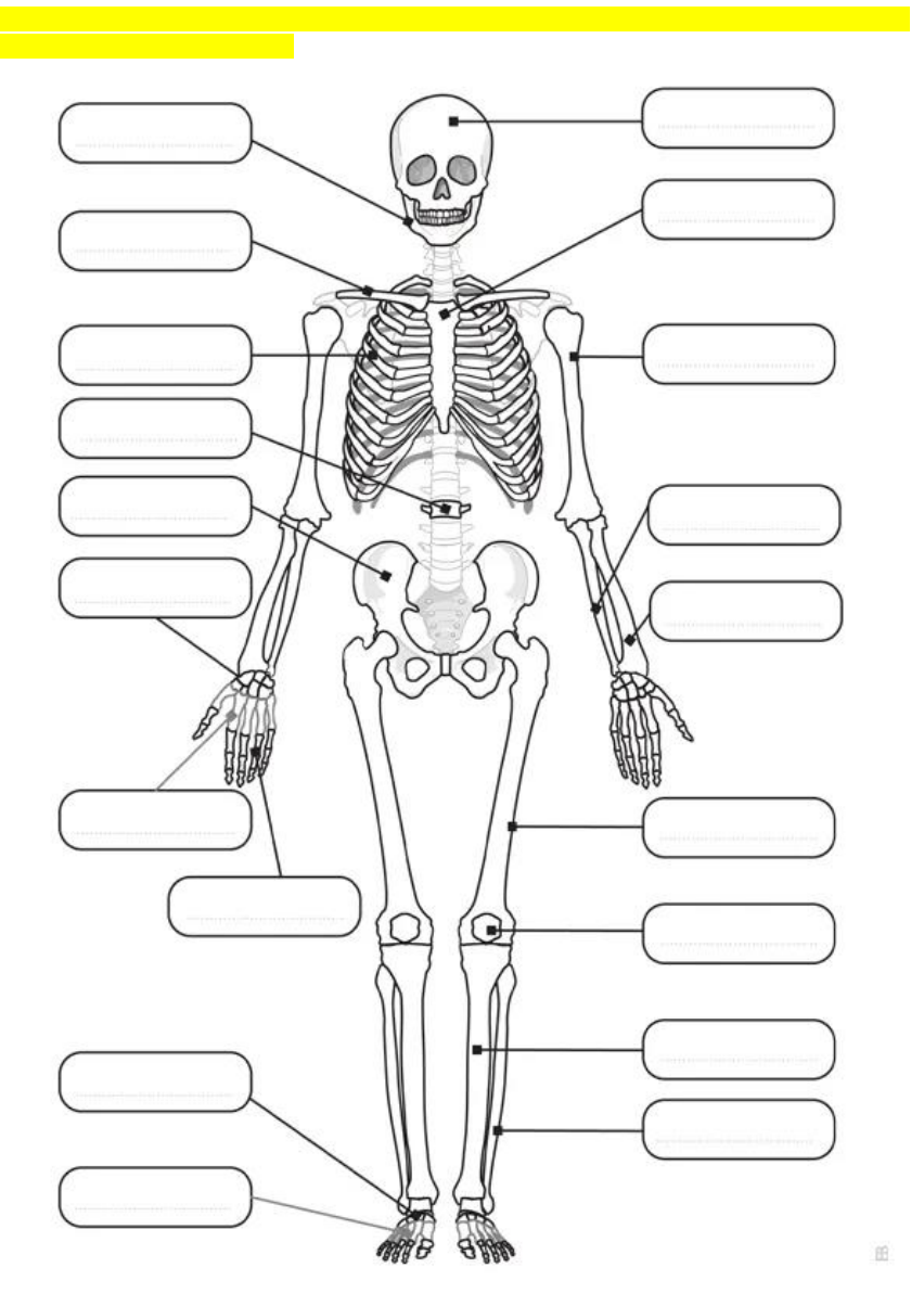 ATIVIDADE DE AULA PRÁTICA DE ANATOMIA HUMANA (OBRIGATÓRIA) Professora Claudia C. B. Evangelista Coimbra O esqueleto adulto apresenta 206 ossos e está dividido didaticamente em esqueleto axial e esqueleto apendicular. Reconheça, identifique e nomeie os ossos do esqueleto ilustrado abaixo. Mandíbula Clavícula Costela Vertebra Lombar Crânio Esterno Úmero Ulna Rádio Ílio Carpo Metacarpo Fêmur Patela Tíbia Fíbula Falange Tarso Metatarso Podem imprimir, preencher e colocar abaixo ou clicar nos 3 pontinhos, dentro de cada espaço, e digitar o nome de cada parte