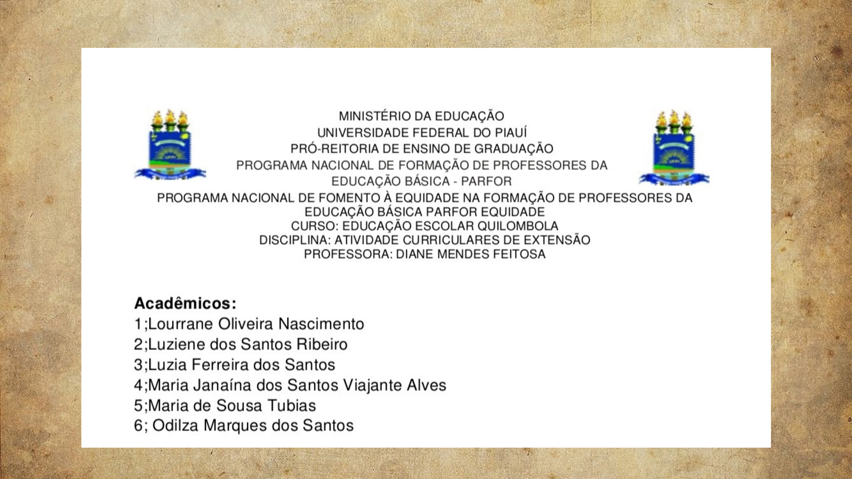A HISTÓRIA DO QUILOMBO LAGOAS RESISTÊNCIA E IDENTIDADE: A construção da identidade coletiva, papel dos anciãos na preservação da memória, e os elementos da ancestralidade africana preservados na comunidade Lagoa das Emas OBJETIVOS OBJETIVO GERAL: ✔ Conhecer a história da comunidade quilombola Lagoa das Emas, no Piauí, enfatizando suas origens, dinâmicas socioculturais e os processos de resistência que possibilitaram a preservação de sua identidade coletiva ao longo do tempo. OBJETIVOS ✔ Analisar os aspectos históricos que levaram a formação do Quilombo Lagoas. ✔ Compreender o papel da ancestralidade na construção da identidade quilombola, avaliando como os conhecimentos e práticas tradicionais moldam as relações sociais, os ritos e as formas de pertencimento da comunidade. OBJETIVOS ESPECIFICOS ✔ Identificar as tradições culturais que foram preservadas e passadas entre gerações e como foram transmitidas; investigando os mecanismos de transmissão oral, as práticas comunitárias e os desafios contemporâneos para a continuidade dessas tradições. FUNDAMENTAÇÃO TEÓRICA O Quilombo Lagoas é uma das maiores comunidades Quilombolas do País, fica localizado na região sudeste do Piauí e engloba seis municípios: São Raimundo Nonato, Várzea Branca, Dirceu Arcoverde, São Lourenço, Bonfim do Piauí e Fartura do Piauí. Essas comunidades representam a resistência e a luta dos afrodescendentes no Brasil. O território quilombola está inserido na região semiárida do país e no bioma caatinga, caracterizada pela escassez de chuvas e altas temperaturas. A distribuição espacial das várias comunidades do quilombo se deu preferencialmente em torno de pequenas aguadas, que são áreas baixas formadas naturalmente ou aprofundadas por escavação, que acumulam água no período chuvoso (FARIA, 2016, P.5) FUNDAMENTAÇÃO TEÓRICA Formado por descendentes de escravizados que buscaram liberdade e preservação de suas tradições, o quilombo é um espaço de rica cultura, onde se destacam práticas como a música, dança, culinária e religiosidade afro-brasileira. A identidade quilombola dentro das comunidades negras rurais é reforçada em seus modos de ser, sentir e fazer. Sua construção faz-se presente no dia a dia da comunidade pelos seus costumes e tradições passadas de geração a geração e é marcadamente evidenciado como ferramenta de luta política pelas disputas em prol do reconhecimento da sua negritude, de suas reminiscências quilombolas, de seu território e de seus direitos (Santos; Lima, 2013, p.203-204) FUNDAMENTAÇÃO TEÓRICA Historicamente, o Quilombo Lagoas enfrentou desafios significativos, incluindo a luta por reconhecimento territorial e direitos sociais. A comunidade tem se mobilizado para preservar sua identidade cultural e garantir acesso a políticas públicas que promovam seu desenvolvimento. As tradições orais, transmitidas de geração em geração, são fundamentais para manter viva a memória histórica do lugar. Para Macêdo, as comunidades quilombolas tem mantido “o forte sentimento de pertencimento, de territorialidade, de respeito à natureza, o espírito cooperativo e a riqueza dos conhecimentos tradicionais” (MACÊDO, 2021, p.19) PÚBLICO ALVO O presente projeto visa introduzir os alunos do 4º ano do ensino fundamental à rica cultura das comunidades quilombolas, com foco específico na Lagoa das Emas. A proposta busca despertar o interesse e a curiosidade das crianças por meio de atividades práticas e interativas, promovendo um aprendizado lúdico e significativo que valorize a ancestralidade e a identidade cultural quilombola. Conforme Freire (1987, p. 45), o diálogo entre gerações fortalece a identidade cultural e contribui para uma educação libertadora. PROCEDIMENTOS • Reuniões para discussão e planejamento do projeto; •Entrevistas com pessoas da comunidade; abordagens através de questionários, escritos e registros fotográficos; •Apresentação do projeto na comunidade e escola; •Oficina de argila, utilizada por nossos antepassados para construir seus utensílios; •Exposição de peças artesanais utilizadas por nossos antepassados; •Oficinas de pinturas com tintas naturais. RESULTADOS •Os participantes das oficinas tiveram a oportunidade de desenvolver habilidades práticas em modelagem de argila e produção de tintas, promovendo a criatividade e a expressão artística, contribuindo para a preservação desse conhecimento para futuras gerações. •Favoreceu o fortalecimento da identidade cultural entre os membros da comunidade quilombola, promovendo um senso de pertencimento e orgulho em relação às suas raízes. •As oficinas promoveram um espaço de interação social, promovendo o fortalecimento dos laços comunitários e incentivando a colaboração entre os participantes. EXPOSIÇÃO DE PEÇAS ARTESANAIS UTILIZADAS POR NOSSOS ANTEPASSADOS OFICINA DE ARGILA OFICINA DE TINTAS NATURAIS ESTEIRA COM FOLHA DE BANANEIRA Fomos recebidos de forma acolhedora pela equipe da Unidade Escolar Benício Joaquim do Nascimento. A equipe estava extremamente engajada e disposta a colaborar com nosso projeto, demonstrando um forte compromisso com a educação e o desenvolvimento cultural dos alunos. Além disso, a interação com os alunos foi simplesmente incrível. O brilho nos olhos deles ao participar das oficinas e aprender sobre a cultura local foi uma recompensa indescritível. A energia positiva que permeou o ambiente nos motivou ainda mais a compartilhar nossos conhecimentos e experiências. Participar do projeto de extensão sobre o Quilombo Lagoas foi uma experiência enriquecedora e transformadora para nós, acadêmicos. Aprendemos a dar importância, respeitar e valorizar a cultura quilombola, compreendendo suas tradições, histórias e modos de vida. Essa vivência nos ajudou a reconhecer a riqueza cultural que muitas vezes é ignorada. Compreendemos como técnicas ances