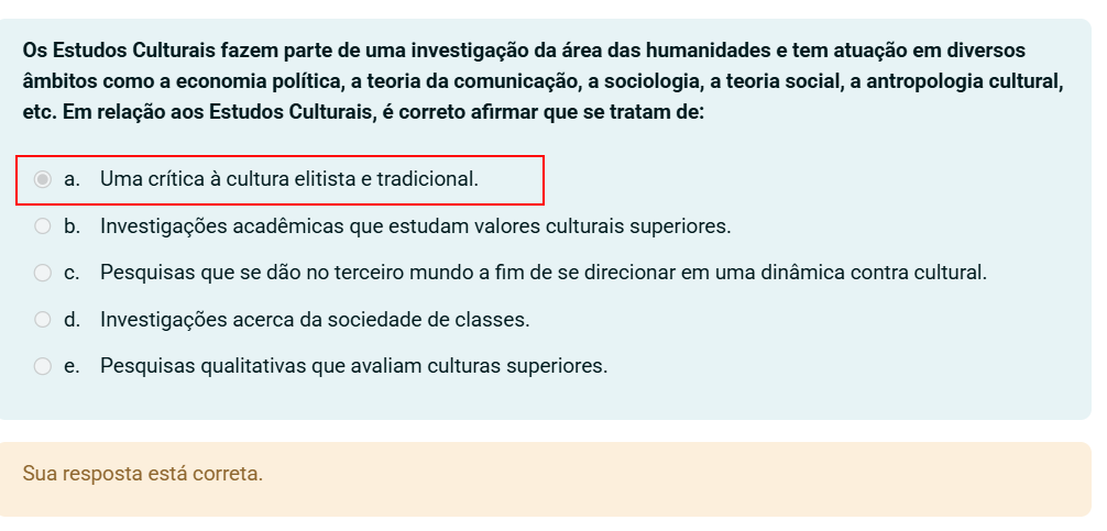 Os Estudos Culturais fazem parte de uma investigação da área das humanidades e tem atuação em diversos âmbitos como a economia política, a teoria da comunicação, a sociologia, a teoria social, a antropologia cultural, etc. Em relação aos Estudos Culturais, é correto afirmar que se tratam de: a. Uma crítica à cultura elitista e tradicional. b. Investigações acadêmicas que estudam valores culturais superiores. C. Pesquisas que se dão no terceiro mundo a fim de se direcionar em uma dinâmica contra cultural. d. Investigações acerca da sociedade de classes. e. Pesquisas qualitativas que avaliam culturas superiores. Sua resposta está correta.