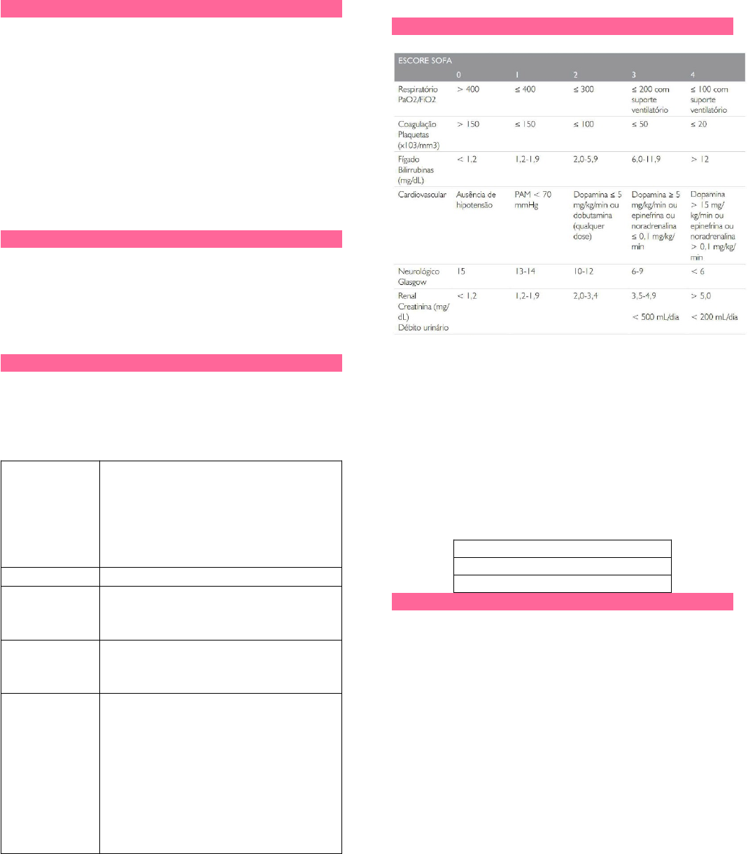 Choque séptico DEFINIÇÕES Sepse: disfunção orgânica com risco de morte devido a uma resposta desregulada do organismo a uma infecção. · Critérios: SOFA ≥ 2 Sepse grave: termo abandonado. Choque séptico: subgrupo de sepse com disfunção cardiovascular e celular associada com risco aumentado de óbito. · Critérios: uso de vasopressor para manter PAM > 65 mmHg E lactato > 18 mg/d L persistente após ressuscitação volêmica adequada. FISIOPATOLOGIA Contato com agente infeccioso → Liberação de citocinas, ativação do sistema complemento e da coagulação → Migração de leucócitos para o foco infeccioso → Produção de NO → Vasodilatação arteriolar e venodilatação → Hipotensão e diminuição do retorno venoso → Diminui perfusão tecidual. QUADRO CLÍNICO Os sinais e sintomas primários, em geral, provêm do órgão acometido pela infecção em seu início. A presença de disfunção orgânica não só tem valor prognóstico como também serve para determinar o suporte necessário a ser dado a esses pacientes. CV Hipovolemia, taquicardia, alargamento da pressão de pulso, extremidades quentes. Hipotensão, choque. Exames: ↑ lactato, ↑gap CO2, acidose metabólica, ↓SVC. Renal Oliguria, ↑ureia e creatinina. Pulmonar Hipoxemia refratária, diminuição da complacência pulmonar e necessidade de VM, SDRA. Neurológica Encefalopatia associada à sepse: déficit de atenção e distúrbio cognitivo Coagulação Estado pró-coagulante com surgimento de CIVD, bem como redução da atividade dos sistemas anticoagulantes e do sistema fibrinolítico. Exames: plaquetopenia, ↑ TAP e TTPA, redução do fibrinogênio e aumento dos produtos de degradação da fibrina. Exames solicitados: hemograma, lactato, gasometria arterial e venosa, ureia, creatinina, eletrólitos, TAP, TTPA, bilirrubinas, TGO/TGP, culturas, PCR, procalcitonina, troponina/CKMB*, ECG*, exames de imagem. DIAGNÓSTICO Escore SOFA qSOFA: surgiu como uma forma de melhorar a triagem de pacientes sépticos em locais que não dispõem de recursos para realizar exames laboratoriais rapidamente e assim otimizar seu tratamento. É um identificador de pacientes com alto risco de óbito ou de permanecer na UTI por mais de três dias baseado apenas em dados clínicos sem necessidade de coleta de exames adicionais. A presença de dois ou três critérios positivos no qSOFA > 2 definiria esse paciente de alto risco, que deverá receber monitorização estrita e eventualmente transferência para UTI. PAS 4 mmol/L). · Ressuscitação volêmica com dose fixa de 30 mL/kg de cristaloide em pacientes com hipoperfusão. Cuidado em pacientes com ICC, DRC dialítica, anúricos ou idosos com disfunção diastólica. · Preferência pelo uso de cristaloides para expansão volêmica. · Considerar o uso de albumina humana em pacientes com necessidade de grandes quantidades de fluidos e com preocupação em relação ao edema tecidual. · Não se recomenda a utilização de coloides sintéticos para ressuscitação volêmica desses pacientes (pois são sabidamente associados a maior risco de injúria renal aguda e diálise). A droga de escolha para o tratamento inicial da hipotensão não responsiva a fluidos é a noradrenalina. Quanto à meta de pressão arterial a ser atingida, a SSC recomenda uma meta inicial de PAM maior do que 65 mmHg. Pacientes com choque séptico que evoluem com disfunção miocárdica aguda relacionada à sepse ou apresentam disfunção sistólica previamente conhecida identificada por ECO ou baixos parâmetros de perfusão podem se beneficiar do uso de inotrópicos. A droga de escolha nesses casos é a dobutamina. Sugere-se iniciar com doses baixas (2,5 mcg/kg/min) e avaliar a resposta à terapia através de ecocardiogramas seriados ou coletas frequentes de saturação venosa central. Uma possível sugestão de tratamento com CE incluiria pacientes com risco elevado de morte (choque séptico refratário, múltiplas disfunções orgânicas, escores de risco elevados). A dose recomendada é a hidrocortisona 200 a 300 mg/ dia por 7 dias, podendo-se suspender imediatamente após o uso. • Suporte às demais disfunções orgânicas. O paciente com sepse é um paciente de alto risco para múltiplas complicações clínicas. Assim, para pacientes sépticos internados na UTI, cuidados gerais de boa qualidade reduzem complicações. Pacientes com sepse podem evoluir para SDRA. Nessa condição, abordagens associadas à menor mortalidade incluem ventilação mecânica protetora, com o objetivo de limitar o volume corrente a 6 mL/kg e a pressão de platô a menos de 30 cmH2O; e posição prona, por ao menos 12 horas, nas primeiras 24 horas de SDRA naqueles com relação PaO2/FiO2