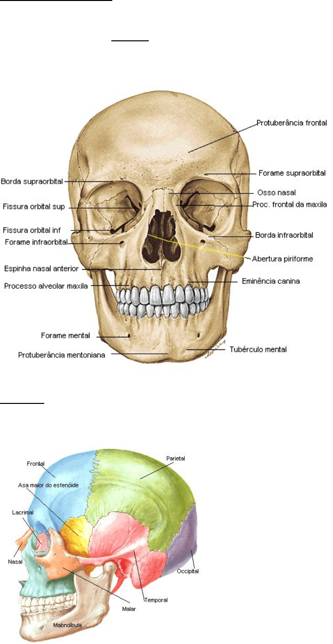 ESQUELETO AXIAL Vamos estudar o esqueleto que forma o eixo do corpo iniciando o estudo da CABEÇA óssea que se divide em crânio e face. Não risque as peças, utilize os estiletes marcadores para apontar as estruturas. OSSOS DO CRÂNIO Frontal:- o osso frontal forma, essencialmente, a fronte (testa); o teto da cavidade nasal e as órbitas. Procure identificar os seguintes acidentes anatômicos: borda supra-orbitária, uma borda definida acima de cada órbita, e o arco superciliar, uma proeminência que se superpõe ao seio frontal; tuberosidade frontal, espinha nasal e processo zigomático. Parietais:- os dois ossos parietais, direito e esquerdo, formam os lados e o teto do crânio e se articulam na linha mediana formando a sutura sagital. A linha de articulação com o osso frontal é chamada de sutura coronal. Procure identificar, ainda, os acidentes seguintes: borda escamosa, forame parietal, sulco da artéria meníngea média, linha temporal superior, linha temporal inferior. Temporais: direito e esquerdo, constituem as paredes laterais do crânio; são formados por uma porção escamosa, que se articula com o parietal na sutura escamosa, uma porção mastóidea (processo mastóide), porção tímpânica e porção petrosa (ou rochosa). Identifique, também, os acidentes ósseos: processo estilóide, processo zigomático, o qual, juntamente com o processo temporal do osso zigomático formam o arco zigomático, meato acústico externo, meato acústico interno, fossa e tubérculo mandibular, canal carotídeo. Esfenóide:- Identifique, os seguintes acidentes: processos clinóides anteriores e posteriores, fossa hipofisária, forame redondo, forame oval, forame espinhoso, canal óptico. Etmóide:- Possui uma lâmina horizontal, a lâmina crivosa, que é atravessada pelos filetes do nervo olfatório; uma lâmina perpendicular, que, juntamente com o vômer, constitui o septo nasal ósseo. Identifique ainda as conchas nasais superior e média que são duas massas laterais que projetam-se para o interior da cavidade nasal. Occipital:- o osso occipital forma a parte posterior e parte da base do crânio; articula-se anteriormente com os ossos parietais formando a sutura lambdóide. Em sua porção inferior há uma grande abertura, denominada forame magno, que dá passagem à continuação caudal do encéfalo. Observe a protuberância occipital externa; os côndilos do occipital, que se articulam com a primeira vértebra cervical, denominada atlas; e, ainda, apresenta uma porção basilar, que se articula com o corpo do osso esfenóide. Procure identificar, ainda, os acidentes ósseos: protuberância occipital interna, canal do nervo hipoglosso, linha nucal superior, linha nucal inferior. Observe os principais forames encontrados na cabeça e as respectivas estruturas transmitidas: canal carotídeo => artéria carótida interna forame infra-orbitário => nervo maxilar, ramo do nervo trigêmio (V par craniano) forame jugular => IX (nervo glossofaríngeo), X (nervo vago) e XI (nervo acessório) pares de nervos cranianos. forame mandibular => nervo e vasos alveolares inferiores canal óptico => II (nervo óptico) par de nervos cranianos. forame oval => nervo mandibular, ramo do nervo trigêmio (V par craniano) forame redondo => nervo maxilar, ramo do nervo trigêmio (V par craniano) fissura orbitária superior => III (n. oculomotor), IV (n. troclear) e o n. oftálmico, ramo do nervo trigêmio (V par craniano) forame estilomastóideo => VII par (n. facial) incisura supra-orbitária => nervo e vasos supra-orbitários OSSOS DA FACE Maxilas:- direita e esquerda, ocupam quase toda a face, formando o maxilar. Cada maxila apresenta um corpo, um processo frontal, que se articula com o osso frontal, um processo palatino que, juntamente com a lâmina horizontal do osso palatino, forma o palato duro; processo alveolar, em cujos alvéolos estão implantados os dentes, e um processo zigomático. Palatinos:- direito e esquerdo, são dois pequenos ossos em forma de L, com uma lâmina horizontal e outra, lâmina vertical , localizados atrás das maxilas e anteriormente aos processos pterigóides do osso esfenóide, participam da delimitação das cavidades bucal, nasal e orbitária. Zigomáticos (ou malares):- os ossos zigomáticos, direito e esquerdo, são duas massas ósseas salientes que formam as proeminências da face; através do seu processo temporal do osso zigomático, que se articula com o processo zigomático do osso temporal, forma o arco zigomático; limitam a órbita juntamente com a maxila. Nasais:- os ossos nasais, direito e esquerdo, articulam-se entre si no plano mediano , formam o esqueleto ósseo de parte do dorso do nariz. Lacrimais:- estão situados na parte anterior da parede medial da órbita, e delimitam a fossa do saco lacrimal, que se continua no canal naso-lacrimal, que se abre no meato inferior da cavidade nasal. Conchas nasais inferiores:- são ossos independentes, laminares, situados na cavidade nasal, podem ser observadas através da abertura piriforme do nariz. Vômer:- é um pequeno osso situado na face inferior do crânio, onde se articula com o osso esfenóide; possui uma lâmina que, juntamente com a lâmina perpendicular do osso etmóide, concorre para a formação do septo nasal ósseo. Mandíbula:- é um osso ímpar e móvel, articula-se com os temporais através dos côndilos, formando a articulação têmporo-mandibular (ATM). A mandíbula consta de um corpo, em forma de ferradura, que apresenta os alvéolos da arcada dentária inferior, e dois ramos, continuação do corpo numa angulação conhecida como ângulo da mandíbula. O ramo da mandíbula apresenta um côndilo, que se articula com a fossa mandibular do temporal, e um processo coronóide; entre o côndilo e o processo coronóide há uma incisura mandibular. Osso hióide:- é um osso pequeno, em forma de ferradura, ímpar, e não pertence nem ao crânio nem à face, estando situado na região do pescoço, abaixo