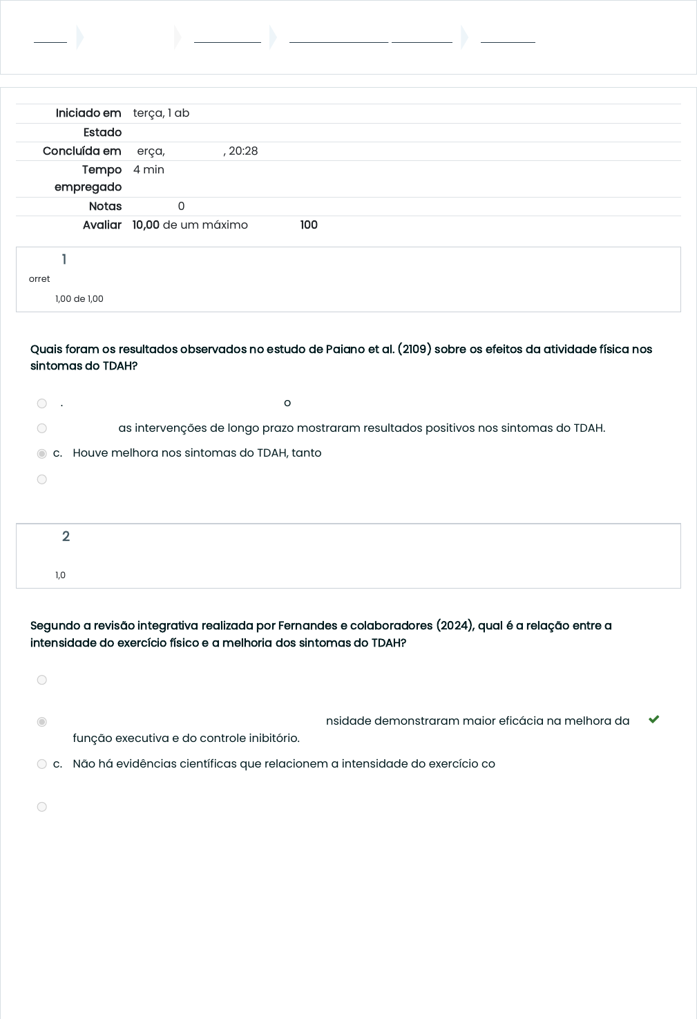 Painel Meus cursos IMP_ATI_FIS Consolidando o aprendizado Exercícios Iniciado em terça, 1 abr 2025, 20:23 Estado Finalizada Concluída em terça, 1 abr 2025, 20:28 Tempo empregado 4 minutos 43 segundos Notas 5,00/5,00 Avaliar 10,00 de um máximo de 10,00(100%) Questão 1 Correto Atingiu 1,00 de 1,00 Questão 2 Correto Atingiu 1,00 de 1,00 Quais foram os resultados observados no estudo de Paiano et al. (2109) sobre os efeitos da atividade física nos sintomas do TDAH? a. Não houve mudanças significativas nos sintomas do TDAH. b. Apenas as intervenções de longo prazo mostraram resultados positivos nos sintomas do TDAH. c. Houve melhora nos sintomas do TDAH, tanto em intervenções de curto quanto de longo prazo. d. Os sintomas do TDAH pioraram após a intervenção com atividade física. Segundo a revisão integrativa realizada por Fernandes e colaboradores (2024), qual é a relação entre a intensidade do exercício físico e a melhoria dos sintomas do TDAH? a. Atividades físicas extenuantes são as mais indicadas, pois aumentam os níveis de adrenalina e, consequentemente, melhoram o foco e a concentração. b. Exercícios aeróbicos de moderada a alta intensidade demonstraram maior eficácia na melhora da função executiva e do controle inibitório. c. Não há evidências científicas que relacionem a intensidade do exercício com os benefícios no tratamento do TDAH. d. Exercícios de baixa intensidade são mais eficazes na regulação da impulsividade e atenção do que os de alta intensidade. 01/04/2025, 20:34 Exercícios: Revisão da tentativa https://eadcursosgratuitos.mackenzie.br/mod/quiz/review.php?attempt=48343&cmid=2225 1/3 https://eadcursosgratuitos.mackenzie.br/my/ https://eadcursosgratuitos.mackenzie.br/course/view.php?id=95 https://eadcursosgratuitos.mackenzie.br/course/view.php?id=95#section-8 https://eadcursosgratuitos.mackenzie.br/mod/quiz/view.php?id=2225 Questão 3 Correto Atingiu 1,00 de 1,00 Questão 4 Correto Atingiu 1,00 de 1,00 Questão 5 Correto Atingiu 1,00 de 1,00 Considerando os achados do artigo “Impacto da atividade física no tratamento do TDAH: uma revisão integrativa”, como a atividade física pode ser incorporada como estratégia complementar no tratamento do TDAH? a. Exercícios físicos são recomendados apenas para crianças com TDAH, não havendo evidências de benefícios significativos para adolescentes e adultos. b. Para que a atividade física tenha impacto nos sintomas do TDAH, é necessário que seja praticada exclusivamente em ambiente escolar e sob supervisão profissional. c. A atividade física pode substituir completamente o uso de medicação estimulante e a terapia comportamental, sendo um tratamento autossuficiente. d. A inclusão de exercícios físicos no tratamento deve ser adaptada individualmente, considerando o tipo, a frequência e a intensidade para maximizar seus benefícios cognitivos e comportamentais. As funções executivas, como planejamento, memória de trabalho e controle inibitório, são afetadas no TDAH de diferentes formas. Qual das alternativas melhor explica essa relação? a. A apresentação hiperativa-impulsiva compromete a tomada de decisão, mas não afeta a regulação emocional ou a memória operacional. b. A desatenção no TDAH ocorre exclusivamente devido a déficits na percepção sensorial, sem relação com funções executivas. c. O TDAH predominantemente desatento afeta principalmente a memória de trabalho, enquanto o hiperativo-impulsivo prejudica o controle inibitório. d. Apenas o TDAH combinado causa dificuldades nas funções executivas; os outros subtipos não apresentam impactos significativos. Crianças com TDAH frequentemente apresentam dificuldades motoras que podem impactar suas atividades diárias. Qual das alternativas a seguir melhor descreve essas dificuldades? a. O desempenho motor em crianças com TDAH é semelhante ao de crianças sem o transtorno. b. Crianças com TDAH podem apresentar dificuldades em habilidades motoras finas e grossas, como coordenação e equilíbrio. c. Dificuldades motoras ocorrem apenas em crianças com TDAH do tipo predominantemente desatento. d. Apenas crianças com TDAH do tipo combinado apresentam dificuldades motoras. Atividade anterior ◄ O Mackenzie quer conhecer você! 01/04/2025, 20:34 Exercícios: Revisão da tentativa https://eadcursosgratuitos.mackenzie.br/mod/quiz/review.php?attempt=48343&cmid=2225 2/3 https://eadcursosgratuitos.mackenzie.br/mod/questionnaire/view.php?id=2224&forceview=1 Seguir para... Próxima atividade Declaração ► Manter contato https://www.mackenzie.br/transparencia/protecao-de-dados/ https://www.mackenzie.br/ Baixar o aplicativo móvel. 01/04/2025, 20:34 Exercícios: Revisão da tentativa https://eadcursosgratuitos.mackenzie.br/mod/quiz/review.php?attempt=48343&cmid=2225 3/3 https://eadcursosgratuitos.mackenzie.br/mod/simplecertificate/view.php?id=2227&forceview=1 https://www.mackenzie.br/ https://download.moodle.org/mobile?version=2020110907.09&lang=pt_br&iosappid=633359593&androidappid=com.moodle.moodlemobile