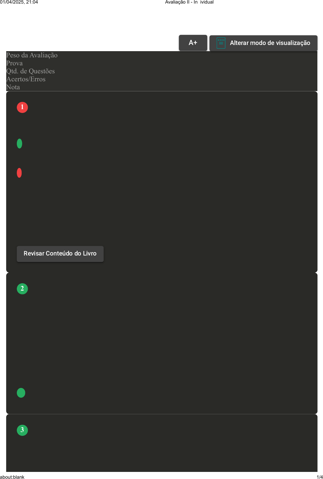 Prova Impressa GABARITO | Avaliação II - Individual (Cod.:987119) Peso da Avaliação 2,00 Prova 87081979 Qtd. de Questões 10 Acertos/Erros 6/4 Nota 6,00 Para que uma pesquisa aconteça, é necessário estabelecer uma ordem de todas as atividades que precisam ser desenvolvidas. Essas atividades caracterizam as etapas do processo de pesquisa. Sobre a ordem desse processo, assinale a alternativa CORRETA: A Definição do problema - Desenvolvimento de uma abordagem - Formulação da concepção da pesquisa - Trabalho de campo ou coleta de dados - Preparação e análise dos dados - Preparação e apresentação do relatório. B Definição do problema - Formulação da concepção da pesquisa - Desenvolvimento de uma abordagem - Trabalho de campo ou coleta de dados - Preparação e análise dos dados - Preparação e apresentação do relatório. C Formulação da concepção da pesquisa - Definição do problema - Desenvolvimento de uma abordagem - Trabalho de campo ou coleta de dados - Preparação e análise dos dados - Preparação e apresentação do relatório. D Desenvolvimento de uma abordagem - Definição do problema - Formulação da concepção da pesquisa - Trabalho de campo ou coleta de dados - Preparação e análise dos dados - Preparação e apresentação do relatório. Diversas são as ferramentas disponíveis para se realizar um bom planejamento para as organizações. Elas vão desde planejamento estratégico, planos de marketing, matrizes e análises, tudo isso para ajudar o gestor a entender melhor o mercado em que atua e facilitar a tomada de decisões. Sobre a função das ferramentas para o planejamento, assinale a alternativa CORRETA: A Produtos de destaque ou estrelas são aqueles mais comprados pelo mercado, mas também os que enfrentam maior concorrência. B Produtos estrela possuem alta participação de mercado, mas com menor lucro que os produtos chamados de vacas leiteiras. C A matriz BCG categoriza produtos pelo preço, com os produtos de destaque sendo definidos como as estrelas do negócio. D Uma matriz BCG ajuda a definir visualmente a oportunidade de cada produto comercializado por uma empresa. Para que seja possível colocar em prática as estratégias de marketing, é necessário documentar todo o contexto em que se situa a organização e listar ações que possam ser executadas de forma estratégica, com a finalidade de atender a um objetivo de marketing. O plano de marketing é o documento responsável por compilar todas estas informações. Sobre esse documento, assinale a alternativa CORRETA: VOLTAR A+ Alterar modo de visualização 1 Revisar Conteúdo do Livro 2 3 01/04/2025, 21:04 Avaliação II - Individual about:blank 1/4 A O plano de marketing pode ser denominado também como Planejamento Estratégico, apresentando as diretrizes estratégicas da organização. B No plano de marketing, são apresentadas as informações detalhadas sobre o processo de coleta de dados para a tomada de decisão. C O plano de marketing é como um mapa - ele mostra à empresa aonde ela está indo e como vai chegar lá. Ele é tanto um plano de ação como um documento escrito. D Um dos itens do planejamento de marketing é a análise SWOT, responsável por definir as estratégias de mercado que podem ser colocadas em prática pela organização. A pesquisa de marketing pode utilizar dados internos da organização e dados do mercado. Documentos, depoimentos e entrevistas são alguns dos métodos a serem utilizados na colea de dados. Com relação às etapas da pesquisa de marketing, assinale a alternativa CORRETA: A A pesquisa por telefone ou internet possui alta taxa de respostas justamente pelo fato de muitas pessoas terem acesso a celular e internet. B A pesquisa qualitativa utiliza questionários longos que podem ser disponibilizados aos entrevistados na internet para uma melhor conveniência de resposta. C A definição do questionário deve vir antes da formulação do problema, uma vez que um questionário mal elaborado pode influenciar as respostas e não responder ao que está sendo pesquisado. D A pesquisa qualitativa comumente utiliza perguntas abertas, com maior profundidade de respostas, ao modo que na pesquisa quantitativa métodos estatísticos são usados na compilação dos dados. Dentre as marcas mais valiosas do Brasil em 2017, segundo a empresa de consultoria internacional, está a Havaianas. A marca, que se coloca como um case de reposicionamento, ocupou o 16º lugar no ranking, com crescimento de 13%. Sobre o reposicionamento da Havaianas, classifique V para as sentenças verdadeiras e F para as falsas: ( ) As Havaianas Top foram desenvolvidas com base na observação do comportamento dos próprios consumidores. ( ) A comunicação do novo posicionamento passou por uma grande transformação, substituindo o slogan "Havaianas. As legítimas" para "Havaianas. Todo mundo usa". ( ) A campanha de reposicionamento do produto foi veiculada na Internet e tinha como base a contratação de celebridades como garotos-propaganda da marca. Assinale a alternativa que apresenta a sequência CORRETA: A V - V - F. B V - F - V. C F - V - F. D V - V - V. 4 5 Revisar Conteúdo do Livro 01/04/2025, 21:04 Avaliação II - Individual about:blank 2/4 As pesquisas de mercado são fundamentais para que as organizações possam compreender a fundo as necessidades dos seus consumidores, bem como os pontos fortes e fracos de seu negócio. Para que possam colocar em prática uma pesquisa, as organizações necessitam estabelecer inúmeros critérios que contribuem para fazer a pergunta certa, no momento certo, para a pessoa certa. Sobre os tipos de entrevistas, analise as sentenças a seguir: I- As entrevistas com grupos focais acontecem em grupo, sempre com um tema predefinido. II- As entrevistas estruturadas ocorrem mediante questionário totalmente estruturado. III- Na entrevista em profundidade, o pesquisador é questionado sobre determinado tema. Assinale a alter