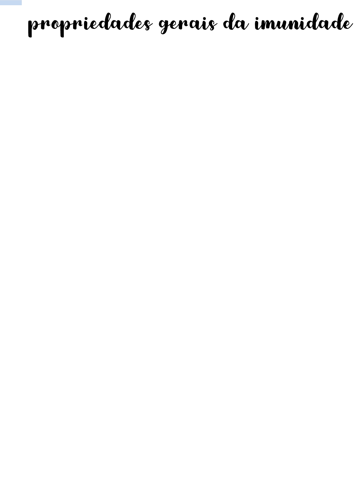 conceituando: • Imunidade: é a resistência ou proteção contra algo, normalmente relacionada com doenças e infecções, que podem atacar o organismo de um ser vivo. Assim, a imunidade consiste num conjunto de mecanismos que defendem o corpo de agentes infecciosos invasores. • Sistema imunológico: conjunto de células responsáveis pela imunidade; • Resposta imunológica: resposta coletiva e coordenada a elementos reconhecidos como estranhos; - A função fisiológica do s. imune é a proteção contra microrganismos infecciosos. No entanto, até mesmo substâncias estranhas não infecciosas podem desencadear respostas imunológicas; - Seus mecanismos podem provocar lesão tecidual e doença em algumas situações. Portanto, essa reação ocorre independentemente das consequências fisiológicas ou patológicas. • Imunologia: é o estudo da resposta imune e dos eventos celulares e moleculares que ocorrem após um organismo entrar em contato com microrganismos e outras moléculas estranhas; - Ciência experimental, na qual as explicações dos fenômenos imunológicos baseiam-se em observações experimentais. a imunidade: • A defesa contra microrganismos é mediada por reações iniciais da imunidade inata e por respostas tardias da imunidade adaptativa; • Os mecanismos da imunidade inata estão presentes, de alguma forma, em todos os seres multicelulares; • Os mecanismos mais especializados da imunidade adquirida são encontrados apenas nos vertebrados; • Ambos os sistemas (inato e adquirido) são funcionalmente similares, porém distintos em nível molecular. São componentes de um sistema integrado de defesa do hospedeiro, no qual numerosas células atuam em cooperação; • A inata estimula respostas imunes adquiridas e essas atuam intensificando os mecanismos protetores da inata, tornando-os mais eficazes. imunidade inata: • Também denominada imunidade natural ou nativa; • Consiste em mecanismos de defesa celulares e bioquímicos, que existem antes da infecção e que estão prontos para responder rapidamente a infecções; • Bloqueia a entrada de microrganismos e elimina ou limita o crescimento de muitos capazes de colonizar tecidos; • Constitui a linha de defesa inicial; • Respondem da mesma maneira a infecções repetidas; • Principais componentes: (1) Barreiras físicas e químicas: como os epitélios e a subs. químicas antimicrobianas produzidas nas superfícies epiteliais; ❗Se os microrganismos conseguem romper essas barreiras epiteliais, deparam-se com as células da imunidade inata, que são: (2) Células fagocíticas (neutrófilos, macrófagos), células dentríticas e células assassinas naturais (NK); (3) Proteínas do sangue: incluindo membros do sistema complemento e outros mediadores da inflamação; (4) Proteínas denominadas citocinas: regulam e coordenam muitas das atividades das células da imunidade inata. • Seus mecanismos são específicos para estruturas comuns a grupos de microrganismos relacionados e podem não distinguir diferenças discretas entre eles. • A resposta nos tecidos consiste em 2 tipos principais de reações: - Inflamação: recrutamento de leucócitos e proteínas plasmáticas do sangue, seu acúmulo e nos tecidos e a sua ativação para destruir os microrganismos: ↳ Principais leucócitos recrutados: neutrófilos (sobrevida curta nos tecidos) e os monócitos (transformados em macrófagos). Esses fagócitos apresentam receptores em sua superfície que se ligam ao microrganismo e o ingere, e outros receptores que que reconhecem moléculas microbianas e ativam células; ↳ Sequencialmente, eles produzem radicais reativos e enzimas lisossômicas que destroem o que foi ingerido. - Defesa antiviral: reação mediada por citocinas, em que células adquirem resistência à infecção viral, e na destruição pelas células NK das células infectadas por vírus; • Aqueles que resistem a essas reações nos tecidos, entram no sangue, onde são reconhecidos por proteínas circulantes; • Entre as proteínas plasmáticas mais importantes da imunidade natural, encontram-se os complementos da via alternativa do sistema complemento. Quando essa via é ativada, são gerados produtos que medeiam as respostas inflamatórias, revestindo o microrganismo para fagocitose intensificada e lisam diretamente os microrganismos; IMUNOLOGIA| 3° SEMESTRE | Verbrena Lima ❗Muitos microrganismos evoluíram, tornando-se resistentes a imunidade inata, de modo que a sua eliminação depende da atuação dos mecanismos mais poderosos da imunidade adquirida; imunidade adaptativa: • Também denominada como imunidade adquirida ou específica; • Mecanismos estimulados pela exposição a agentes infecciosos, cuja magnitude e capacidade de defesa aumentam com cada exposição sucessiva a determinado microrganismo; • Características gerais: - Grande especificidade para moléculas e distintas; - Capacidade de “lembrar” e responder com maior intensidade em exposições repetidas ao mesmo microrganismo; - Capaz de reconhecer e reagir a um grande número de substâncias microbianas ou não; - Capacidade de distinguir microrganismos e moléculas estreitamente relacionados (imunidade específica); • Principais componentes: - Linfócitos e seus produtos secretados, como os anticorpos p. ex. • Antígenos: são as subs. estranhas que podem induzir as respostas imunes específicas ou que não são reconhecidas pelos linfócitos ou anticorpos; • Imunógenos: substâncias que especificamente estimulam as respostas imunológicas; • Tipos de resposta imune adaptativa: - Imunidade humoral: mediada por moléculas no sangue e nas secreções mucosas, denominadas anticorpos, que são produzidos por células denominadas linfócitos B (ou células B): ↳ ANTICORPOS → reconhecem antígenos microbianos → neutralizam a capacidade dos microrganismos de infectar → promovem a eliminação através de mecanismos efetores; ↳ Principal m