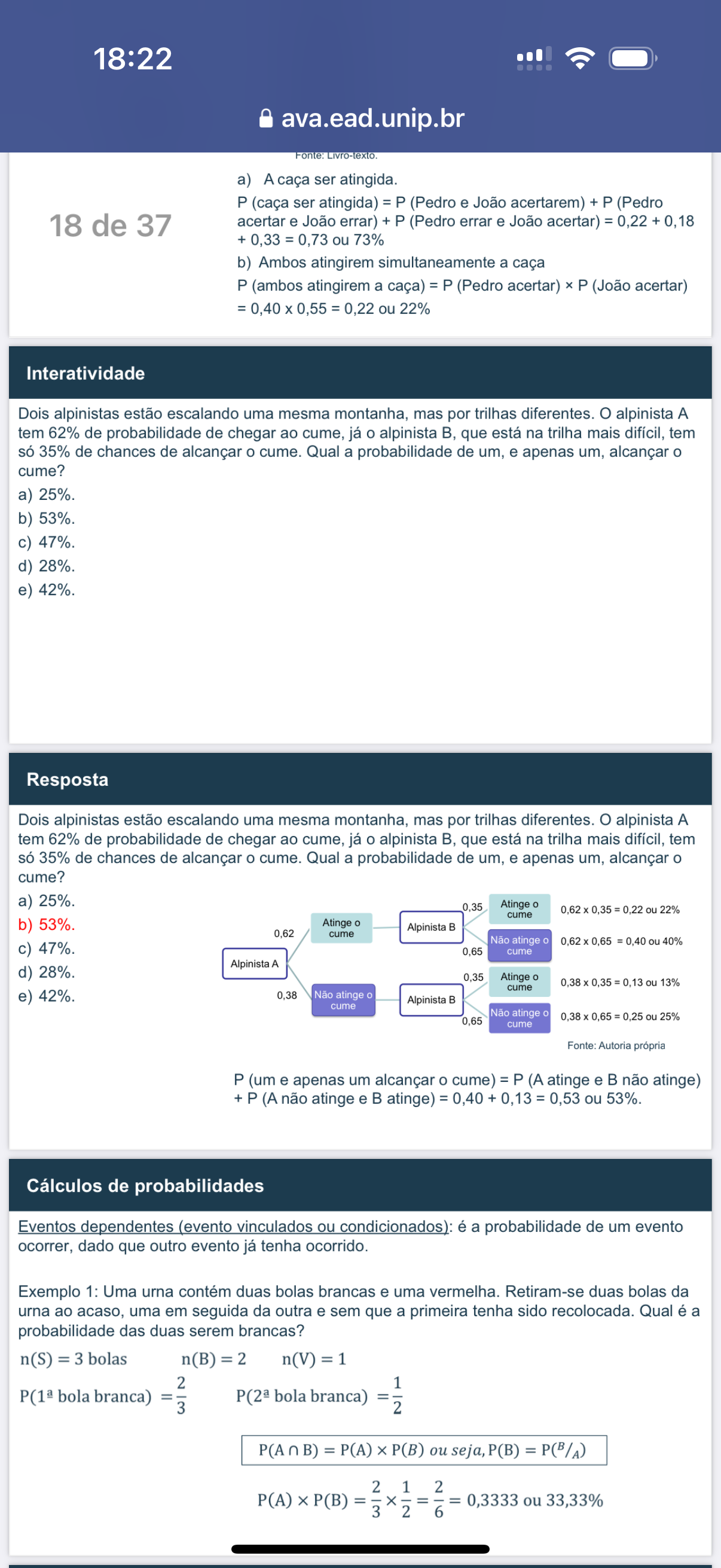 18:22 ava.ead.unip.br Fonte: a) A caça ser atingida. P (caça ser atingida) = P (Pedro e João acertarem) + P (Pedro 18 de 37 acertar e João errar) + P (Pedro errar e João acertar) = 0,22 + 0,18 ou 73% b) Ambos atingirem simultaneamente a caça P (ambos atingirem a caça) = P (Pedro acertar) P (João acertar) 0,22 ou 22% Interatividade Dois alpinistas estão escalando uma mesma montanha, mas por trilhas diferentes. alpinista A tem 62% de probabilidade de chegar ao cume, já o alpinista B, que está na trilha mais difícil, tem só 35% de chances de alcançar o cume. Qual a probabilidade de um, e apenas um, alcançar o cume? a) b) c) d) e) Resposta Dois alpinistas estão escalando uma mesma montanha, mas por trilhas diferentes. alpinista A tem 62% de probabilidade de chegar ao cume, já o alpinista B, que está na trilha mais difícil, tem só 35% de chances de alcançar o cume. Qual a probabilidade de um, e apenas um, alcançar o cume? a) 0.35 Atinge o 0,62 0,35 = 0,22 ou 22% cume b) 53%. Atinge o Alpinista B 0,62 cume Não atinge 0.62 0,65 = ou 40% c) 47%. 0.65 cume Alpinista A d) 28%. Atinge o 0,35 ou 13% cume e) 42%. Não atinge Alpinista B cume Não atinge 0.65 0,65 ou 25% cume Fonte: Autoria própria P (um e apenas um alcançar o cume) = P (A atinge e B não atinge) + P (A não atinge e B atinge) = 0,40 + 0,13 = 0,53 ou 53%. Cálculos de probabilidades Eventos dependentes (evento vinculados ou condicionados): é a probabilidade de um evento ocorrer, dado que outro evento já tenha ocorrido. Exemplo 1: Uma urna contém duas bolas brancas e uma vermelha. Retiram-se duas bolas da urna ao acaso, uma em seguida da outra e sem que a primeira tenha sido recolocada. Qual é a probabilidade das duas serem brancas? n(S) = 3 bolas = 2 bola branca) = 3 2 ou seja, P(B) = P(B/A) 2 1 2 = = 0,3333 ou 33,33% 3 6
