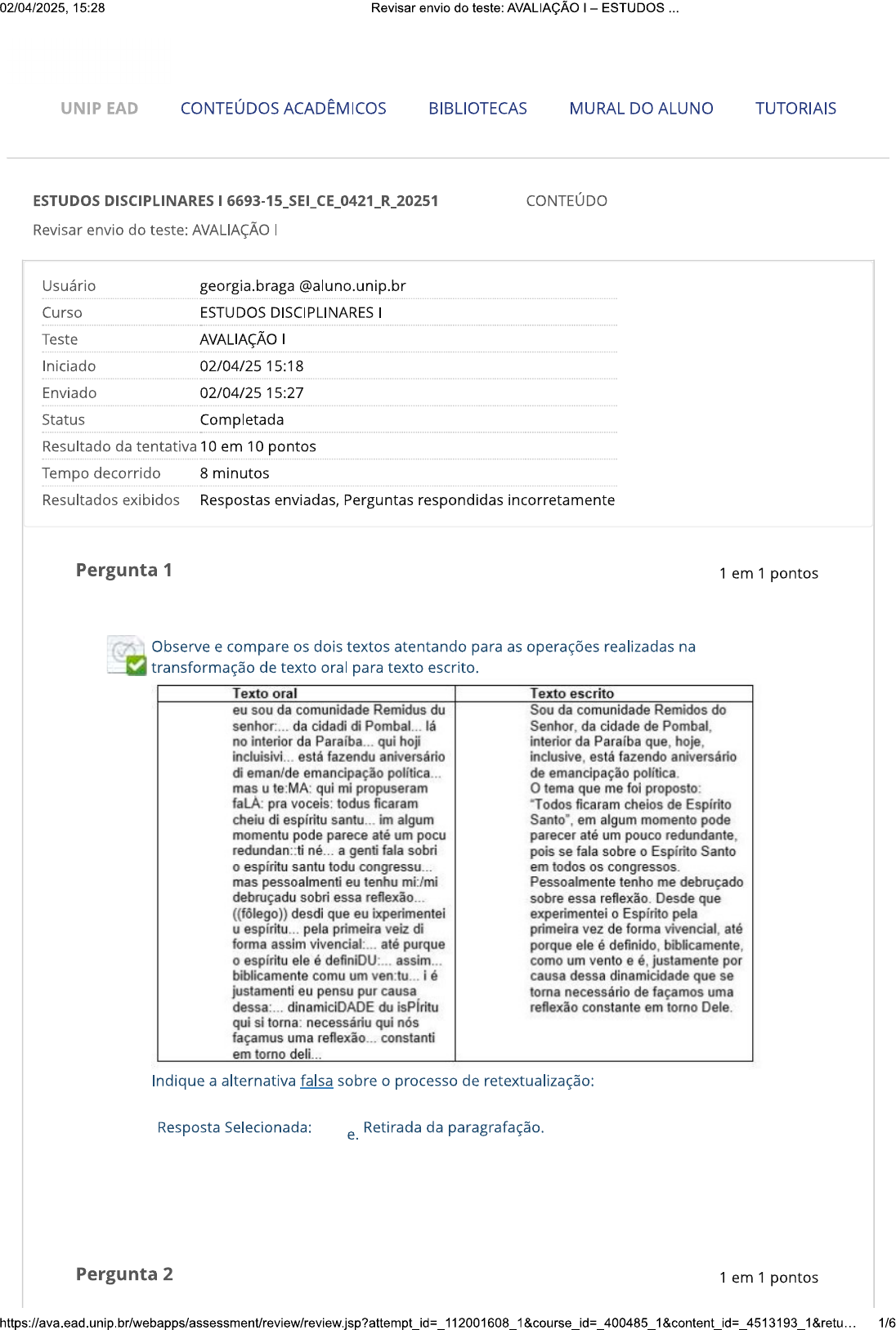 02/04/2025, 15:28 Revisar envio do teste: AVALIAÇÃO ESTUDOS UNIP EAD CONTEÚDOS ACADÊMICOS BIBLIOTECAS MURAL DO ALUNO TUTORIAIS ESTUDOS DISCIPLINARES CONTEÚDO Revisar envio do teste: AVALIAÇÃO Usuário georgia.braga@aluno.unip.br Curso ESTUDOS DISCIPLINARES Teste AVALIAÇÃO Iniciado 02/04/25 15:18 Enviado 02/04/25 15:27 Status Completada Resultado da tentativa 10 em 10 pontos Tempo decorrido 8 minutos Resultados exibidos Respostas enviadas, Perguntas respondidas incorretamente Pergunta 1 1 em 1 pontos Observe e compare os dois textos atentando para as operações realizadas na transformação de texto oral para texto escrito. Texto oral Texto escrito eu sou da comunidade Remidus du Sou da comunidade Remidos do da cidadi di lá Senhor, da cidade de no interior da qui hoji interior da Paraíba que, hoje, incluisivi... está fazendu aniversário está fazendo aniversário di eman/de emancipação de emancipação mas u te:MA: qui mi propuseram o tema que me foi proposto: faLA: pra voceis: todus ficaram "Todos ficaram cheios de cheiu di santu... algum em algum momento pode momentu pode parece até um pocu parecer até um pouco redundante, né... a genti fala sobri pois se fala sobre Santo santu todu congressu.. em todos os congressos. mas pessoalmenti eu tenhu mi:/mi Pessoalmente tenho me debruçado debruçadu sobri essa reflexão. sobre essa reflexão. Desde que ((fôlego)) desdi que eu o pela u pela primeira veiz di primeira vez de forma vivencial, até forma assim vivencial: até purque porque ele é biblicamente, ele é definiDU: assim como um vento e é, justamente por biblicamente comu um i é causa dessa dinamicidade que se justamenti eu pensu pur causa torna necessário de façamos uma dinamiciDADE du isPiritu reflexão constante em torno Dele. qui si torna: necessáriu qui nós façamus uma reflexão. constanti em torno deli... Indique a alternativa falsa sobre o processo de retextualização: Resposta Selecionada: Retirada da paragrafação. e. Pergunta 2 1 em 1 pontos02/04/2025, 15:28 Revisar envio do teste: AVALIAÇÃO ESTUDOS Análise linguística objetiva ampliar a consciência dos alunos sobre os fenômenos gramaticais e textual-discursivos. Inclui tanto o trabalho sobre questões tradicionais de gramática quanto questões mais amplas sobre textos. Indique V (verdadeiro) ou F (falso) sobre a análise linguística. I. Integração da análise linguística com a leitura e a produção de textos. II. Trabalho de reflexão sobre o uso dos recursos linguísticos em casos particulares no texto. III. Ênfase nos efeitos de sentido associado aos gêneros textuais. IV. Dissociação entre habilidades epilinguísticas (reflexão sobre uso) e metalinguísticas (reflexão descritiva). Assinale a alternativa correta: Resposta Selecionada: e. Pergunta 3 1 em 1 pontos Leia o texto e considere as afirmativas a seguir. Foi horrivel mas ele ta bem? sem sequelas No hospital tirou raio x E descobriram que a bala não entrou Ele ficou machucado até há poucos dias Agora está com cicatriz parecida com a do Harry Potter CIF Fonte: a autora linguista Marcuschi estudou a representatividade da oralidade no ensino e na aprendizagem de língua, considerando os seus níveis de formalidade. A presença da oralidade em textos escritos pode revelar uma relação importante para o processo de aquisição da escrita. texto anterior é exemplo dessa questão, uma vez que, muitas vezes, recorre a recursos típicos da oralidade para a representação escrita. Portanto, podemos considerar que, segundo Marcuschi: I. O estudo da oralidade permite-nos perceber as diferenças e as semelhanças da oralidade e da escrita. II. estudo da oralidade revela as várias possibilidades de avaliação da diversidade do texto, tanto oral quanto escrito, por meio de processos de contextualização. III. estudo da oralidade instiga a valorização dos aspectos dicotômicos de dois polos opostos da língua. IV. estudo da oralidade é o desafio do ensino, uma vez que evidencia a importância do papel da língua falada no que diz respeito à produção textual e evita o preconceito linguístico. Indique a alternativa correta: 2/602/04/2025, 15:28 Revisar envio do teste: AVALIAÇÃO - ESTUDOS Resposta Selecionada: d. I, II e IV estão corretas. Pergunta 4 1 em 1 pontos "eu gostava muito de passeá... saí com as minhas colegas... brincá na porta di casa di vôlei... andá de patins... bicicleta... quando eu levava um tombo ou outro... eu era a::... a palhaça da turma... ((risos))... eu acho que foi uma das fases mais... assim... gostosas da minha vida foi... essa fase de quinze... dos meus treze aos dezessete anos..." (A.P.S., sexo feminino, 38 anos, nível de Ensino Fundamental. Projeto Fala Goiana, UFG. 2010.) relato pessoal de A.P.S. está na modalidade falada da língua. Seu relato oral constitui-se de: Resposta Selecionada: C. Predomínio de linguagem informal entrecortada por pausas. Pergunta 5 1 em 1 pontos Inovação gráfica que resiste e ainda encanta LIVRO livro inclinado, de Peter Newell, Editora Cosac Naify, 48 páginas "Ao encontrar numa livraria um exemplar de livro inclinado, de Peter Newell, recém- lançado pela Cosac Naify, o leitor ficará encantado, em primeiro lugar com o formato inusitado da obra, autoexplicativo. Embora as prateleiras dedicadas à área infantojuvenil estejam abarrotadas de edições sofisticadíssimas visualmente, livro inclinado ainda se destaca com charme Ao abrir o exemplar, outro encantamento: a confusão provocada por um carrinho de bebê desgovernado ladeira abaixo e contada num texto leve, acompanhado de lindíssimas ilustrações (também do autor), que revelam um perfeito casamento entre forma e conteúdo. A maior surpresa, porém, virá no final do volume, onde está impressa a data original de publicação da obra: 1910. A ousadia gráfica de livro inclinado hoje pode ser considerada corriqueira num mercado que valoriza cada vez mais (ainda bem) o design adequado ao texto