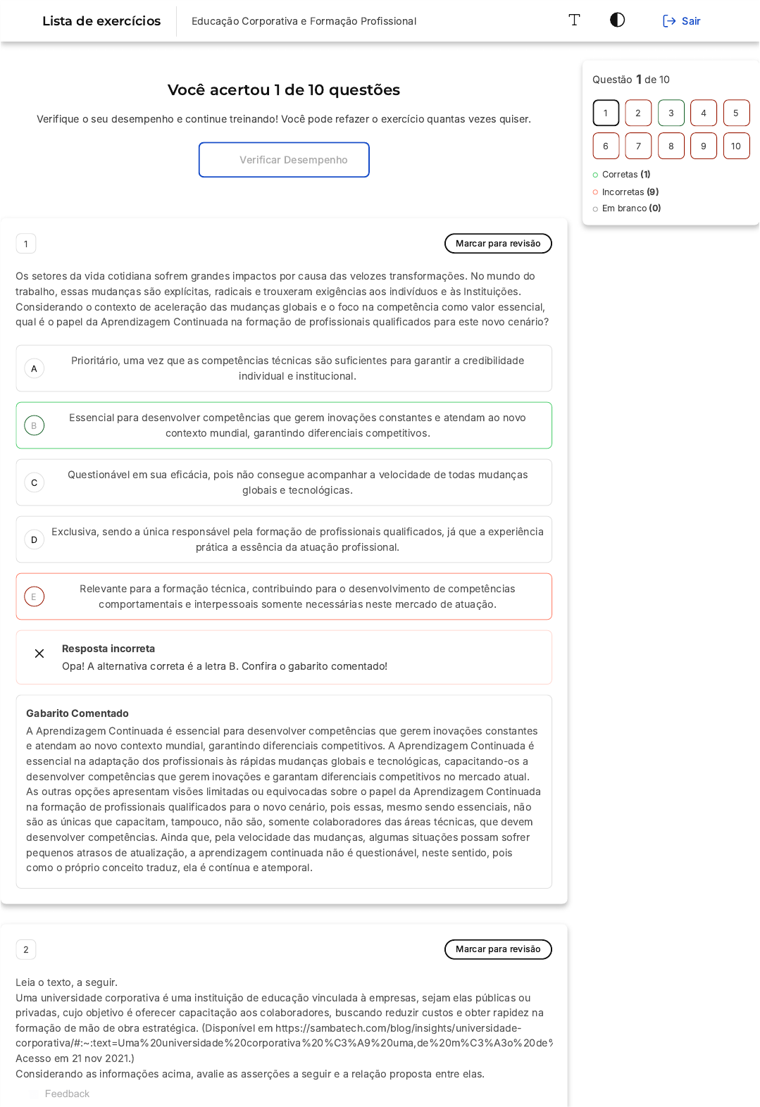 Você acertou 1 de 10 questões Verifique o seu desempenho e continue treinando! Você pode refazer o exercício quantas vezes quiser. Verificar Desempenho A B C D E 1 Marcar para revisão Os setores da vida cotidiana sofrem grandes impactos por causa das velozes transformações. No mundo do trabalho, essas mudanças são explícitas, radicais e trouxeram exigências aos indivíduos e às Instituições. Considerando o contexto de aceleração das mudanças globais e o foco na competência como valor essencial, qual é o papel da Aprendizagem Continuada na formação de profissionais qualificados para este novo cenário? Prioritário, uma vez que as competências técnicas são suficientes para garantir a credibilidade individual e institucional. Essencial para desenvolver competências que gerem inovações constantes e atendam ao novo contexto mundial, garantindo diferenciais competitivos. Questionável em sua eficácia, pois não consegue acompanhar a velocidade de todas mudanças globais e tecnológicas. Exclusiva, sendo a única responsável pela formação de profissionais qualificados, já que a experiência prática a essência da atuação profissional. Relevante para a formação técnica, contribuindo para o desenvolvimento de competências comportamentais e interpessoais somente necessárias neste mercado de atuação. Resposta incorreta Opa! A alternativa correta é a letra B. Confira o gabarito comentado! Gabarito Comentado A Aprendizagem Continuada é essencial para desenvolver competências que gerem inovações constantes e atendam ao novo contexto mundial, garantindo diferenciais competitivos. A Aprendizagem Continuada é essencial na adaptação dos profissionais às rápidas mudanças globais e tecnológicas, capacitando-os a desenvolver competências que gerem inovações e garantam diferenciais competitivos no mercado atual. As outras opções apresentam visões limitadas ou equivocadas sobre o papel da Aprendizagem Continuada na formação de profissionais qualificados para o novo cenário, pois essas, mesmo sendo essenciais, não são as únicas que capacitam, tampouco, não são, somente colaboradores das áreas técnicas, que devem desenvolver competências. Ainda que, pela velocidade das mudanças, algumas situações possam sofrer pequenos atrasos de atualização, a aprendizagem continuada não é questionável, neste sentido, pois como o próprio conceito traduz, ela é contínua e atemporal. 2 Marcar para revisão Leia o texto, a seguir. Uma universidade corporativa é uma instituição de educação vinculada à empresas, sejam elas públicas ou privadas, cujo objetivo é oferecer capacitação aos colaboradores, buscando reduzir custos e obter rapidez na formação de mão de obra estratégica. (Disponível em https://sambatech.com/blog/insights/universidade- corporativa/#:~:text=Uma%20universidade%20corporativa%20%C3%A9%20uma,de%20m%C3%A3o%20de% Acesso em 21 nov 2021.) Considerando as informações acima, avalie as asserções a seguir e a relação proposta entre elas. Questão 1 de 10 Corretas (1) Incorretas (9) Em branco (0) 1 2 3 4 5 6 7 8 9 10 Lista de exercícios Educação Corporativa e Formação Profissional Sair Feedback A B C D E A B C D E A Universidade Corporativa nasce da ideia de que a aprendizagem ao longo da vida pode alavancar uma maior integração entre os colaboradores e a estratégia de competitividade no mercado contemporâneo. PORQUE A Universidade Corporativa propõe um modelo de aprendizagem baseado na memorização das atividades e na troca de conhecimentos entre os colaboradores. A respeito dessas asserções, assinale a opção correta. As duas afirmações estão corretas e a segunda não justifica a primeira. A primeira afirmativa está correta e a segunda justifica a primeira. A primeira afirmativa está correta e a segunda está incorreta. As duas afirmações estão incorretas. As duas afirmações estão corretas e a segunda justifica a primeira. Resposta incorreta Opa! A alternativa correta é a letra C. Confira o gabarito comentado! Gabarito Comentado A primeira afirmativa está correta e, a segunda está incorreta. A Universidade Corporativa consiste em proposta de aprendizagem continuada e, por esta razão, não é razoável que ela promova cursos que se baseiem em memorização. Ao contrário, ela precisa acompanhar as inovações e propor um processo de aprendizagem baseado nas competências necessárias ao seu desenvolvimento e dos funcionários. 3 Marcar para revisão Empregabilidade e Empresabilidade são dois conceitos importantes na reflexão acerca das novas demandas e reflexões sobre o trabalho. A empregabilidade está relacionada à capacidade de conseguir um emprego e de se manter empregado. Já o conceito de empresabilidade está ligado à I. estratégia da empresa para aperfeiçoamento corporativo objetivando melhor visibilidade e respeitabilidade com reconhecimento do diferenciado no mercado de trabalho. II. capacidade de as empresas reterem seus colaboradores que mais se dedicam restritamente a aperfeiçoamento técnico. III. empresa que, por investir na capacidade intelectual e técnica de seus funcionários, passa a ser cobiçada como local de trabalho. É correto o que se afirma em I e III, apenas. I e II, apenas. II e III, apenas. II, apenas. III, apenas. Resposta correta Parabéns, você selecionou a alternativa correta. Confira o gabarito comentado! Gabarito Comentado A B C D E O conceito de empresabilidade está diretamente ligado à estratégia da empresa para aperfeiçoamento corporativo, visando melhor visibilidade e respeitabilidade no mercado de trabalho, conforme afirmado na alternativa I. Além disso, a empresabilidade também se refere à capacidade de uma empresa em se tornar desejável como local de trabalho, devido ao investimento na capacidade intelectual e técnica de seus funcionários, como mencionado na alternativa III. Portanto, as afirmações corretas são as presentes nas 