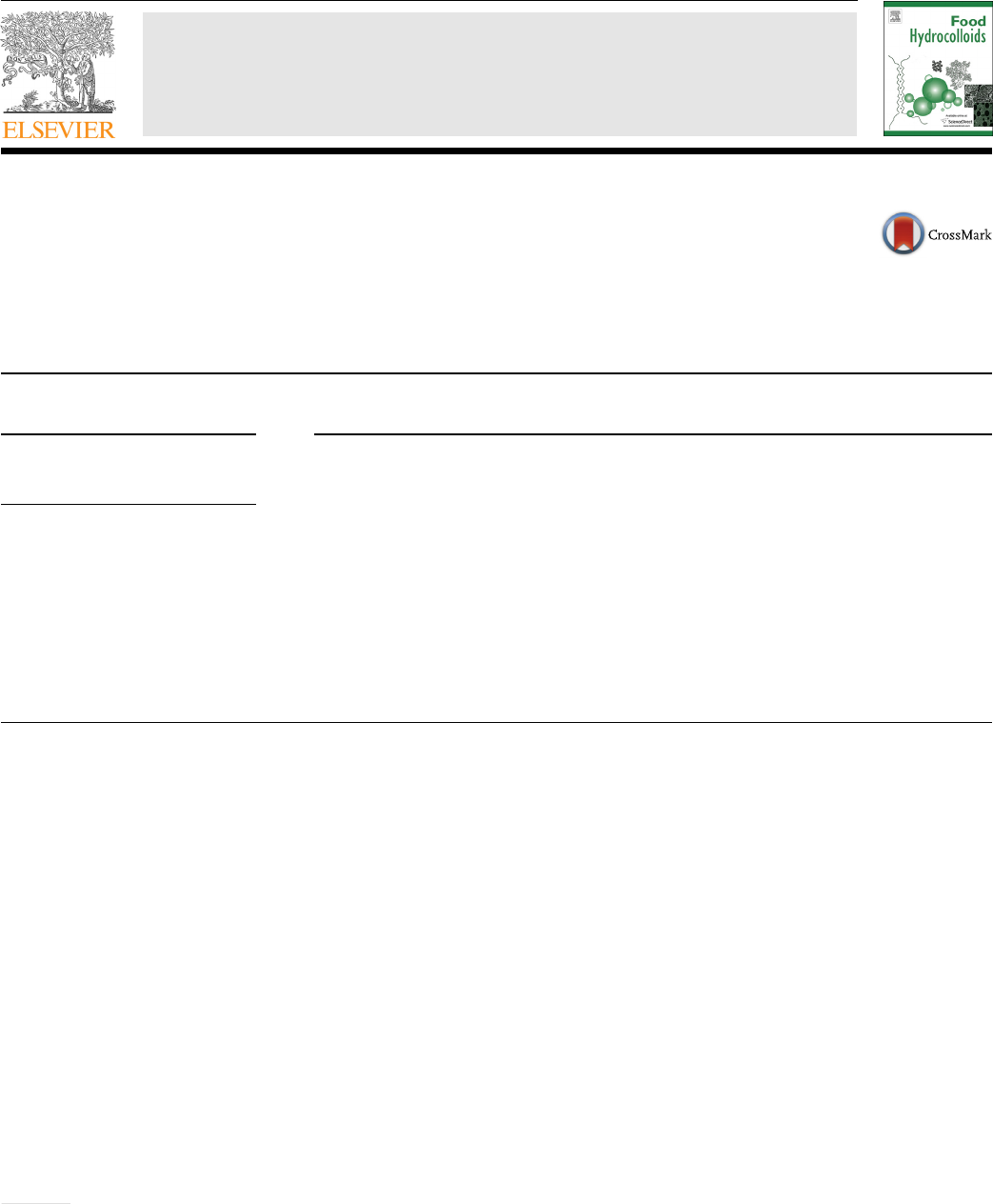 lable at ScienceDirect Food Hydrocolloids 37 (2014) 134e142 Contents lists avai Food Hydrocolloids journal homepage: www.elsevier .com/locate/ foodhyd Flavour encapsulation in milk proteins e CMC coacervate-type complexes T. Koupantsis a, E. Pavlidou b, A. Paraskevopoulou a,* a Laboratory of Food Chemistry and Technology, School of Chemistry, Aristotle University of Thessaloniki, 541 24 Thessaloniki, Greece b Solid State Physics Section, Physics Department, Aristotle University of Thessaloniki, 541 24 Thessaloniki, Greece a r t i c l e i n f o Article history: Received 2 July 2013 Accepted 31 October 2013 Keywords: Flavour encapsulation Complex coacervation Sodium caseinate Whey protein Carboxymethylcellulose Response surface methodology * Corresponding author. Tel.: þ30 2 31 0 997832; fa E-mail address: adparask@chem.auth.gr (A. Parask 0268-005X/$ e see front matter � 2013 Elsevier Ltd. http://dx.doi.org/10.1016/j.foodhyd.2013.10.031 a b s t r a c t Beta-pinene containing microcapsules were prepared by complex coacervation of milk proteins, i.e so- dium caseinate (CN) and whey protein isolate (WPI), with carboxymethylcellulose (CMC). Milk proteins e CMC interactions were followed by z-potential measurements, while the initial emulsions were characterised for droplet size and biopolymer amount present at the oil/water interface. Response sur- face methodology was applied to investigate the effects of encapsulation processing variables, including protein/polysaccharide (pr/pl) ratio and volatile compound’s mass, on encapsulation yield, loading and efficiency as well as the morphological characteristics of the produced microcapsules. The obtained results revealed that it was possible to encapsulate b-pinene with milk proteins and CMC by complex coacervation, while most of the characteristics evaluated were affected by the process variables. Co- acervates prepared at the highest pr/pl ratio of 6.99 and b-pinene mass (6.99 g) were the most effective in encapsulating the flavour compound, something that was more evident in the case of WPIeCMC mixture. Additionally, microcapsule structure, evaluated by Scanning Electron Microscopy analysis, was noticeably affected by the protein/polysaccharide ratio being compact when pr/pl was low and “spongy”- like when it was high. � 2013 Elsevier Ltd. All rights reserved. 1. Introduction Proteinepolysaccharide interactions have found diverse appli- cations in food sector, such as in food colloidal systems formation, fat substitution, protein recovery from fluid by-products and encapsulation (Damianou & Kiosseoglou, 2006; Dickinson, 2003; Kika, Korlos, & Kiosseoglou, 2007; Paraskevopoulou & Kiosseoglou, 2013). Among them, biopolymer-based encapsula- tion of various ingredients (flavours, vitamins, antioxidants, etc.) offers many advantages in view of protection from losses and environmental factors, unpleasant tastes’ masking, liquid conver- sion to more convenient solid materials and controlled release (Nori et al., 2011; Qv, Zeng, & Jiang, 2011; Zhang, Pan, & Chung, 2011). In the case of flavour compounds, encapsulation provides an effective way for their stability reinforcement through elimi- nation of problems associated with their exposure to air, light, heat and moisture. It is based on the formation of a coating layer (wall material) to encapsulate flavour droplets or particles (core mate- rial). Proteinepolysaccharide complex coacervation is the process x: þ30 231 0 997847, 997779. evopoulou). All rights reserved. most commonly used for this purpose. It is, almost entirely, accomplished when two oppositely charged biopolymer molecules are mixed at a pH below the protein isoelectric point (pI) leading to the formation of a complex, i.e. coacervate, which precipitates retaining at the same time the aroma material at the coacervate phase. The success of the process is mainly affected by pH manip- ulation. More specifically, a soluble proteinepolysaccharide com- plex is firstly formed followed by complex coacervation and/or precipitation upon further lowering of pH, attributed to the mod- ulation of initial repulsive proteinepolysaccharide interactions into net attractive ones (Paraskevopoulou & Kiosseoglou, 2013). Flavour encapsulation by complex coacervation of proteins with a number of charge-carrying polysaccharides has been the subject of some recently published research papers (Jun-xia, Hai-yan, & Jian, 2011; Leclercq, Harlander, & Reineccius, 2009; Prata, Zanin, Ré, & Grosso, 2008; Yeo, Bellas, Firestone, Langer, & Kohane, 2005). In these studies, various combinations including gelatine or soybean protein isolate with gum arabic, xanthan or pectin have been used for the encapsulation of essential oils or individual flavour compounds. In the present study milk proteins, i.e. sodium caseinate and whey protein isolate, were employed in admixture with carboxy- methylcellulose. Milk proteins are commonly used in the food in- dustry for their excellent functional (emulsion preparation and Delta:1_given name Delta:1_surname Delta:1_given name mailto:adparask@chem.auth.gr http://crossmark.crossref.org/dialog/?doi=10.1016/j.foodhyd.2013.10.031&domain=pdf www.sciencedirect.com/science/journal/0268005X http://www.elsevier.com/locate/foodhyd http://dx.doi.org/10.1016/j.foodhyd.2013.10.031 http://dx.doi.org/10.1016/j.foodhyd.2013.10.031 http://dx.doi.org/10.1016/j.foodhyd.2013.10.031 T. Koupantsis et al. / Food Hydrocolloids 37 (2014) 134e142 135 stabilisation, water and fat binding, thickening, gelation) and nutritional properties. CN is composed of a mixture of four phos- phoproteins, namely as1-, as2-, b- and k-casein. Their highly disor- dered and hydrophobic character is considered to be responsible for sodium caseinate’s rapid absorption to the oilewater interface during emulsification as well as stabilisation of oil droplets against flocculation and coalescence (Dickinson, 1997). The major compo- nent of WPI is b-lactoglobulin, a globu