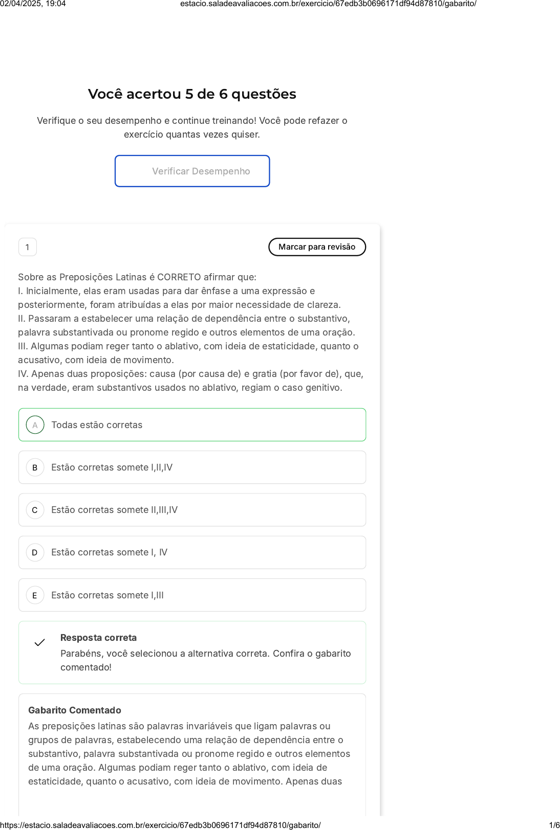 Você acertou 5 de 6 questões Verifique o seu desempenho e continue treinando! Você pode refazer o exercício quantas vezes quiser. Verificar Desempenho A B C D E 1 Marcar para revisão Sobre as Preposições Latinas é CORRETO afirmar que: I. Inicialmente, elas eram usadas para dar ênfase a uma expressão e posteriormente, foram atribuídas a elas por maior necessidade de clareza. II. Passaram a estabelecer uma relação de dependência entre o substantivo, palavra substantivada ou pronome regido e outros elementos de uma oração. III. Algumas podiam reger tanto o ablativo, com ideia de estaticidade, quanto o acusativo, com ideia de movimento. IV. Apenas duas proposições: causa (por causa de) e gratia (por favor de), que, na verdade, eram substantivos usados no ablativo, regiam o caso genitivo. Todas estão corretas Estão corretas somete I,II,IV Estão corretas somete II,III,IV Estão corretas somete I, IV Estão corretas somete I,III Resposta correta Parabéns, você selecionou a alternativa correta. Confira o gabarito comentado! Gabarito Comentado As preposições latinas são palavras invariáveis que ligam palavras ou grupos de palavras, estabelecendo uma relação de dependência entre o substantivo, palavra substantivada ou pronome regido e outros elementos de uma oração. Algumas podiam reger tanto o ablativo, com ideia de estaticidade, quanto o acusativo, com ideia de movimento. Apenas duas 02/04/2025, 19:04 estacio.saladeavaliacoes.com.br/exercicio/67edb3b0696171df94d87810/gabarito/ https://estacio.saladeavaliacoes.com.br/exercicio/67edb3b0696171df94d87810/gabarito/ 1/6 A B C D E proposições: causa (por causa de) e gratia (por favor de), que, na verdade, eram substantivos usados no ablativo, regiam o caso genitivo. ----- 2 Marcar para revisão Sobre as Preposições Latinas é INCORRETO afirmar que: São, em grande parte, antigos pronomes ou partículas que não alteram a estrutura da Língua. Não há relevância para a história do latim. Inicialmente, elas eram usadas para dar ênfase a uma expressão e posteriormente, foram atribuídas a elas por maior necessidade de clareza. Passaram a estabelecer uma relação de dependência entre o substantivo, palavra substantivada ou pronome regido e outros elementos de uma oração. Algumas podiam reger tanto o ablativo, com ideia de estaticidade, quanto o acusativo, com ideia de movimento. Apenas duas proposições: causa (por causa de) e gratia (por favor de), que, na verdade, eram substantivos usados no ablativo, regiam o caso genitivo. Resposta incorreta Opa! A alternativa correta é a letra A. Confira o gabarito comentado! Gabarito Comentado As preposições latinas são, em grande parte, antigos advérbios ou partículas independentes. Inicialmente, elas eram usadas para dar ênfase a uma expressão, pois os casos indicavam relações de lugar, tempo, causa e modo, que, posteriormente, foram atribuídas a elas por maior necessidade de clareza. Assim, as preposições passaram a estabelecer uma relação de dependência entre o substantivo, palavra substantivada ou pronome regido e outros elementos de uma oração. 3 Marcar para revisão Esses pronomes servem para introduzir orações adjetivas, substituindo substantivos expressos na oração principal. Como pronomes, além de Questão 2 de 6 Corretas (5) Incorretas (1) Em branco (0) 1 2 3 4 5 6 Lista de exercícios Conteúdo Sair 02/04/2025, 19:04 estacio.saladeavaliacoes.com.br/exercicio/67edb3b0696171df94d87810/gabarito/ https://estacio.saladeavaliacoes.com.br/exercicio/67edb3b0696171df94d87810/gabarito/ 2/6 A B C D E A B funcionar como conectivos, exercem também uma função sintática específica na oração adjetiva que introduzem. Essa definição se refere aos Pronomes: Possessivos Relativos Interrogativos Demonstrativos Indefinidos Resposta correta Parabéns, você selecionou a alternativa correta. Confira o gabarito comentado! Gabarito Comentado Os pronomes relativos servem para introduzir orações adjetivas, substituindo substantivos expressos na oração principal. Como pronomes, além de funcionar como conectivos, exercem também uma função sintática específica na oração adjetiva que introduzem. O pronome relativo mais usado em latim, é qui, quae, quod (que), que concorda em gênero e número com o substantivo a que se refere. Como os pronomes demonstrativos, também faz o genitivo singular em ¿ius e o dativo singular em ¿i. Apresentando, ainda, uma modificação no radical desses dois casos, fazendo, respectivamente cuius e cui. É bom lembrar que a concordância em caso não existe, pois o caso do pronome relativo depende do verbo da oração adjetiva. 4 Marcar para revisão Os pronomes, apesar de pertencerem à classe dos nomes, têm a particularidade de possuir um significado próprio e substituir um substantivo (pronomes substantivos), modificá-lo ou determiná-lo (pronome adjetivo). Em latim, há seis subclasses pronominais: Pessoais, Possessivos, Demonstrativos, Relativos, Interrogativos, Indefinidos Impessoais, Possessivos, Demonstrativos, Relativos, Interrogativos, Definidos 02/04/2025, 19:04 estacio.saladeavaliacoes.com.br/exercicio/67edb3b0696171df94d87810/gabarito/ https://estacio.saladeavaliacoes.com.br/exercicio/67edb3b0696171df94d87810/gabarito/ 3/6 C D E A B C D E Pessoais, Interrogativos, Demonstrativos, Relativos, Definidos, Indefinidos Possessivos, Demonstrativos, Absolutos, Relativos, Interrogativos, Definidos Pessoais, Conclusivos, Demonstrativos, Relativos, exclamativos, Indefinidos Resposta correta Parabéns, você selecionou a alternativa correta. Confira o gabarito comentado! Gabarito Comentado Em latim, há seis subclasses pronominais Todos eles são declináveis. os pronomes podem estar ligados às três pessoas do discurso: Primeira, que fala; Segunda, com quem se fala; Terceira, de quem se fala. São eles: Pessoais, Possessivos, Demonstrativos, Relativos, Interrogativos, Indefinidos. 5 Marcar para revisão Esses pro