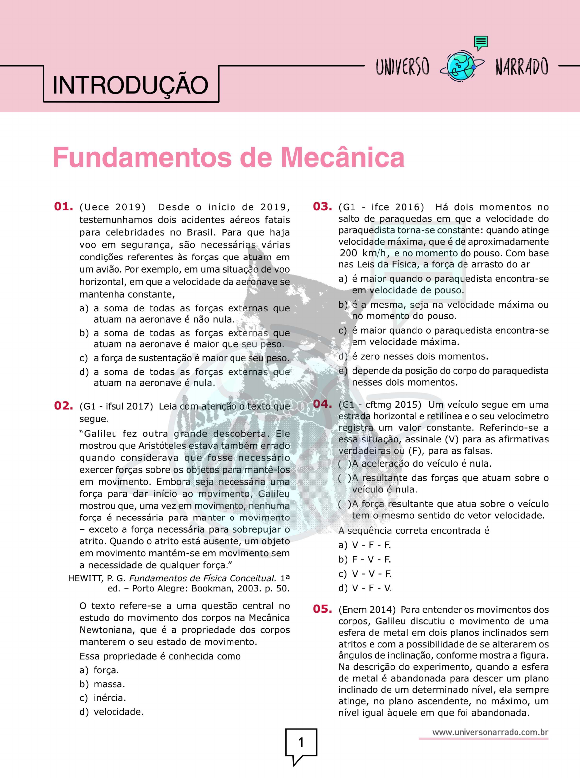 UNIVERSO NARRADO INTRODUÇÃO Fundamentos de Mecânica 01. (Uece 2019) Desde o início de 2019, 03. (G1 ifce 2016) Há dois momentos no testemunhamos dois acidentes aéreos fatais salto de paraquedas em que a velocidade do para celebridades no Brasil. Para que haja paraquedista torna-se constante: quando atinge voo em segurança, são necessárias várias velocidade máxima, que é de aproximadamente condições referentes às forças que atuam em 200 km/h, e no momento do pouso. Com base um avião. Por exemplo, em uma situação de nas Leis da Física, a força de arrasto do an horizontal, em que a velocidade da aeronave se a) é maior quando o paraquedista encontra-se mantenha constante, em velocidade de pouso a) a soma de todas as forças externas que b) é a mesma, seja na velocidade máxima ou atuam na aeronave é não nula. no momento do pouso. b) a soma de todas as forças externas que c) é maior quando o paraquedista encontra-se atuam na aeronave é maior que seu peso. em velocidade máxima. c) a força de sustentação é maior que seu peso. d) é zero nesses dois momentos. d) a soma de todas as forças externas que e) depende da posição do corpo do paraquedista atuam na aeronave é nula. nesses dois momentos. 02. (G1 ifsul 2017) Leia com atenção o texto que 04. (G1 cftmg 2015) Um veículo segue em uma estrada horizontal e retilínea e o seu velocímetro segue. registra um valor constante. Referindo-se a "Galileu fez outra grande descoberta. Ele essa situação, assinale (V) para as afirmativas mostrou que Aristóteles estava também errado verdadeiras ou (F), para as falsas. quando considerava que fosse necessário ( A aceleração do veículo é nula. exercer forças sobre os objetos para mantê-los em movimento. Embora seja necessária uma ( ) A resultante das forças que atuam sobre o veículo é nula. força para dar início ao movimento, Galileu mostrou que, uma vez em movimento, nenhuma ( )A força resultante que atua sobre o veículo força é necessária para manter o movimento tem o mesmo sentido do vetor velocidade. exceto a força necessária para sobrepujar o A sequência correta encontrada é atrito. Quando o atrito está ausente, um objeto a) V F F. em movimento mantém-se em movimento sem b) F V F. a necessidade de qualquer força." HEWITT, P. G. Fundamentos de Física Conceitual. c) V V F. ed. Porto Alegre: Bookman, 2003. p. 50. d) V F V. texto refere-se a uma questão central no 05. (Enem 2014) Para entender os movimentos dos estudo do movimento dos corpos na Mecânica corpos, Galileu discutiu o movimento de uma Newtoniana, que é a propriedade dos corpos esfera de metal em dois planos inclinados sem manterem o seu estado de movimento. atritos e com a possibilidade de se alterarem os Essa propriedade é conhecida como ângulos de inclinação, conforme mostra a figura. a) força. Na descrição do experimento, quando a esfera de metal é abandonada para descer um plano b) massa. inclinado de um determinado nível, ela sempre c) inércia. atinge, no plano ascendente, no máximo, um d) velocidade. nível igual em que foi abandonada. www.universonarrado.com.br 1Fundamentos de Mecânica 07. (G1 - cftmg 2013) Nivel de abandono da esfera do plano de do plano de subida descida plano inclinado Disponível www Acesso em 21 ago 2012 Se o ângulo de inclinação do plano de subida for reduzido a zero, a esfera a) manterá sua velocidade constante, pois o impulso resultante sobre ela será nulo. b) manterá sua velocidade constante, pois o MORREU impulso da descida continuará a empurrá-la. DE c) diminuirá gradativamente a sua velocidade, pois não haverá mais impulso para empurrá- la. DE INÉRCIA d) diminuirá gradativamente a sua velocidade, pois o impulso resultante será contrário ao seu movimento. Disponível em: blogspot Acesso em: 01 out e) aumentará gradativamente a sua velocidade, pois não haverá nenhum impulso contrário Ao analisar a situação representada na tirinha ao seu movimento. acima, quando o motorista freia subitamente, o passageiro 06. (Uerj 2014) A imagem abaixo ilustra uma bola a) mantém-se em repouso e o para-brisa colide de ferro após ser disparada por um canhão contra ele. antigo. b) tende a continuar em movimento e colide contra o para-brisa. c) é empurrado para frente pela inércia e colide contra o para-brisa. d) permanece junto ao banco do veículo, por inércia, e o para-brisa colide contra ele. 08. (Enem PPL 2012) Em 1543, Nicolau Copérnico solo publicou um livro revolucionário em que propunha a Terra girando em torno do seu Desprezando-se a resistência do ar, o esquema próprio eixo e rodando em torno do Sol. Isso que melhor representa as forças que atuam contraria a concepção aristotélica, que acredita sobre a bola de ferro é: que a Terra é o centro do universo. Para os a) aristotélicos, se a Terra gira do oeste para o leste, coisas como nuvens e pássaros, que não estão presas à Terra, pareceriam estar sempre se movendo do leste para o oeste, justamente como o Sol. Mas foi Galileu Galilei que, em b) 1632, baseando-se em experiências, rebateu a crítica aristotélica, confirmando assim o sistema de Copérnico. Seu argumento, adaptado para c) a nossa época, é se uma pessoa, dentro de um vagão de trem em repouso, solta uma bola, ela cai junto a seus pés. Mas se o vagão estiver se movendo com velocidade constante, a bola d) também cai junto a seus pés. Isto porque a bola, enquanto cai, continua a compartilhar do movimento do vagão. www.universonarrado.com.br 2Introdução UNIVERSO NARRADO princípio físico usado por Galileu para rebater a) E o argumento aristotélico foi a) a lei da inércia b) ação e reação. R M c) a segunda lei de Newton. d) a conservação da energia. e) o princípio da equivalência. P 09. (Ufmg 2010) Nesta figura, está representado b) E um balão dirigível, que voa para a direita, em altitude constante e com velocidade V, também constante: R M V P c) AE R M P Sobre o balão