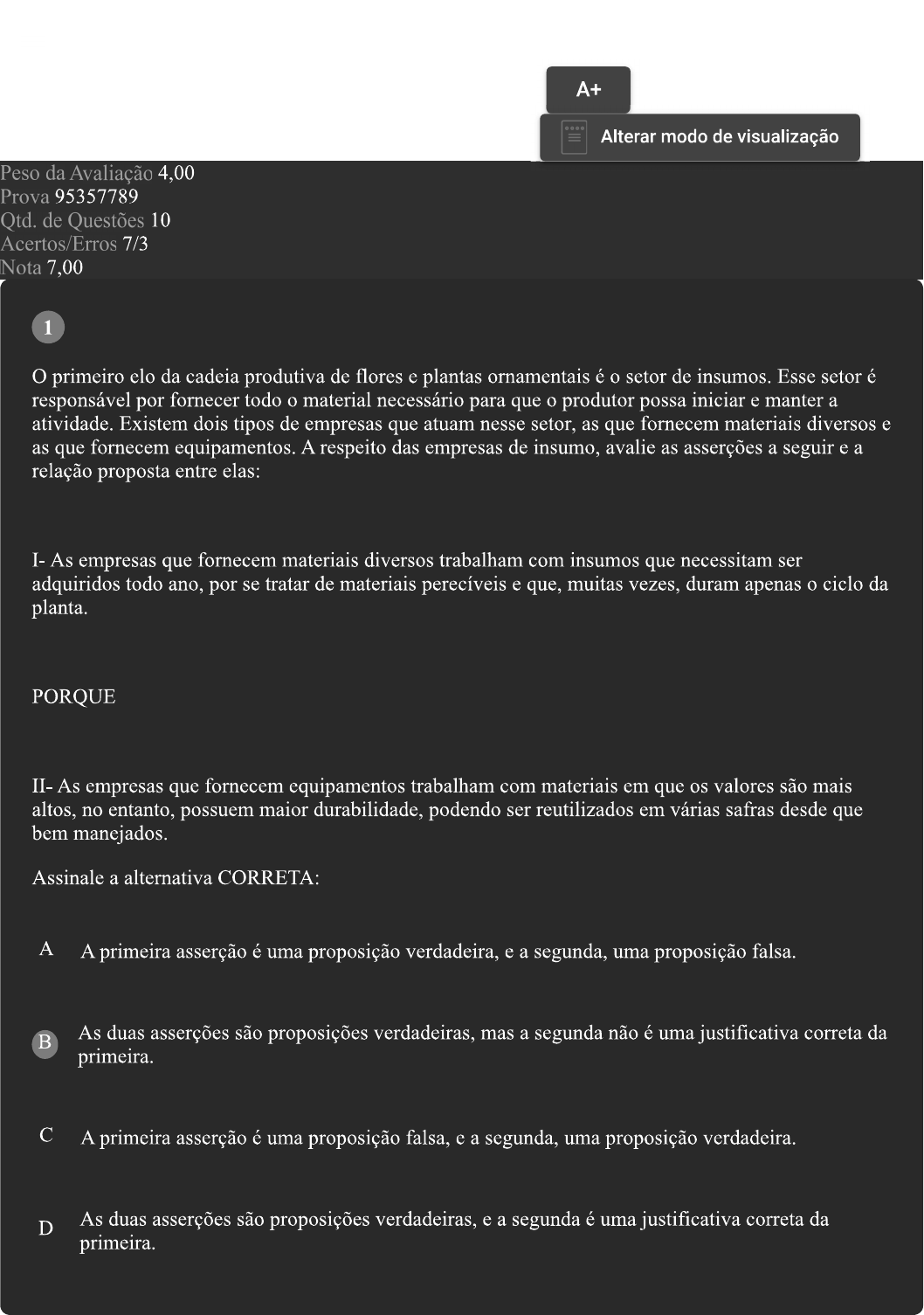 A+ Alterar modo de visualização Peso da Avaliação 4,00 Prova 95357789 Qtd. de Questões 10 Acertos/Erros 7/3 Nota 7,00 1 O primeiro elo da cadeia produtiva de flores e plantas ornamentais é setor de insumos. Esse setor é responsável por fornecer todo material necessário para que produtor possa iniciar e manter a atividade. Existem dois tipos de empresas que atuam nesse setor, as que fornecem materiais diversos e as que fornecem equipamentos. A respeito das empresas de insumo, avalie as asserções a seguir e a relação proposta entre elas: I- As empresas que fornecem materiais diversos trabalham com insumos que necessitam ser adquiridos todo ano, por se tratar de materiais perecíveis e que, muitas vezes, duram apenas ciclo da planta. PORQUE II- As empresas que fornecem equipamentos trabalham com materiais em que os valores são mais altos, no entanto, possuem maior durabilidade, podendo ser reutilizados em várias safras desde que bem manejados. Assinale a alternativa CORRETA: A A primeira asserção é uma proposição verdadeira, e a segunda, uma proposição falsa. B As duas asserções são proposições verdadeiras, mas a segunda não é uma justificativa correta da primeira. C A primeira asserção é uma proposição falsa, e a segunda, uma proposição verdadeira. D As duas asserções são proposições verdadeiras, e a segunda é uma justificativa correta da primeira.2 Os princípios de estética são utilizados para dispor os elementos naturais e arquitetônicos da melhor forma e assim tornar espaço agradável para as pessoas que frequentam. Sobre os princípios de estética, analise as sentenças a seguir: I- A mensagem utiliza linhas, formas, texturas e cores para transmitir sensações agradáveis aos frequentadores do espaço paisagístico. A escala é utilizada para dispor os elementos no jardim com base no distanciamento entre eles. III- A harmonia propõe que se faça a melhor combinação entre os elementos para que haja unidade na disposição dos diversos elementos. IV- O clímax se refere ao momento em que os usuários adentram a composição paisagística e, assim, se sentem muito Assinale a alternativa CORRETA: A Somente a sentença IV está correta. B As sentenças I, II e III estão corretas. C As sentenças II, III e IV estão corretas. D As sentenças I e IV estão corretas. Revisar Conteúdo do Livro 3 Os jardins são paisagens construídas pelo homem e, por isso, possuem relação direta com a evolução humana. Cada civilização, em seu tempo, desenvolveu seu próprio estilo de jardim, que representam a cultura de determinado povo e seu modo de vida. Sobre a evolução histórica e os estilos de jardim, classifique V para as sentenças verdadeiras e F para as falsas: ( ) Os jardins persas têm como característica a vegetação organizada em um jogo de luzes e sombras.( ) Os jardins da Idade Média possuíam caminhos desenhados em ângulos retos que lembravam uma cruz ( ) Os jardins franceses eram locados em áreas mais rurais, devido ao clima ameno encontrado nessas áreas, além de proporcionarem vistas panorâmicas da paisagem. ( ) Os jardins ingleses tinham sua concepção baseada em recriar a natureza, sendo marcante a presença de uma montanha ou um lago. Assinale a alternativa que apresenta a sequência CORRETA: A B C F-V-V-V D 4 Quando se pretende desenvolver um negócio, é preciso estar atento aos aspectos que envolvem esse negócio. Dessa forma, é necessário seguir alguns passos para se obter sucesso. Sobre planejamento de uma produção comercial, ordene os itens a seguir: I- Definir as espécies que serão cultivadas. II- Comercialização e toda a logística necessária para transporte dos produtos. III- Escolha do local onde serão montadas as estruturas para a produção. IV- Compra de insumos e outros materiais necessários de acordo com sistema produtivo. Assinale a alternativa que apresenta a sequência CORRETA:A II IV I - - III. B C D - II - III IV. Revisar Conteúdo do Livro 5 As plantas produzem seu próprio alimento através da fotossíntese, pela retirada de nutrientes presentes no ambiente. Ao todo, existem 16 elementos que são considerados essenciais para as plantas e por isso recebem nome de nutrientes. Esses nutrientes são divididos em macro e micronutrientes, em função da quantidade requerida pelas A respeito da nutrição de plantas, avalie as asserções a seguir e a relação proposta entre elas: I- Por serem exigidos em maior quantidade pelas plantas, é fato que que a falta de algum desses nutrientes provoca desequilíbrio nutricional na planta, sendo que isso não ocorre com os micronutrientes. PORQUE II- Os micronutrientes, sejam eles ferro, zinco, cobre, molibdênio e cloro, são exigidos em menor quantidade, sendo que excesso, assim como ocorre com os macronutrientes, provocam distúrbios nas plantas que as tornam mais suscetíveis a pragas e doenças. Assinale a alternativa CORRETA: A A primeira asserção é uma proposição falsa, e a segunda, uma proposição verdadeira. B A primeira asserção é uma proposição verdadeira, e a segunda, uma proposição falsa. As duas asserções são proposições verdadeiras, e a segunda é uma justificativa correta da primeira.D As duas asserções são proposições verdadeiras, mas a segunda não é uma justificativa correta da primeira. Revisar Conteúdo do Livro 6 Na fase de implantação é preciso observar algumas etapas a serem seguidas, de forma a possibilitar que as mudas sobrevivam, uma vez que as plantas passam por muito estresse nessa mudança para seu local definitivo. Sobre as etapas da implantação, ordene os itens a seguir: I- Remoção do recipiente. II- Manutenção. III- Estaqueamento da muda. Abertura do berço. Assinale a alternativa que apresenta a sequência CORRETA: A I - IV III II. B C II. D II - IV - I III. 7 Os espaços urbanos são caracterizados pela presença das construções e a impermeabilização do solo. Esses aspectos causa
