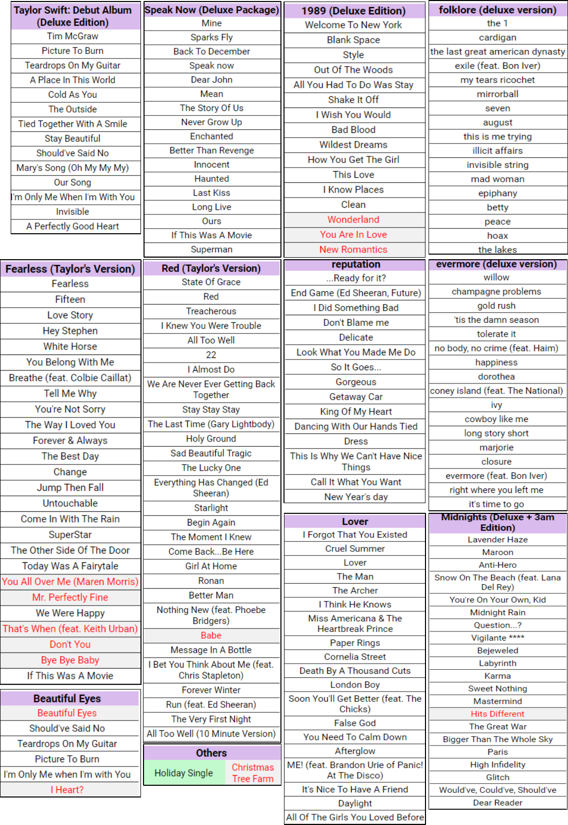 Taylor Swift: Debut Album Speak Now (Deluxe Package) 1989 (Deluxe Edition) folklore (deluxe version) (Deluxe Edition) Mine Welcome To New York the 1 Tim McGraw Sparks Fly Blank Space cardigan Picture To Burn Back To December Style the last great american dynasty Teardrops On My Guitar Speak now Out Of The Woods exile (feat. Bon A Place In This World Dear John All You Had To Do Was Stay my tears ricochet Cold As You Mean mirrorball Shake It Off The Outside The Story Of Us seven Wish You Would Tied Together With A Smile Never Grow Up august Bad Blood Stay Beautiful Enchanted this is me trying Wildest Dreams Should've Said No Better Than Revenge illicit affairs How You Get The Girl Mary's Song (Oh My My My) Innocent invisible string Our Song Haunted This Love mad woman I'm Only Me When I'm With You Last Kiss Know Places epiphany Clean Invisible Long Live betty Ours Wonderland A Perfectly Good Heart peace If This Was A Movie You Are In Love hoax Superman New Romantics the lakes Fearless (Taylor's Version) Red (Taylor's Version) reputation evermore (deluxe version) Fearless State Of Grace Ready for it? willow Fifteen Red End Game (Ed Sheeran, Future) champagne problems Love Story Treacherous Did Something Bad gold rush I Knew You Were Trouble Don't Blame me 'tis the damn season Hey Stephen All Too Well Delicate tolerate it White Horse 22 Look What You Made Me Do no body, no crime (feat. Haim) You Belong With Me Almost Do So It Goes happiness Breathe (feat. Colbie Caillat) dorothea We Are Never Ever Getting Back Gorgeous Tell Me Why Together coney island (feat. The National) Getaway Car You're Not Sorry Stay Stay Stay ivy King Of My Heart The Way Loved You The Last Time (Gary Lightbody) cowboy like me Dancing With Our Hands Tied Holy Ground long story short Forever & Always Dress The Best Day Sad Beautiful Tragic marjorie This Is Why We Can't Have Nice closure Change The Lucky One Things evermore (feat. Bon Jump Then Fall Everything Has Changed (Ed Call It What You Want Sheeran) right where you left me New Year's day Untouchable Starlight it's time to go Come In With The Rain Begin Again Lover Midnights (Deluxe + 3am Edition) SuperStar The Moment I Knew Forgot That You Existed Lavender Haze The Other Side Of The Door Come Back Be Here Cruel Summer Maroon Today Was A Fairytale Girl At Home Lover Anti-Hero Ronan The Man You All Over Me (Maren Morris) Snow On The Beach (feat. Lana The Archer Del Rey) Mr. Perfectly Fine Better Man Think He Knows You're On Your Own, Kid We Were Happy Nothing New (feat. Phoebe Midnight Rain Bridgers) Miss Americana & The That's When (feat. Keith Urban) Heartbreak Prince Question Babe Don't You Paper Rings Vigilante Message In A Bottle Bejeweled Bye Bye Baby Cornelia Street Bet You Think About Me (feat. Labyrinth If This Was A Movie Chris Stapleton) Death By A Thousand Cuts Karma Forever Winter London Boy Sweet Nothing Beautiful Eyes Soon You'll Get Better (feat. The Run (feat. Ed Sheeran) Mastermind Beautiful Eyes Chicks) Hits Different The Very First Night False God Should've Said No The Great War All Too Well (10 Minute Version) You Need To Calm Down Teardrops On My Guitar Bigger Than The Whole Sky Others Afterglow Paris Picture To Burn Christmas ME! (feat. Brandon Urie of Panic! High Infidelity I'm Only Me when I'm with You Holiday Single Tree Farm At The Disco) Glitch Heart? It's Nice To Have A Friend Would've, Could've, Should've Daylight Dear Reader All Of The Girls You Loved BeforeFeaturing in Appearing in Movies The Holiday Collection Last Christmas Tim McGraw The Hunger Safe And Sound Christmases When You Were (feat. Keith Highway don't care Games Mine Urban) The Hunger Santa Baby Both of Us Eyes Open B.O.B Games Silent Night Christmas Must Be Something John Meyer Half of My Heart Hannah More Crazier HAIM Montana White Christmas Gasoline Sugarland Babe Fifty Shades I Don't Want to Live Darker Boys Like Two Is Better Than Forever (Zayn) Girls One Miss Big Red Americana Only The Young Machine Renegade Sweeter Than Big Red One Chance Birch Fiction Machine Cats Beautiful Ghosts The Joker And The Ed Sheeran Where The Queen Crawdads Carolina The National The Alcott Sing