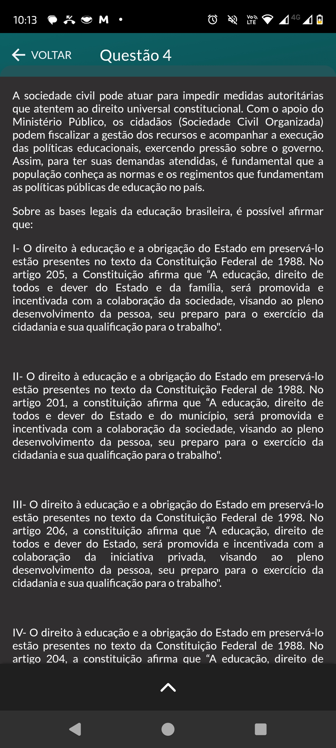 10:13 M 4G LTE VOLTAR Questão 4 A sociedade civil pode atuar para impedir medidas autoritárias que atentem ao direito universal constitucional. Com apoio do Ministério Público, os cidadãos (Sociedade Civil Organizada) podem fiscalizar a gestão dos recursos e acompanhar a execução das políticas educacionais. exercendo pressão sobre governo. Assim, para ter suas demandas atendidas, é fundamental que a população conheça as normas e os regimentos que fundamentam as políticas públicas de educação no país. Sobre as bases legais da educação brasileira, é possível afirmar que: I- O direito à educação e a obrigação do Estado em preservá-lo estão presentes no texto da Constituição Federal de 1988. No artigo 205, a Constituição afirma que "A educação, direito de todos e dever do Estado e da família, será promovida e incentivada com a colaboração da sociedade, visando ao pleno desenvolvimento da pessoa, seu preparo para O exercício da cidadania e sua qualificação para trabalho". II- O direito à educação e a obrigação do Estado em preservá-lo estão presentes no texto da Constituição Federal de 1988. No artigo 201, a constituição afirma que "A educação, direito de todos e dever do Estado e do município, será promovida e incentivada com a colaboração da sociedade, visando ao pleno desenvolvimento da pessoa, seu preparo para exercício da cidadania e sua qualificação para trabalho". III- O direito à educação e a obrigação do Estado em preservá-lo estão presentes no texto da Constituição Federal de 1998. No artigo 206, a constituição afirma que "A educação, direito de todos e dever do Estado, será promovida e incentivada com a colaboração da iniciativa privada, visando ao pleno desenvolvimento da pessoa, seu preparo para exercício da cidadania e sua qualificação para trabalho". IV- O direito à educação e a obrigação do Estado em preservá-lo estão presentes no texto da Constituição Federal de 1988. No artigo 204, a constituição afirma que "A educação, direito de