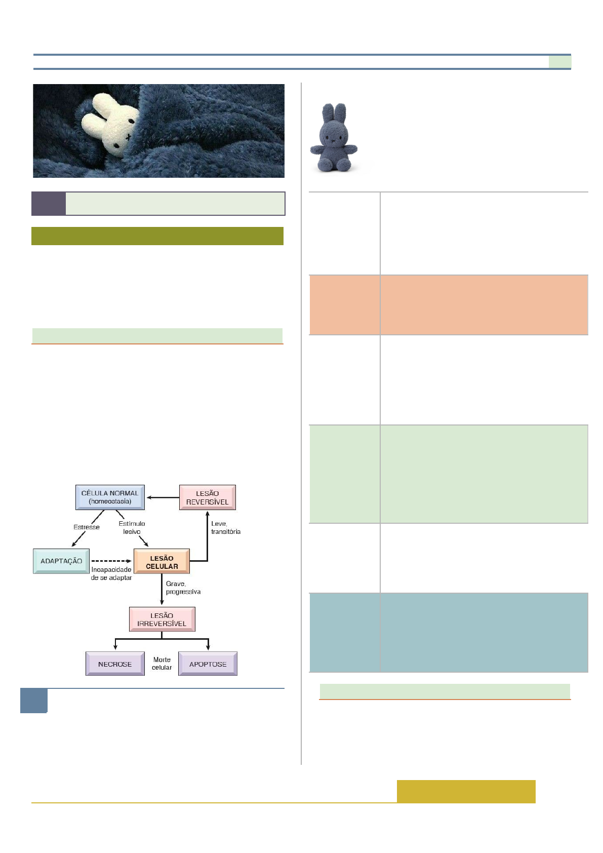 Adaptação e lesão celular: terminologias patológicas Processos Patológicos Terceiro semestre (Mel’s) 2025 1.0 Adaptação celular O que é a adaptação celular? Homeostasia é o estado de equilíbrio entre as reações químicas que ocorrem no ambiente intracelular; caso haja qualquer desvio nesta situação de equilíbrio, ocorrem as adaptações celulares, que são alterações reversíveis em número, tamanho, fenótipo, atividade metabólica ou das funções celulares em resposta às alterações no seu meio. Como posso definir isso em DETALHES? ● As adaptações são respostas estruturais e funcionais reversíveis a mudanças no estado fisiológico e a alguns estímulos patológicos, durante as quais são alcançados novos estados de equilíbrio, diferentes do original, mas possibilitando a sobrevivência e a função contínua da célula. A resposta adaptativa pode envolver hipertrofia, hiperplasia, atrofia e metaplasia. Se o estresse for eliminado, a célula pode retornar a seu estado de equilíbrio original, sem ter sofrido qualquer consequência prejudicial. ● A lesão celular é reversível, mas se o estímulo lesivo for persistente ou intenso, a célula sofre lesão irreversível e, por fim, morte celular. ● Existem duas vias principais de morte celular: a necrose e a apoptose. ○ Necrose: Está associada a uma ruptura da membrana e liberação do conteúdo celular no ambiente extracelular. ○ Apoptose: Envolve o encolhimento do citoplasma, resultando na condensação do núcleo. Tabela no 1 Tipos de agentes causadores de lesões celulares Privação de oxigênio ● A hipóxia é uma deficiência de oxigênio, que provoca lesão celular ao reduzir a respiração celular aeróbica ● As causas incluem redução do fluxo sanguíneo (isquemia); oxigenação inadequada do sangue devido à insuficiência cardiorrespiratória; e diminuição da capacidade de transporte de oxigênio do sangue Agentes físicos ● São capazes de causar lesão celular incluem trauma mecânico, extremos de temperatura (queimaduras e frio intenso), mudanças súbitas da pressão atmosférica, radiação e choque elétrico Agentes químicos ● Causam lesões celulares por meio de mecanismos como interferência na respiração celular, bloqueio de enzimas, dano às membranas celulares e produção de radicais livres. ● Substâncias simples (ex: glicose e sódio em altas quantidades), toxinas ambientais, drogas e medicamentos em doses tóxicas. Agentes infecciosos ● Os vírus invadem células, sequestram o DNA celular para se replicar e podem causar lise celular, apoptose ou necrose. As bactérias produzem exotoxinas, que interferem na função celular, e endotoxinas, que ativam respostas inflamatórias intensas. Os fungos invadem tecidos, liberam enzimas hidrolíticas e micotoxinas que destroem membranas e induzem apoptose. Peroxidação lipídica ● Quando o equilíbrio entre a produção de radicais livres e os mecanismos antioxidantes do corpo é perdido, ocorre um estresse oxidativo, que pode resultar em lesão celular e contribuir para o desenvolvimento de doenças como câncer, doenças neurodegenerativas e cardiovasculares. Anormalidades genéticas ● Podem causar lesão celular devido à função deficiente de proteínas, como os defeitos enzimáticos dos erros inatos do metabolismo; ou acúmulo de DNA danificado ou proteínas mal enoveladas, ambos os quais desencadeiam a morte celular quando ultrapassam a possibilidade de reparo. Em resumo, a lesão celular é desencadeada por: ● Redução da síntese ATP (Adenosina Trifosfato) ● Aumento da liberação de espécies reativas e de radicais livres do oxigênio (peroxidação) ● Aumento da concentração do sódio intracelular e Adaptação celular 1 Referências: KUMAR, V. Robbins & Cotran Patologia - Bases Patológicas das Doenças. London: Elsevier Health Sciences Brazil, 2011. 1.1 Causa das lesões celulares Adaptação e lesão celular: terminologias patológicas Processos Patológicos Terceiro semestre (Mel’s) 2025 perda de potássio; Aumento da concentração do cálcio intracelular, no citossol, proveniente do retículo endoplasmático liso e da mitocôndria (aumentando a atividade de: fosfolipases, proteases, ATPases, e endonucleases) ● Alteração da permeabilidade das membranas citoplasmáticas e das organelas ● Dano mitocondrial irreversível (poros de permeabilidade): cessa a fosforilação oxidativa (respiração) 1.2 Adaptação celular Hipertrofia A hipertrofia refere-se a um aumento do tamanho das células, que resulta em aumento de tamanho do órgão afetado. O órgão hipertrofiado não apresenta novas células, apenas células maiores. As células com capacidade de divisão podem responder ao estresse por meio de hiperplasia e hipertrofia, enquanto as células que não se dividem (p. ex., fibras miocárdicas) aumentam a massa tecidual em consequência de hipertrofia. Pode ser fisiológica ou patológica: ● Hipertrofia patológica: é causada por estímulos anormais, como estresse mecânico excessivo ou estímulos hormonais desregulados. ○ Hipertensão cardíaca → h. patológica → disfunção cardíaca. ● Hipertrofia fisiológica: Adaptação positiva e benéfica onde as fibras musculares aumentam de tamanho para atender às demandas aumentadas de trabalho. ○ Gravidez → h. fisiológica → abriga o feto em desenvolvimento. Tabela no 2 Exemplos de hipertrofia celular. Hiperplasia A hiperplasia refere-se a um aumento no número de células em um órgão ou tecido em resposta a determinado estímulo. A hiperplasia só pode ocorrer quando o tecido contém células capazes de sofrer divisão, aumentando, assim, o número de células. Pode ser fisiológica ou patológica: ● Hiperplasia patológica: São causadas, em sua maioria, pelas ações excessivas ou inapropriadas de hormônios ou de fatores de crescimento que atuam sobre as células-alvo. ○ Gravidez → h. fisiológica → abr