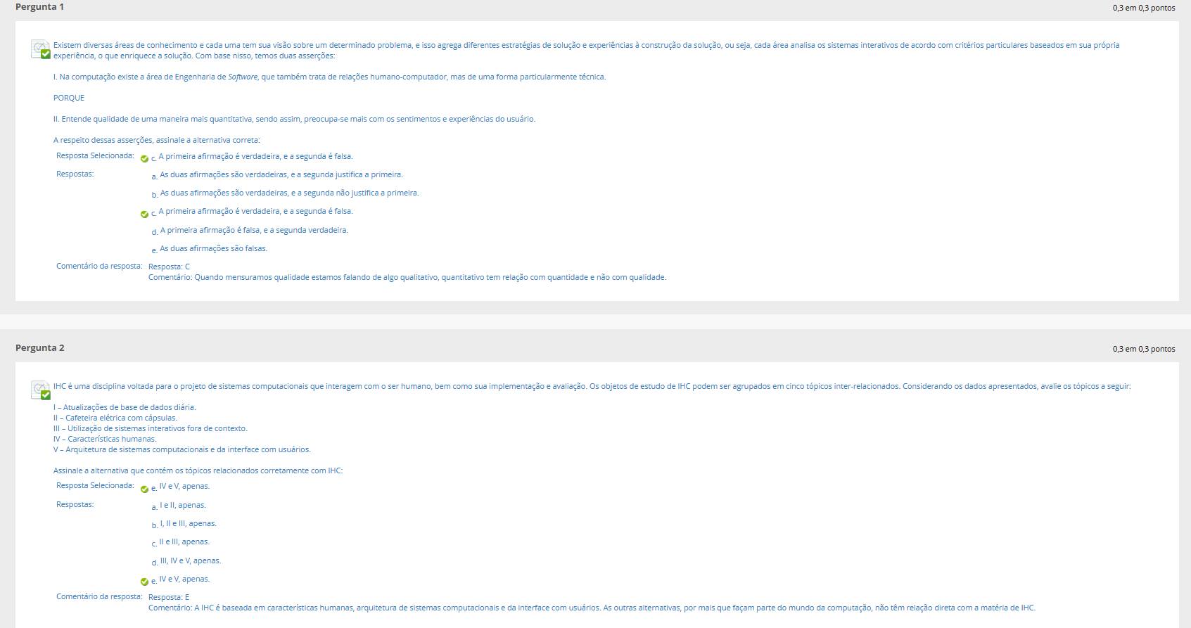 Pergunta 0,3 em 0,3 pontos Existem diversas áreas de conhecimento e cada uma tem sua visão sobre um determinado problema, e isso agrega diferentes estratégias de solução e experiências à construção da solução, ou seja, cada área analisa os sistemas interativos de acordo com critérios particulares baseados em sua própria que enriquece a solução. Com base nisso, temos duas Na computação existe a área de Engenharia de Software, que também trata de relações humano-computador, mas de uma forma particularmente PORQUE II. Entende qualidade de uma maneira mais quantitativa, sendo assim, preocupa-se mais com os sentimentos e experiências do A respeito dessas assinale a alternativa correta: Resposta Selecionada: A primeira afirmação é verdadeira, e a segunda é Respostas: a. As duas afirmações são verdadeiras, e a segunda justifica a b. As duas afirmações são verdadeiras, e a segunda não justifica a primeira A primeira afirmação é verdadeira, e a segunda é d. A primeira afirmação é e a segunda verdadeira. As duas afirmações são Comentário da resposta: Resposta: C Comentário: Quando mensuramos qualidade estamos falando de algo quantitativo tem relação com quantidade e não com Pergunta 2 0,3 em pontos IHC é uma disciplina voltada para projeto de sistemas computacionais que interagem com ser humano, bem como sua implementação e Os objetos de estudo de IHC podem ser agrupados em cinco tópicos inter-relacionados Considerando os dados apresentados, avalie os tópicos a Atualizações de base de dados II Cafeteira elétrica com III - Utilização de sistemas interativos fora de IV Características V Arquitetura de sistemas computacionais e da interface com usuários Assinale a alternativa que contém os tópicos relacionados corretamente com Resposta Selecionada: e IV apenas Respostas: e IV e V. e IV Comentário da resposta: Resposta: F A IHC é baseada em características humanas arquitetura de sistemas computacionais e da interface com As outras alternativas, por mais que façam parte do mundo da não têm relação direta com a de