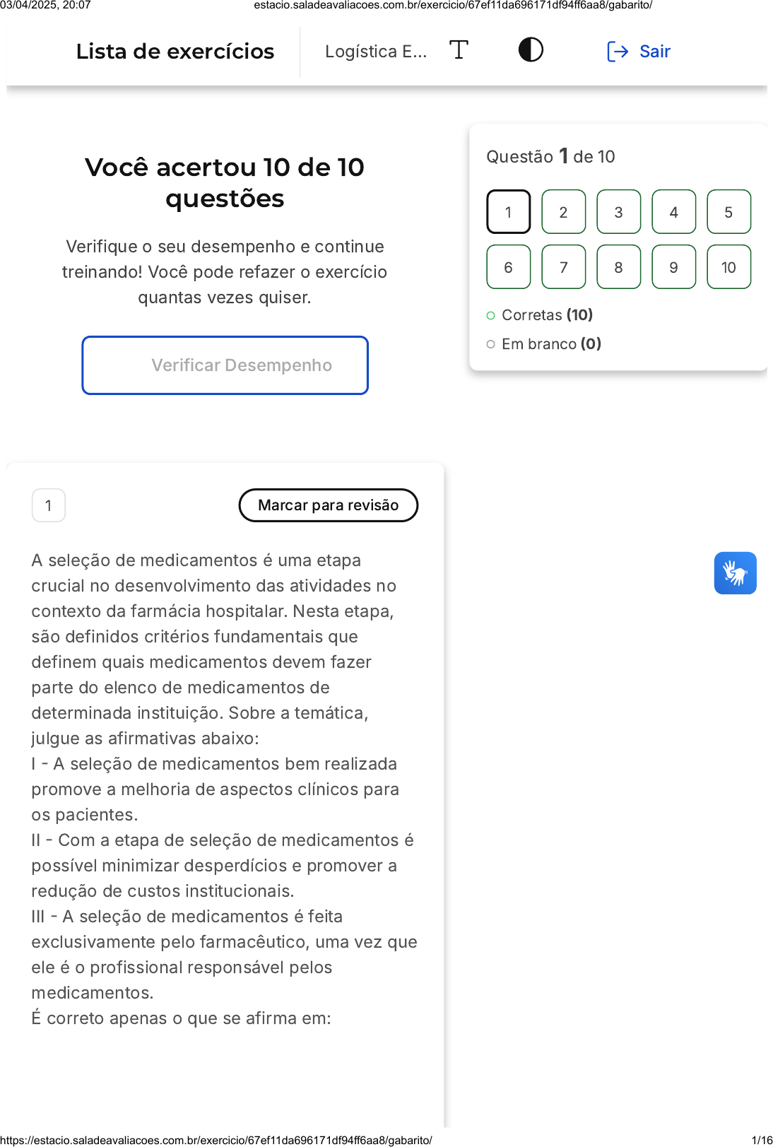 Você acertou 10 de 10 questões Verifique o seu desempenho e continue treinando! Você pode refazer o exercício quantas vezes quiser. Verificar Desempenho 1 Marcar para revisão A seleção de medicamentos é uma etapa crucial no desenvolvimento das atividades no contexto da farmácia hospitalar. Nesta etapa, são definidos critérios fundamentais que definem quais medicamentos devem fazer parte do elenco de medicamentos de determinada instituição. Sobre a temática, julgue as afirmativas abaixo: I - A seleção de medicamentos bem realizada promove a melhoria de aspectos clínicos para os pacientes. II - Com a etapa de seleção de medicamentos é possível minimizar desperdícios e promover a redução de custos institucionais. III - A seleção de medicamentos é feita exclusivamente pelo farmacêutico, uma vez que ele é o profissional responsável pelos medicamentos. É correto apenas o que se afirma em: Questão 1 de 10 Corretas (10) Em branco (0) 1 2 3 4 5 6 7 8 9 10 Lista de exercícios Logística E… Sair 03/04/2025, 20:07 estacio.saladeavaliacoes.com.br/exercicio/67ef11da696171df94ff6aa8/gabarito/ https://estacio.saladeavaliacoes.com.br/exercicio/67ef11da696171df94ff6aa8/gabarito/ 1/16 A B C D E II. I, II e III. I e III. I e II. II e III. Resposta correta Parabéns, você selecionou a alternativa correta. Confira o gabarito comentado! Gabarito Comentado A seleção de medicamentos é uma atividade de grande importância no contexto hospitalar, pois envolve tanto aspectos clínicos quanto administrativos. A afirmativa I está correta, pois uma seleção de medicamentos bem realizada pode melhorar os aspectos clínicos para os pacientes, garantindo que eles recebam os medicamentos mais adequados para suas condições. A afirmativa II também está correta, pois a seleção de medicamentos pode minimizar desperdícios e promover a redução de custos institucionais, ao garantir que apenas os medicamentos necessários sejam adquiridos. No entanto, a afirmativa III está incorreta. A seleção de medicamentos não é feita exclusivamente pelo farmacêutico, mas sim por uma Comissão de Farmácia e Terapêutica, que é formada por médicos, farmacêuticos, 03/04/2025, 20:07 estacio.saladeavaliacoes.com.br/exercicio/67ef11da696171df94ff6aa8/gabarito/ https://estacio.saladeavaliacoes.com.br/exercicio/67ef11da696171df94ff6aa8/gabarito/ 2/16 A B C D E enfermeiros e representantes do corpo administrativo. Portanto, as afirmativas I e II são as únicas corretas. 2 Marcar para revisão "A seleção tem o potencial de produzir resultados que orientam tanto condutas clínicas, quanto atividades gerenciais relacionadas aos medicamentos disponibilizados pelo SUS." KARNIKOWSKI, M. G. O. et al. Caracterização da seleção de medicamentos para a atenção primária no Brasil. Revista de Saúde Pública, 2017. No trecho acima, Karnikowski e colaboradores reforçam a importância da etapa de seleção como norteador das condutas clínicas e administrativas. No que diz respeito às condutas clínicas, a seleção de medicamentos promove: O gerenciamento de recursos financeiros. A minimização de desperdícios. Um aumento do arsenal terapêutico da instituição. A escolha de medicamentos mais seguros e eficazes. Atividades de educação continuada. 03/04/2025, 20:07 estacio.saladeavaliacoes.com.br/exercicio/67ef11da696171df94ff6aa8/gabarito/ https://estacio.saladeavaliacoes.com.br/exercicio/67ef11da696171df94ff6aa8/gabarito/ 3/16 Resposta correta Parabéns, você selecionou a alternativa correta. Confira o gabarito comentado! Gabarito Comentado Conforme o trecho de Karnikowski e colaboradores, a seleção de medicamentos é uma etapa crucial que orienta as condutas clínicas. Nesse contexto, a alternativa D é a correta, pois a seleção de medicamentos visa a escolha de medicamentos mais seguros e eficazes, baseando-se na interpretação dos dados científicos relacionados a eles. Embora as demais alternativas apresentem benefícios importantes do processo de seleção, elas não estão diretamente ligadas às condutas clínicas, que é o foco da questão. 3 Marcar para revisão A seleção de medicamentos orienta sua utilização em ambiente hospitalar de forma eficaz, com segurança e pautada no uso racional de medicamentos. Sobre essa etapa, avalie as alternativas abaixo: I - Selecionar todas as diferentes apresentações do mesmo medicamento. II - Selecionar medicamentos com base apenas em redução de custos diretos. III - Selecionar medicamentos com base em estudos farmacoeconômicos. Sobre as afirmativas acima, podemos dizer que são estratégias corretas para a seleção de medicamentos o que se diz: 03/04/2025, 20:07 estacio.saladeavaliacoes.com.br/exercicio/67ef11da696171df94ff6aa8/gabarito/ https://estacio.saladeavaliacoes.com.br/exercicio/67ef11da696171df94ff6aa8/gabarito/ 4/16 A B C D E Nas afirmativas I e II. Apenas na afirmativa I. Nas afirmativas I e III. Nas afirmativas II e III. Apenas na afirmativa III. Resposta correta Parabéns, você selecionou a alternativa correta. Confira o gabarito comentado! Gabarito Comentado A alternativa correta é a III, que menciona a seleção de medicamentos com base em estudos farmacoeconômicos. Este é um princípio fundamental no processo de seleção de medicamentos, pois permite uma avaliação criteriosa que leva em conta não apenas o custo, mas também a eficácia, a segurança e a conveniência dos medicamentos. Por outro lado, as afirmativas I e II não são estratégias corretas para a seleção de medicamentos. A afirmativa I sugere a seleção de todas as diferentes apresentações do mesmo medicamento, o que nem sempre é necessário ou eficiente. A afirmativa II propõe a seleção de medicamentos com base apenas na redução de custos diretos, o que é uma visão limitada e pode comprometer a qualidade e a segurança do tratamento. Portanto, a seleção de 03/04/2025, 20:07 estacio.saladeavaliacoes.com.br/exercicio/67ef11da