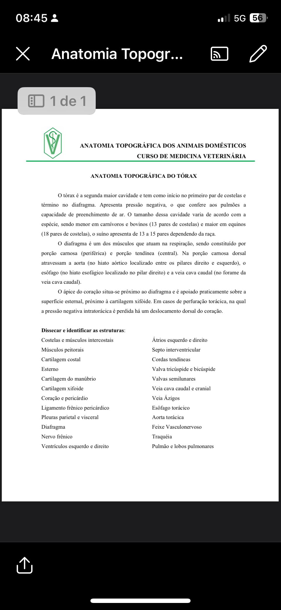 08:45 5G 56 X Anatomia Topogr : 1 de 1 ANATOMIA TOPOGRÁFICA DOS ANIMAIS DOMÉSTICOS CURSO DE MEDICINA VETERINÁRIA ANATOMIA TOPOGRÁFICA DO TÓRAX o tórax é a segunda maior cavidade e tem como início no primeiro par de costelas e término no diafragma. Apresenta pressão negativa, o que confere aos pulmões a capacidade de preenchimento de ar. o tamanho dessa cavidade varia de acordo com a espécie, sendo menor em carnívoros e bovinos (13 pares de costelas) e maior em equinos (18 pares de costelas), o suíno apresenta de 13 a 15 pares dependendo da raça. o diafragma é um dos músculos que atuam na respiração, sendo constituído por porção carnosa (periférica) e porção tendínea (central). Na porção carnosa dorsal atravessam a aorta (no hiato aórtico localizado entre os pilares direito e esquerdo), o esôfago (no hiato esofágico localizado no pilar direito) e a veia cava caudal (no forame da veia cava caudal). o ápice do coração situa-se próximo ao diafragma e é apoiado praticamente sobre a esternal, próximo à cartilagem xifóide. Em casos de perfuração torácica, na qual a pressão negativa intratorácica é perdida há um deslocamento dorsal do coração. Dissecar e identificar as estruturas: Costelas e músculos intercostais Átrios esquerdo e direito Músculos peitorais Septo interventricular Cartilagem costal Cordas tendíneas Esterno Valva e Cartilagem do manubrio Valvas semilunares Cartilagem xifoide Veia cava caudal e cranial Coração e pericárdio Veia Ázigos Ligamento frênico pericárdico Esôfago torácico Pleuras parietal e visceral Aorta torácica Diafragma Feixe Vasculonervoso Nervo frênico Traquéia Ventrículos esquerdo e direito Pulmão e lobos pulmonares