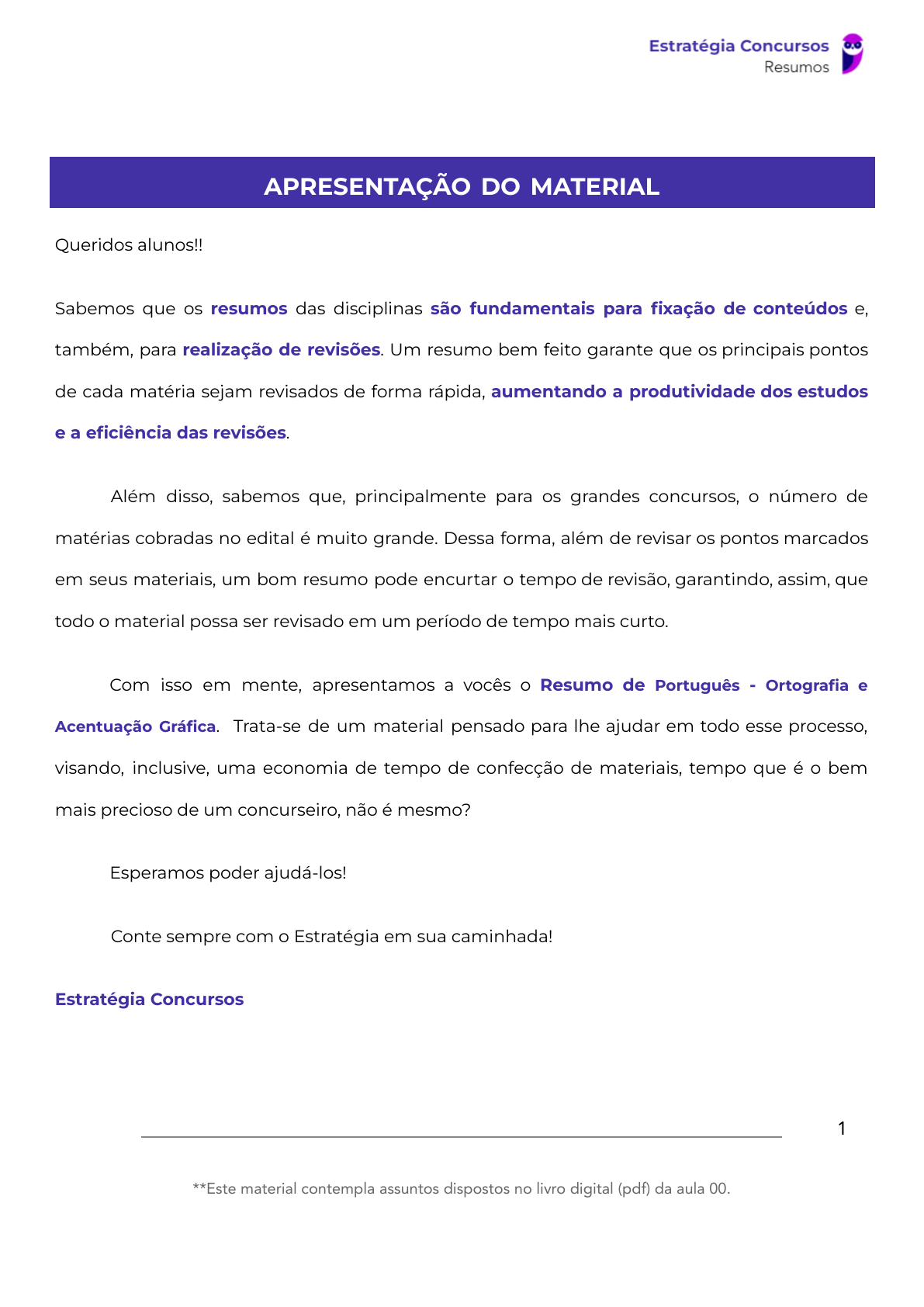 APRESENTAÇÃO DO MATERIAL Queridos alunos!! Sabemos que os resumos das disciplinas são fundamentais para fixação de conteúdos e, também, para realização de revisões. Um resumo bem feito garante que os principais pontos de cada matéria sejam revisados de forma rápida, aumentando a produtividade dos estudos e a eficiência das revisões. Além disso, sabemos que, principalmente para os grandes concursos, o número de matérias cobradas no edital é muito grande. Dessa forma, além de revisar os pontos marcados em seus materiais, um bom resumo pode encurtar o tempo de revisão, garantindo, assim, que todo o material possa ser revisado em um período de tempo mais curto. Com isso em mente, apresentamos a vocês o Resumo de Português - Ortografia e Acentuação Gráfica. Trata-se de um material pensado para lhe ajudar em todo esse processo, visando, inclusive, uma economia de tempo de confecção de materiais, tempo que é o bem mais precioso de um concurseiro, não é mesmo? Esperamos poder ajudá-los! Conte sempre com o Estratégia em sua caminhada! Estratégia Concursos 1 **Este material contempla assuntos dispostos no livro digital (pdf) da aula 00. 43584858801 - Caroline Pereira RESUMO DE PORTUGUÊS Monossílabo Tônico Terminados em A(s),E(s),O(s): pá, três, pós Terminadas em Ditongo Aberto: éu, éi, ói: céu, réis, dói Oxítona Terminadas em A(s),E(s),O(s),Em(s): sofá, café Terminadas em Ditongo Aberto: éu, éi, ói: chapéu, anéis, herói Paroxítona Todas, exceto terminadas em A(s),E(s),O(s),Em(s), Ex: fácil, hífen, álbum, cadáver, álbuns, tórax, júri, lápis, vírus, bíceps, órfão Terminadas em ditongo (Regra cobradíssima) Ex: Indivíduos, precárias, série, história, imóveis, água, distância, primário, indústria, rádio Se tiver Ditongo Aberto: não acentua mais! Ex: boia, jiboia, proteico, heroico Proparoxítona Todas. Sempre. Ex: líquida, pública, episódica, anencéfalo, período 2 **Este material contempla assuntos dispostos no livro digital (pdf) da aula 00. 43584858801 - Caroline Pereira Regra do Hiato: Acentuam-se o “i” ou “u” tônico sozinho na sílaba (ou com s): baú, juízes, balaústre, país, reúnem, saúde, egoísmo. Caso contrário, não acentue: juiz, raiz, ruim, cair. Não se acentuam também hiatos com vogais repetidas: voo, enjoo, creem, leem, saara, xiita, semeemos. Exceção1: “i” seguido de NH: rainha, bainha, tainha, Exceção2: “i” ou “u” antecedido de ditongo, se a palavra não for oxítona: bocaiuva, feiura, Sauipe, Piauí, tuiuiú. Decore: Guaíba e Guaíra são acentuados. 3 **Este material contempla assuntos dispostos no livro digital (pdf) da aula 00. 43584858801 - Caroline Pereira NÃO HÁ HÍFEN HÁ HÍFEN Vogais diferentes Antes do H Consoantes diferentes Vogal ou consoante igual Vogal + Consoante Pré, pós, pro, recém, além, sem, ex, vice, aquém Após “não” e “quase” Sub + R/B Entre palavras com elemento de ligação Circum / pan + vogal/ m / n Regras Gerais para (não) uso do hífen: Não se usa hífen para unir vogais diferentes: autoestrada, agroindustrial, anteontem, extraoficial, videoaulas, autoaprendizagem, coautor, infraestrutura, semianalfabeto >Usa-se para vogais iguais: Micro-ondas; contra-ataque; anti-inflamatório; auto-observação. Não se usa hífen para unir consoantes diferentes: Hipermercado, superbactéria, intermunicipal >Usa-se para consoantes iguais: Super-romântico; hiper-resistente; sub-bibliotecário Não se usa hífen entre palavras com elementos de ligação: Mão de obra; dia a dia; café com leite; cão de guarda; pai dos burros; ponto e vírgula; camisa de força; bicho de sete cabeças; pé de moleque; cara de pau. 4 **Este material contempla assuntos dispostos no livro digital (pdf) da aula 00. 43584858801 - Caroline Pereira Contrariamente, se não houver elemento de ligação, há hífen: boa-fé; arco-íris; guarda-chuva; vagalume; porta-malas; bate-boca; pega-pega; corre-corre Recém, além, aquém, sem, pós, pré, ex, vice. HÁ HÍFEN: Recém-nascido, recém-casado, pré-datado, além-túmulo, pós-graduação, vice-presidente, ex-presidente, sem-terra, pré-vestibular Antes de palavra com H, SEMPRE HÁ HÍFEN: anti-higiênico, circum-hospitalar, contra-harmônico, extra-humano, pré-história, sub-hepático, super-homem, ultra-hiperbólico, geo-história, neo-helênico, pan-helenismo, semi-hospitalar Prefixos “Sub” e “sob” + R/B: HÁ HÍFEN: Sub-região, Sub-raça, Sub-reitor *Exceções: mais-que-perfeito; cor-de-rosa; água-de-colônia; pé-de-meia; gota-d’água; espécies botânicas: pimenta-do-reino, cravo-da-índia; cooperar… Expressões da Norma Culta Há diversas expressões que são usadas pelas bancas para confundir o aluno. Vejamos os “pares” mais cobrados em prova: Mal x Mau Mal: oposto de “bem”. Advérbio. Geralmente acompanha um verbo ou adjetivo. Ex.: O jantar foi mal preparado pelo cozinheiro. 5 **Este material contempla assuntos dispostos no livro digital (pdf) da aula 00. 43584858801 - Caroline Pereira Também temos “mal” como conjunção temporal, com sentido de “logo que”. Ex.: Mal cheguei, fui interrogado. Como sinônimo de “doença, coisa ruim”, mal é substantivo. Ex.: Morreu de um mal súbito. Mau: oposto de “bom”. Adjetivo. Acompanha um substantivo, dando a ele a qualidade de “maligno". Ex.: Não passou porque era um mau candidato. Há x a Há: Verbo impessoal haver, sentido de existir; tempo passado. Ex.: Há dias em que sinto falta de fumar. Há dez anos não fumo. A: preposição, sentido de limite, distância ou futuro. Ex.: O cinema fica a 2km daqui. Chegaremos daqui a 15 minutos. A fim x afim A fim de: locução prepositiva com sentido de “propósito”, “para”. Ex.: Estou aqui a fim de te orientar sobre seu estudo. Afim: Semelhante, correlato. Ex.: Matemática e estatística são matérias afins. 6 **Este material contempla assuntos dispostos no livro digital 