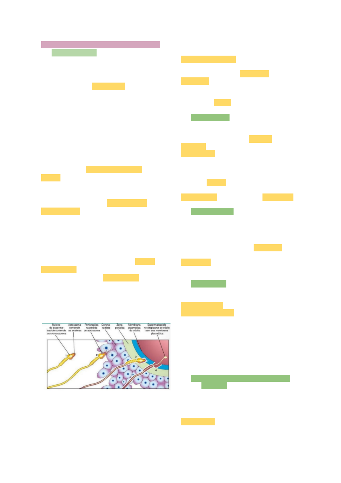 DESENVOLVIMENTO EMBRIONÁRIO 1. Fecundação (12-24h pós ovulação) As prostaglandinas presentes no sêmen, conduzem os espermatozóides até a tuba uterina; Na tuba, ocorre a capacitação : os espermatozóides perdem colesterol, o que deixa a membrana do acrossomo mais fraca e facilita a entrada do espermatozóide no ovócito II. Além disso, também ocorre entrada de íons cálcio na membrana do flagelo, fazendo com que este passe a ter potentes movimentos de chicote; Os capacitados liberam a enzima hialuronidase e penetram na corona radiata , dissolvendo a matriz intracelular da corona; Depois, o acrossomo libera acrosina, uma enzima que facilita sua penetração na zona pelúcida ; → Os espermatozóides possuem receptores da glicoproteína ZP3, enquanto a zona pelúcida possui ligantes da proteína ZP3. Quando ocorre a ligação entre espermatozóide e zona pelúcida: reação acrossômica ; Em seguida, ocorre a reação zonal : previne a polispermia despolarizando a membrana do ovócito secundário e promove a liberação de íons cálcio para inativar a ZP3; Obs.: Apenas o 1° espermatozóide que penetra na zona pelúcida desencadeia as reações acrossômica e zonal, e futuramente se funde ao ovócito II. Nesse momento, já houve a penetração: ovócito II completa a meiose II e forma o pró núcleo feminino ; Ao se aproximar, o espermatozóide perde sua cauda e forma o pró núcleo masculino ; Os prós núcleos entram em contato, perdem a membrana nuclear, se fundem e formam um zigoto . 2. Clivagem (30h pós fecundação) À medida que o zigoto avança pela tuba uterina em direção ao útero, sofre clivagens (uma série de divisões mitóticas ), originando células menores: blastômeros ; Ocorre a compactação (blastômeros aumentam o contato entre si) e quando existem de 16 a 32 blastômeros juntos, se origina a mórula ; Sendo que a massa celular interna é o embrioblasto e a externa é o trofoblasto. 3. Blastocisto (3°/4° dia) Quando a mórula chega no útero, há penetração de leite uterino pela zona pelúcida e este se acumula entre os blastômeros, reorganizando-os em torno de uma grande cavidade: blastocele ; Nesse momento o embrião é o blastocisto . (A blastocele é a cavidade do blastocisto) 4. Nidação (8° dia) Os trofoblastos se proliferam rapidamente e se diferenciam em 2 camadas: citotrofoblastos (camada interna) e sinciciotrofoblastos (camada interna); Os citotrofoblastos ficam entre os sinciciotrofoblastos e o embrioblasto; Os sinciciotrofoblastos produzem enzimas que promovem apoptose nas células endometriais (por isso pode haver sangramento), permitindo a anexação do blastocisto no endométrio. 5. Formação do disco embrionário bilaminar É formado a partir do embrioblasto e é dividido em epiblastos e hipoblastos; Origina todas as camadas germinativas que formam todos os tecidos do embrião. → Epiblasto : ectoderme primitiva (células cilíndricas altas) → Hipoblasto : endoderme primitiva (células cúbicas pequenas) 6. Anexos embrionários (Todos originados pelas camadas germinativas do disco embrionário trilaminar) - Saco Amniótico: Ocorre o surgimento de uma pequena cavidade no epiblasto, a qual, com o passar do tempo vai aumentando de tamanho: Cavidade amniótica ; Os amnioblastos (células formadoras do âmnio) se separam do embrioblasto e começam a formar uma camada única de células escamosas no teto da cavidade: Âmnio ; Inicialmente, o âmnio recobre apenas o disco embrionário bilaminar, mas à medida que o disco aumenta de tamanho se dobra, o âmnio passa a recobrir todo o embrião; A cavidade amniótica se enche de líquido amniótico , o qual no começo é principalmente derivada do sangue materno mas depois também passa a receber a urina do feto; O líquido amniótico serve como amortecedor de impactos, previne a desidratação e ajuda a controlar a temperatura fetal. Obs.: O âmnio e seu líquido constituem a “bolsa d’água” que rompe um pouco antes do parto. - Saco vitelínico: É o primeiro anexo a ser formado e é originado pela endoderme juntamente com a mesoderme; O saco vitelínico fornece nutrientes para o embrião até o cordão umbilical e contém as células germinativas primordiais. - Pedículo do embrião É o primórdio do cordão umbilical e fica preso à superfície ventral do embrião. - Saco coriônico A mesoderme extra embrionária (originado pelo hipoblasto) em conjunto com 2 camadas do trofoblasto forma o cório; O cório envolve o embrião/feto, é a principal parte da placenta (responsável pelas trocas entre mãe e filho), protege o embrião/feto das respostas imunes da mãe e também secreta o hCG; A camada interna do cório funde-se ao âmnio e com o desenvolvimento do cório o celoma extraembrionário é chamado de cavidade coriônica. - Alantóide: Formado por uma evaginação no saco vitelino; Surge na 3° semana, enquanto os outros anexos já citados surgem na 2°; Os vasos sanguíneos do alantóide formam as artérias umbilicais; Pouco desenvolvido pois desenvolve a função da placenta. 7. Gestação ectópica Normalmente, o óvulo é fertilizado na tuba uterina e implantado no útero. Mas, se a trompa estiver estreitada ou bloqueada, o óvulo fertilizado pode não chegar no útero e se implantar em outros tecidos, normalmente em uma das tubas uterinas; A gravidez ectópica é a principal causa de morte no primeiro semestre. 8. Gastrulação É o processo no qual o disco embrionário bilaminar (epiblasto e hipoblasto) é convertido em trilaminar; As 3 camas do disco embrionário trilaminar são a mesoderme, ectoderme e endoderme , as quais vão originar tecidos e órgãos específicos; A gastrulação começa com a formação da linha primitiva , a qual serve de guia para a imigração de célula; A linha primitiva é uma dobra no epiblasto que vai da parte posterior até a anterior do embrião; Assim que a linha surge é possível identificar o eixo craniocaudal no embrião; A li