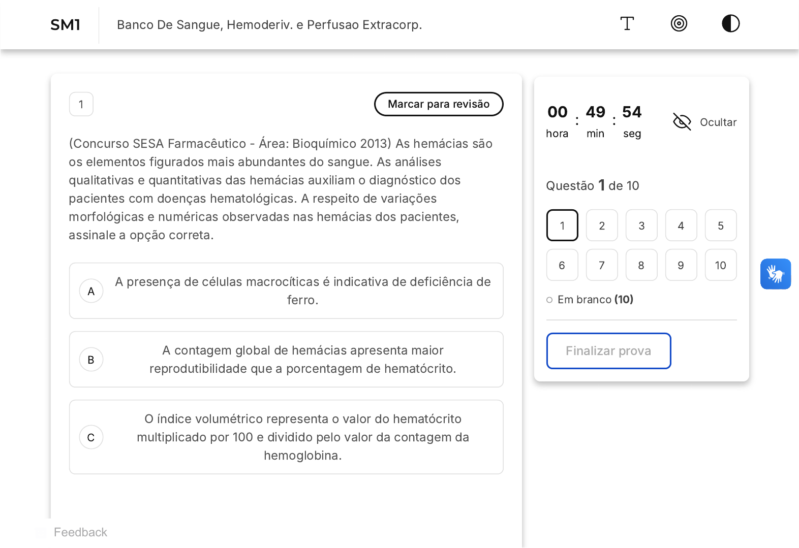 A B C 1 Marcar para revisão (Concurso SESA Farmacêutico - Área: Bioquímico 2013) As hemácias são os elementos figurados mais abundantes do sangue. As análises qualitativas e quantitativas das hemácias auxiliam o diagnóstico dos pacientes com doenças hematológicas. A respeito de variações morfológicas e numéricas observadas nas hemácias dos pacientes, assinale a opção correta. A presença de células macrocíticas é indicativa de deficiência de ferro. A contagem global de hemácias apresenta maior reprodutibilidade que a porcentagem de hematócrito. O índice volumétrico representa o valor do hematócrito multiplicado por 100 e dividido pelo valor da contagem da hemoglobina. 00 hora : 49 min : 54 seg Ocultar Questão 1 de 10 Em branco (10) Finalizar prova 1 2 3 4 5 6 7 8 9 10 SM1 Banco De Sangue, Hemoderiv. e Perfusao Extracorp. Feedback D E A B C Em todos os estágios de maturação, as hemácias apresentam grânulos arredondados dispersos no citoplasma, que se coram com substâncias ácidas. A anisocitose refere-se a uma grande variação do tamanho das hemácias. 2 Marcar para revisão (Adaptado de UFPR - Farmacêutico Bioquímico - 2008) A qualidade de uma análise laboratorial inicia com a coleta do material biológico e sua correta preservação até o momento da análise. Assinale a alternativa que apresenta, respectivamente, a amostra, o meio correto de preservação/aditivo da amostra e a análise a que se destina. Sangue total - Heparina - Glicemia Soro - Gel de separação - Coagulação Plasma - Citrato de sódio - Coagulação D E Soro - Gel de separação - Hemograma Sangue total - Gel de separação - Hemograma 3 Marcar para revisão (Adaptado de PUC - PR -2018 -Prefeitura de Fazenda Rio Grande -PR - Farmacêutico e Bioquímico) A Agência Nacional de Vigilância Sanitária (Anvisa) vem produzindo, desde 2008, manuais que abordam diferentes questões inerentes às principais síndromes infecciosas relacionadas à assistência à saúde, incluindo suas definições, indicadores, medidas e estratégias de prevenção. O leucograma é uma parte do hemograma que consiste em avaliar os leucócitos, células de defesa do organismo, que mostram a presença ou não de infecções. O resultado de um leucograma mostrou os seguintes resultados: leucocitose intensa, desvio nuclear à esquerda, neutrófilos com granulações tóxicas grosseiras em quase todas as células e presença de vacúolos citoplasmáticos. Qual é o diagnóstico sugestivo? A B C D E Processo parasitário intestinal Processo infeccioso bacteriano agudo Processo infeccioso virótico agudo Processo infeccioso bacteriano crônico Processo infeccioso virótico crônico 4 Marcar para revisão (Adaptada de INEP - 2006 - ENADE - Biomedicina) O sangue é um tecido especializado que circula por um sistema fechado, no qual o volume deve ser mantido constante. Sangramentos podem ocorrer e devem ser rapidamente reparados, por meio de processos denominados, em conjunto, hemostasia. Considere as afirmativas a seguir. I - Coagulação do sangue é a formação de uma rede solúvel de fibrina a partir de fibrinogênio. II - Quando ocorre lesão do endotélio vascular, plaquetas aderem ao local da lesão, sofrem modificações estruturais e liberam compostos que A B C D E induzem vasoconstrição e agregação plaquetária. III - A coagulação é controlada por inibidores naturais, como antitrombina e proteína C. Está correto o que se afirma em: II e III, somente I e II, somente II, somente I, somente III, somente 5 Marcar para revisão "A palavra talassemia deriva da combinação das palavras gregas thalassa (mar) e emas (sangue). Descreve-se assim uma hemoglobinopatia cuja origem principal está nos países banhados pelo mar Mediterrâneo, como Itália e Grécia. Atualmente, a doença alastrou-se praticamente no mundo A B C D E todo. Percentagens relevantes de portadores de talassemia são registrados no Canadá, nos Estados Unidos, no Brasil, na Argentina, na Índia, na Austrália e em outros países. A anemia da β talassemia é complexa e resultante da combinação entre eritropoiese ineficaz, hemólise e redução da síntese de hemoglobina." (Adaptado de Hamerschlak, N.; Campêlo, D. H. C. Talassemia. Consultado na internet em: 5 mai. 2021.) Nas betas talassemias, são observadas concentrações elevadas de hemoglobina A2. Sobre essa hemoglobina, podemos afirmar que ela é composta por: duas cadeias alfa e duas cadeias gama. duas cadeias alfa e duas cadeias beta. quatro cadeias beta. duas cadeias alfa e duas cadeias delta. duas cadeias beta e duas cadeias delta. A B C D E 6 Marcar para revisão As anemias microcíticas são um tipo de alteração da série vermelha e podem apresentar diferentes causas que devem ser investigadas. A seguir são listadas algumas características da anemia microcítica. Assinale a alternativa que retrata uma característica correta das anemias microcíticas. A anemia sideroblástica é uma causa comum de anemias microcíticas. Na anemia de doença crônica, a microcitose instala-se desde o início da diminuição da produção de hemoglobina. Pacientes com anemia por deficiência de ferro costumam apresentar RDW elevado. A ferritina sérica encontra-se em baixa quantidade em pacientes com doenças crônicas. Pacientes com talassemia costumam apresentar macrocitose no esfregaço sanguíneo. A B C D E 7 Marcar para revisão As anemias hemolíticas causam hemólise dos eritrócitos, decorrente de causas genéticas ou adquiridas, como as anemias por alterações genéticas de enzimas importantes para o metabolismo e anemias devido a doenças, como acontece na malária. Para o diagnóstico dessas anemias, alguns marcadores laboratoriais são de suma importância. A seguir estão listados achados laboratoriais comuns a esse grupo de anemia. Assinale a alternativa que não representa um achado laboratorial da anemia hemolítica. Dosagem de bilirrubina indireta elevada. Dosagem 