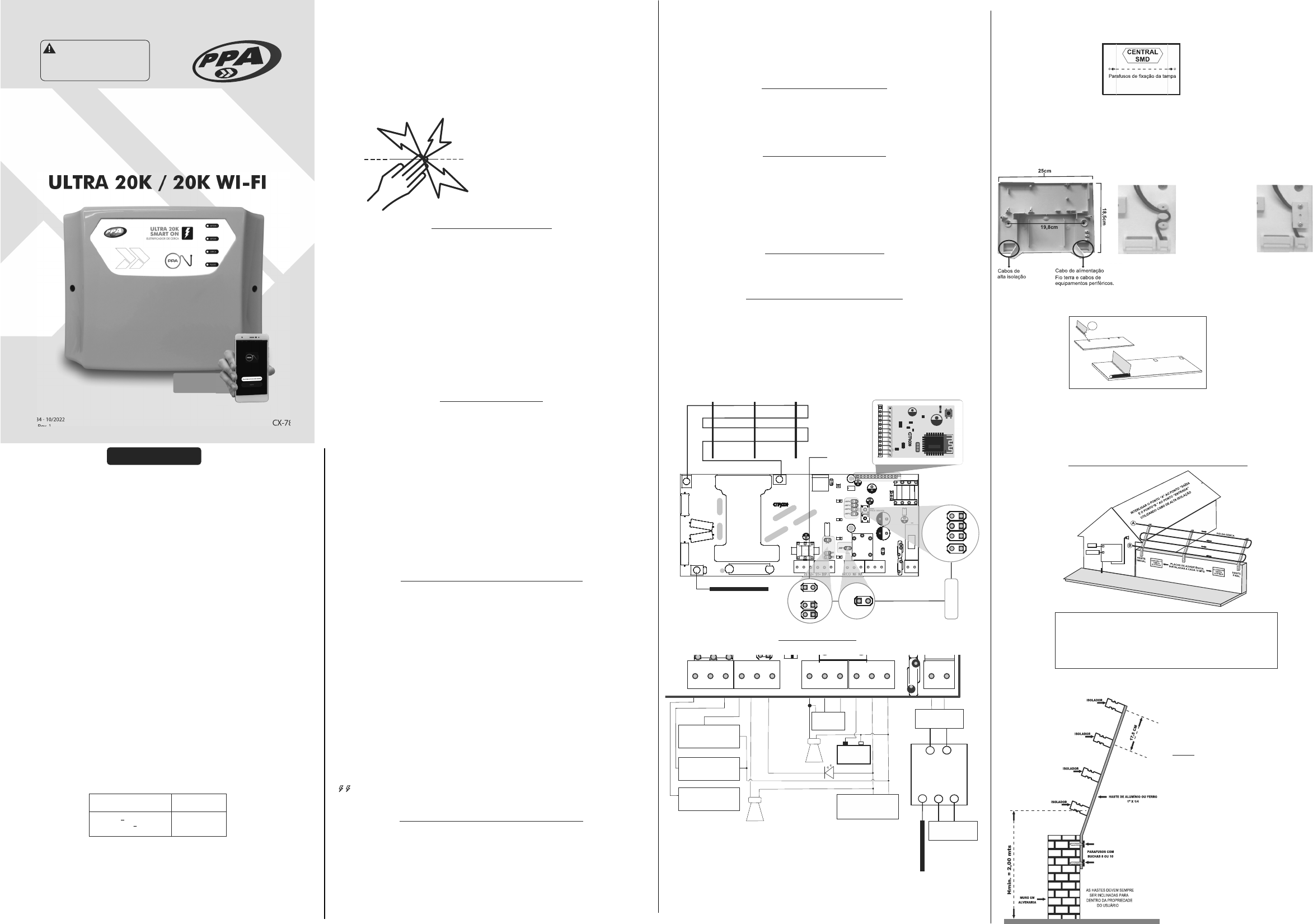 Tensão da linha de energia elétrica(V) Distância de separação (M) 33000 3 4 8 > 1000 ea função escolhida, até a central emitir um BIP curto de sirene indicando que o cadastramento obteve sucesso. Para cadastrar as demais teclas basta repetir a operação acima pressionando o botão escolhido. CADASTRANDO SENSORES SEM FIO. 1. FECHAR o JUMPER pertencente a ZONA que deseja cadastrar o sensor sem fio. 2. Pressionar o botão ‘‘PROG. SENSOR’’ em seguida o LED PULSO deve acender. 3. Acionar sensor sem fio até a central emitir um BIP curto de sirene indicando que o cadastramento obteve sucesso. Obs. 1: O eletrificador pode gravar até 30 códigos (cada tecla do controle remoto aprendida pela placa é considerada como um código gravado). Obs. 2: Para apagar toda a memória da central deve-se realizar os seguintes passos: 1- Desalimentar completamente a central. 2 - Manter pressionado o botão ‘‘PROG. CONTROLE’’ e realimentar a central. O ‘‘LED PULSO’’ acenderá por 1 segundo indicando que a memória foi apagada. CADASTRANDO A FUNÇÃO PÂNICO. 1. ABRIR os JUMPERS S1, S2 e JMPX. 2. Pressionar o botão ‘‘PROG. CONTROLE’’, em seguida o LED PULSO deve acender. 3. Pressionar a tecla do controle que deseja acionar a função ‘‘Pânico’’ até a central emitir um BIP curto de sirene indicando que o cadastramento obteve sucesso. IDENTIFICAÇÃO DOS LEDS (CONSULTAR FIG. 1) LED “PULSO” Piscando: Indica retorno de pulso satisfatório e que a cerca está normal. Aceso: Indica que a central está em modo de gravação de controle remoto/sensor sem fio. LEDs S1/S2: Quando aceso indica zona armada, apagado zona desarmada, piscando indica violação do setor. CERCA: Quando aceso indica cerca eletrificada, apagado indica cerca sem choque, piscando indica violação. Memória de disparo: quando ocorrer um situação de disparo ao pressionar qualquer tecla do controle remoto a central emitirá dois bips curtos ( para apagar a memória de disparo deve se ativar a função desejada com o botão que corresponde com o setor ou perímetro de cerca elétrica violados.) CONDIÇÕES SOBRE A INSTALAÇÃO: - Portões em cercas elétricas de segurança devem ser capazes de serem abertos sem que a pessoa receba um choque elétrico. - Partes condutivas expostas da barreira física devem ser eficientemente aterradas. - Onde uma cerca elétrica de segurança passar abaixo de condutores de linha de energia elétrica sem isolação, seu elemento metálico mais elevado deve ser eficientemente aterrado por uma distância não inferior à 5m para ambos os lados do ponto de cruzamento. - Se condutores de conexão e fios da cerca elétrica de segurança forem instalados próximos à linhas de energia elétrica aéreas, a altura destes em relação ao solo não deve exceder 3m. Esta altura se aplica a qualquer lado da projeção ortogonal dos condutores mais externos da linha de energia elétrica na superfície do solo, para uma distância de: 1) 2m para linhas de energia elétrica operando a uma tensão nominal não excedendo 1000V; 2) 15m para linhas de energia elétrica operando a uma tensão nominal excedendo 1000V; Uma distância vertical não inferior a 2m deve ser mantida entre condutores energizados por pulsos por eletrificadores distintos. Os condutores de conexão instalados por dentro de prédios devem ser eficientemente isolados das partes estruturais do prédio. Isto pode ser obtido utilizando-se um cabo isolante para alta tensão. O equipamento destina-se à segurança patrimonial, e tem por finalidade a proteção periférica de imóveis residenciais, comerciais, condomínios, indústrias etc. Tal proteção é efetuada através da eletrificação de cercas instaladas sobre muros ou grades do imóvel. A função básica é evitar o acesso de intrusos ao local protegido, gerando um choque elétrico não fatal àqueles que venham tocar na fiação da cerca elétrica. CARACTERÍSTICAS TÉCNICAS: - Alimentação CA Bivolt Automático: 90~240Vac. - Alimentação CC: 12V (Recomendamos utilizar bateria seco gelatinosa estácionaria). Durante a carga, as baterias de chumbo-ácido devem ser colocadas em local bem ventilado. Não utilizar baterias não- recarregáveis, autonomia da bateria: 12 horas. - Consumo: 5 Watts.(Para as duas faixas de tensão 110V e 220V) - Frequência nominal: 50/60Hz. - Tensão de saída: 12KV ou 20KV pulsativos; - Energia acumulada: 12KV/0,5J 20KV/1,5J; - Taxa de repetição de impulso:AUXILIAR 12V CORRENTE MÁXIMA: 100mA + -+ - S IR alarme Saída p/ B IP Rede elétrica 127/220 V PROTETOR DE REDE AC AC AC ACT Rede elétrica 127/220 V Haste de aterramento exclusivo para o protetor de rede Entrada para sensores com fio. Entrada para sensores com fio. Entrada do módulo WIFI + - - INSTALAÇÃO DO EQUIPAMENTO Este equipamento deve ser fixado a uma parede através de parafusos e buchas, na posição vertical (conforme a Figura 2), protegido do sol e da chuva, de maneira que o usuário não possa alterar o posicionamento sem o auxilio de ferramentas. O equipamento e a cerca por ele eletrificada não devem ser instalados em locais onde prevaleçam condições especialmente perigosas tais como, por exemplo, atmosfera explosiva, líquidos inflamáveis ou corrosivos, etc. Ao terminar a instalação, sempre feche o equipamento utilizando os parafusos para fixação da tampa ao fundo do gabinete plástico. Na figura 3 mostra o tamanho do gabinete plástico, a distância entre os parafusos de fixação à parede, e as entradas para os cabos de alta isolação, o cabo de alimentação CA da central, o fio terra e os cabos de equipamentos periféricos. Figura 2 Posição correta (vertical) de fixação do equipamento a uma parede. Figura 4 Figura 5 Na figura 5 vemos, como prender o cabo utilizando o prensa cabos. O cabo de alimentação deve ser no mínimo 2x20 AWG(0,5mm²). Nas figuras abaixo, mostram como deve ser feira a Na figura 4 como o cabo deve ficar através 