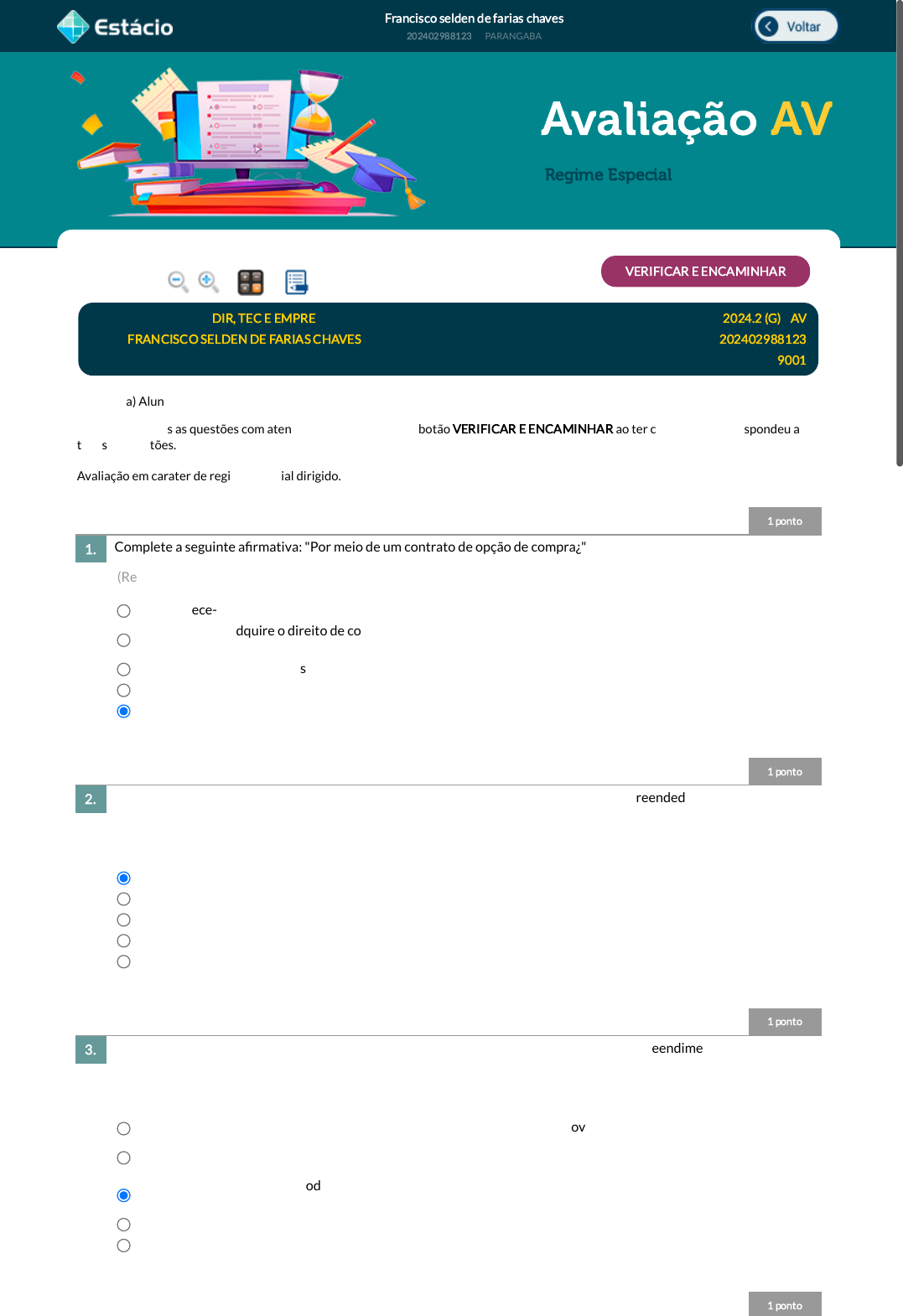 Francisco selden de farias chaves Avaliação AV 202402988123 PARANGABA Regime Especial 1 ponto Complete a seguinte a�rmativa: "Por meio de um contrato de opção de compra¿" (Ref.: 202408524228) 1 ponto Há dois tipos de empreendedorismo: empreendedorismo de pequeno/médio porte e empreendedorismo movido à inovação. Assinale a alternativa que apresenta um negócio do tipo empreendedorismo movido à inovação. (Ref.: 202409157575) 1 ponto O plano de negócios é dividido em seções que devem estar de acordo com o escopo do empreendimento. Uma dessas seções é o sumário executivo, qual é a importância do sumário executivo no plano de negócios? (Ref.: 202410911859) 1 ponto Lupa Calc. Notas VERIFICAR E ENCAMINHAR Disciplina: ARA0579 - DIR, TEC E EMPRE Período Acad.: 2024.2 (G) / AV Aluno: FRANCISCO SELDEN DE FARIAS CHAVES Matrícula: 202402988123 Turma: 9001 Prezado(a) Aluno(a), Responda a todas as questões com atenção. Somente clique no botão VERIFICAR E ENCAMINHAR ao ter certeza de que respondeu a todas as questões. Avaliação em carater de regime especial dirigido. 1. Estabelece-se o vínculo empregatício entre os empregados e os sócios de uma startup. O comprador adquire o direito de comprar participação societária em um determinado período por um valor pré- �xado. A compra de participação societária é realizada no momento da assinatura do contrato. Contrata-se um funcionário para uma startup. Obtém-se um empréstimo conversível. 2. Aplicativo de celular para conectar pessoas. Clínica de �sioterapia. Cafeteria self-service. Empresa de manutenção de ar-condicionado. Salão de cabeleireiro. 3. Detalhar todas as informações relevantes sobre o desenvolvimento do novo negócio. É uma seção opcional do plano de negócios, que pode ser excluída caso não haja informações relevantes a serem incluídas. Resumir de forma sucinta todas as informações importantes do plano de negócios, desde o estágio atual da empresa até as projeções para o futuro. Fornecer informações apenas sobre o estágio atual da empresa. Incluir informações apenas sobre o que se projeta para o futuro da empresa. 28/11/2024, 00:52 Estácio: Alunos https://simulado.estacio.br/alunos/ 1/1 javascript:voltar(); javascript:voltar(); javascript:diminui(); javascript:diminui(); javascript:aumenta(); javascript:aumenta(); javascript:calculadora_on(); javascript:calculadora_on(); javascript:anotar_on(); javascript:anotar_on(); 1 ponto A criação de valor dos serviços está sensivelmente atrelada aos apectos intangíveis da prestação de serviço. Mesmo assim, existem serviços que possuem a entrega de produtos físicos atrelados à prestação do serviço. Assinale um exemplo de serviço que possui um produto físico durante sua prestação. (Ref.: 202410903373) 1 ponto Uma cadeia de cinemas sofre sistematicamente com a sazonalidade da demanda. Ou seja, as sessões das 20h e das 22h sempre �cam lotadas, e várias pessoas retornam para casa sem conseguir um assento, enquanto, nas sessões das 14h e das 16h, sobram assentos. Essa impossibilidade de ser estocado é uma característica dos serviços. Tal característica é conhecida como: (Ref.: 202408478946) 1 ponto Os serviços são classi�cados de acordo com sua natureza. Os serviços pro�ssionais são aqueles que: I. atendem muitas pessoas por dia II. possuem alto contato III. são muito customizáveis IV. têm ênfase em pessoas. Assinale a alternativa que indica os itens corretos. (Ref.: 202410903371) 1 ponto A última etapa do processo de inovação é a avaliação das inovações. Para isso são usados indicadores de resultado e indicadores de implementação. O gerenciamento da estrutura é um dos indicadores de implementação. Assinale a alternativa que sobre o gerenciamento da estrutura. (Ref.: 202410792008) Incluir informações apenas sobre o que se projeta para o futuro da empresa. 4. Streaming de música, como Spotify. Internet bank. Açúcar. Restaurante fast food. Detergente. 5. simultaneidade. heterogeneidade. intangibilidade. interatividade. perecibilidade. 6. I, II e III, apenas. II, III e IV, apenas. I, II, III e IV. I, III e IV, apenas. I e IV, apenas. 7. Percentual de indicadores de performance individual e grati�cações alinhados com a estratégia de inovação, qualidade da infraestrutura das tecnologias da informação (TI) e quantidade de recursos �nanceiros disponíveis para inovação. Fatia dos esforços dedicados a cada categoria de inovação (disruptiva, incremental e lateral), alinhamento entre distribuição de recursos e estratégia de inovação. Fatia do orçamento dedicada ao esforço de inovação comparada com o total do orçamento da empresa, investimentos em treinamento dos funcionários e grau de envolvimento dos setores da empresa em soluções inovadoras. Redução de custos dentro do planejado, tempo real de desenvolvimento da inovação em comparação com o tempo esperado, velocidade de produção e entrega, produtividade da equipe de P&D e número de patentes registradas 28/11/2024, 00:53 Estácio: Alunos https://simulado.estacio.br/alunos/ 1/1 1 ponto As naturezas de patente previstas na Lei n° 9.279/96 são: (Ref.: 202408524024) 1 ponto Dentro da Teoria da Análise Econômica do Direito, há um estudo para a análise comportamental não objetiva, de forma alguma, invalidar ou refutar os fundamentos da teoria do modelo da escolha racional, mas re�nar a análise da estrutura decisória inserindo aspectos psicológicos e veri�cáveis em experimentos práticos - explicados pelos conceitos das heurísticas e os vieses cognitivos. Ante o estudado, marque a alternativa que corresponde a um exemplo de heurísticas e vieses cognitivos: (Ref.: 202411123219) 1 ponto Tendo em vista que a economia é a ciência que estuda o comportamento, ou seja, como realizamos as decisões e analisamos suas consequências, é necessário partir de alguns pressupostos. Ante essa a�r