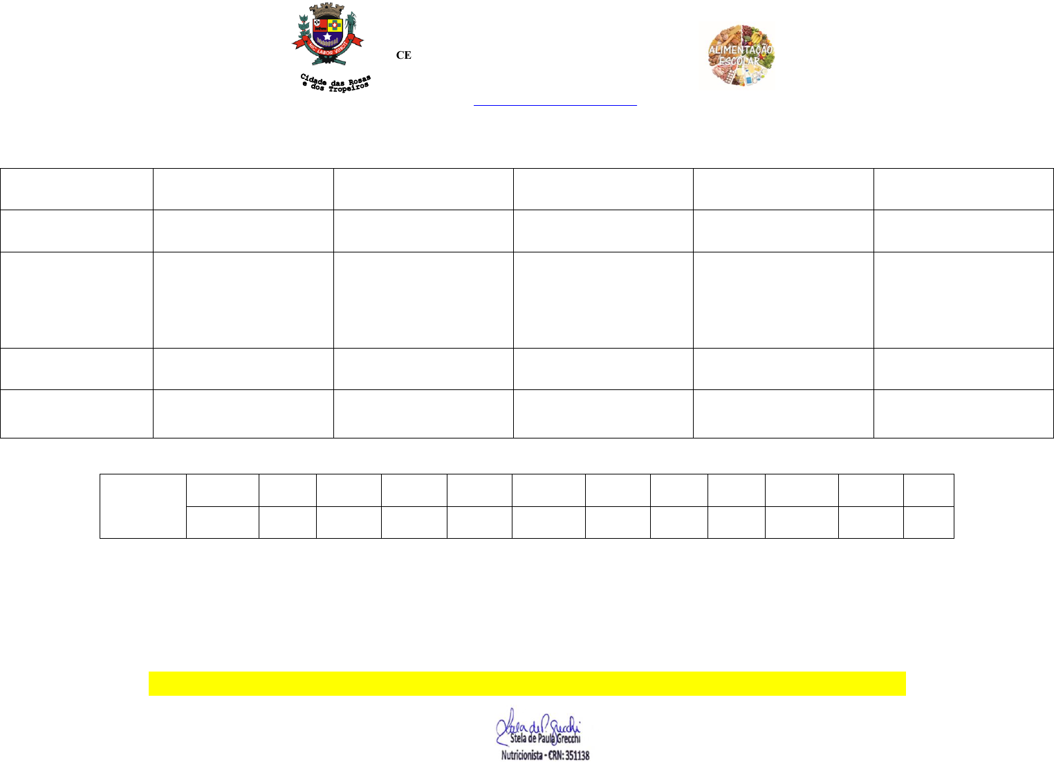 OBS: Cardápio sujeito a alterações conforme condições de CONSUMO E ENTREGA PREFEITURA MUNICIPAL DE CERQUILHO CENTRAL DE ALIMENTOS - COZINHA PILOTO Rua Nelson Gazabin nº 367- Nova Cerquilho Telefone: (15) 3284-1540 e-mail: centralimentos@cerquilho.sp.gov.br Cardápio – BERÇÁRIO / 6 a 12 meses REFEIÇÃO 2ª FEIRA 31/03/25 3ª FEIRA 01/04/25 4ª FEIRA 02/04/25 5ª FEIRA 03/04/25 6ª FEIRA 04/04/25 Café da Manhã 8h00 Mamadeira com fórmula de seguimento Mamadeira com fórmula de seguimento Mamadeira com fórmula de seguimento Almoço 11h00 Sopa de macarrão argolinha, inhame, cenoura e abobrinha c/ carne Laranja lima Canja (frango, batata, arroz, cheiro verde) Melancia Caldinho de feijão com macarrão argolinha, batata, cenoura, abobrinha c/carne Melão FERIADO Ponto Facultativo Lanche 1 13h00 Mamadeira com fórmula de seguimento Mamadeira com fórmula de seguimento Mamadeira com fórmula de seguimento Lanche 2 15h30 Polenta com carne moída Sopa de feijão com macarrão Canja Valor Nutricional Média Semanal Energia (kcal) CHO (g) PTN (g) LIP (g) FIBRAS (mg) Ca (mg) Mg (mg) Fe (mg) Zn (mg) Vit. A (µg) Vit. C (µg) VET* 411,36 55,91 13,37 15,67 4,19 317,26 46,60 5,64 4,77 391,11 99,50 70% *VET- Valor energético total Para crianças menores de 6 meses oferecer Leite Materno (LM) ou fórmula infantil 1 nos horários das refeições. A partir dos 6 meses serão oferecidos os alimentos complementares que deverão apresentar desde o início consistência pastosa (alimentos bem cozidos, picados e bem amassados com garfo) Não é recomendado ser batido no liquidificador, nem processador. Progredir gradativamente aumentando a consistência. A partir de 9 meses os alimentos poderão ser oferecidos levemente amassados ou cortados em pequenos pedaços, respeitando sempre a aceitação e o desenvolvimento da criança. Oferecer água nos intervalos das refeições. Respeitando sempre a aceitação e o desenvolvimento da criança.