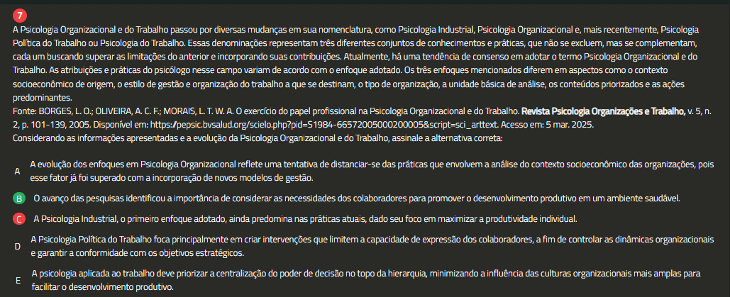 7 A Psicologia Organizacional e do Trabalho passou por diversas mudanças em sua nomenclatura, como Psicologia Industrial, Psicologia Organizacional e, mais recentemente, Psicologia Política do Trabalho ou Psicologia do Trabalho. Essas denominações representam três diferentes conjuntos de conhecimentos e práticas, que não se excluem, mas se complementam, cada um buscando superar as limitações do anterior e incorporando suas contribuições. Atualmente, há uma tendência de consenso em adotar termo Psicologia Organizacional e do Trabalho. As atribuições e práticas do psicólogo nesse campo variam de acordo com enfoque adotado. Os três enfoques mencionados diferem em aspectos como contexto socioeconômico de origem, estilo de gestão e organização do trabalho a que se destinam, tipo de organização, a unidade básica de análise, os conteúdos priorizados e as ações predominantes. Fonte: L. C. MORAIS, L exercício do papel profissional na Psicologia Organizacional e do Trabalho. Revista Psicologia Organizações e Trabalho, V. 5, n. 2, p. 101-139, Disponível Acesso em: 5 mar. 2025. Considerando as informações apresentadas e a evolução da Psicologia Organizacional e do Trabalho, assinale a alternativa correta: A evolução dos enfoques em Psicologia Organizacional reflete uma tentativa de distanciar-se das práticas que envolvem a análise do contexto socioeconômico das organizações, pois A esse fator já foi superado com a incorporação de novos modelos de gestão. das pesquisas identificou a importância de considerar as necessidades dos colaboradores para promover desenvolvimento produtivo em um ambiente saudável. A Psicologia Industrial, primeiro enfoque adotado, ainda predomina nas práticas atuais, dado seu foco em maximizar a produtividade individual. A Psicologia Política do Trabalho foca principalmente em criar intervenções que limitem a capacidade de expressão dos colaboradores, a fim de controlar as dinâmicas organizacionais D e garantir a conformidade com os objetivos estratégicos. A psicologia aplicada ao trabalho deve priorizar a centralização do poder de decisão no topo da hierarquia, minimizando a influência das culturas organizacionais mais amplas para E facilitar desenvolvimento produtivo.