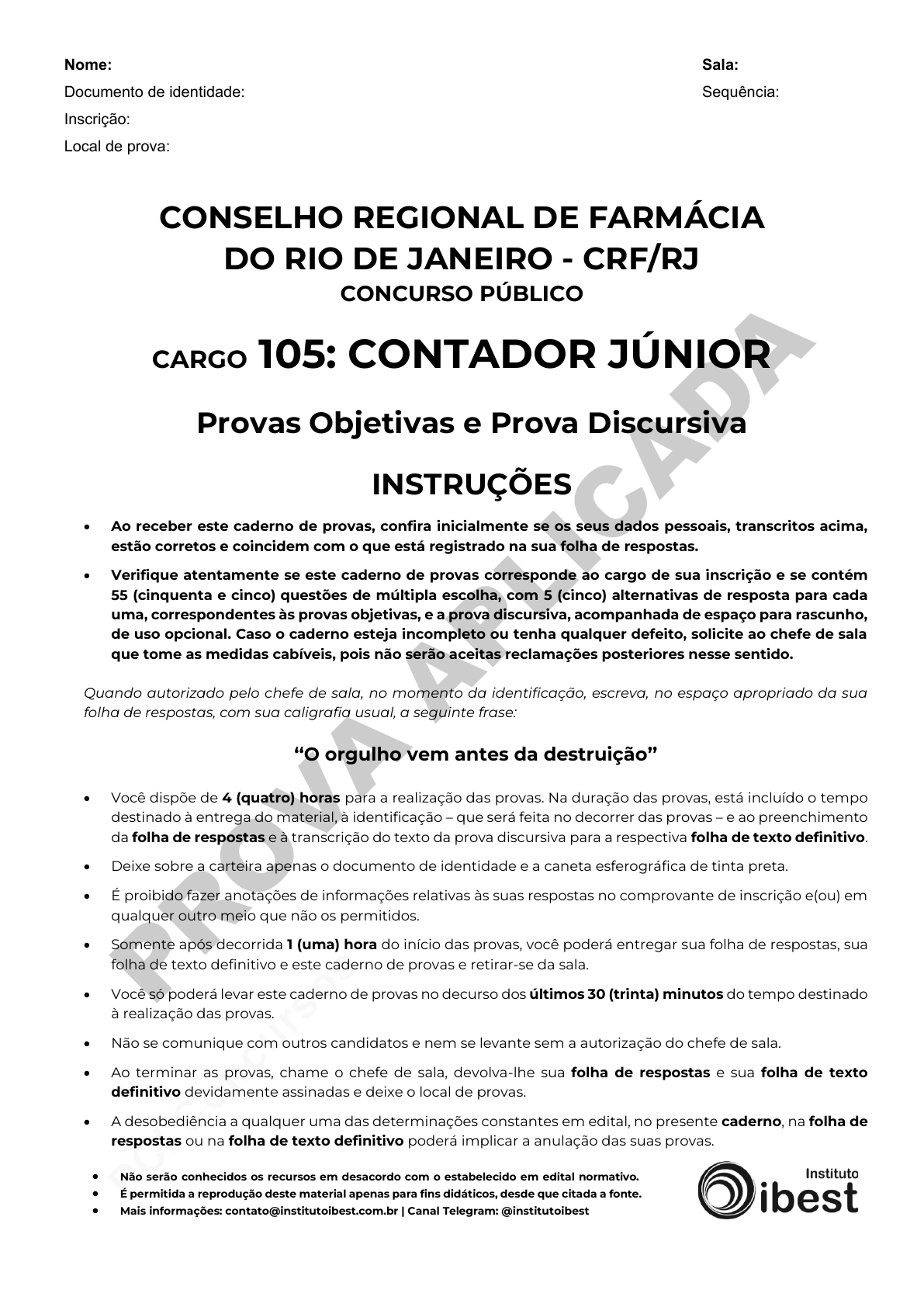 pcimarkpci MjAwMTowOGEwOjVlYzc6YzcwMDo1MTkyOmNjNTc6ODYzMTphYzVk:U2F0LCAwNSBBcHIgMjAyNSAxNDoyMToyMSAtMDMwMA== www.pciconcursos.com.br Nome: Sala: Documento de identidade: Sequência: Inscrição: Local de prova: CONSELHO REGIONAL DE FARMÁCIA DO RIO DE JANEIRO - CRF/RJ CONCURSO PÚBLICO CARGO 105: CONTADOR JÚNIOR Provas Objetivas e Prova Discursiva INSTRUÇÕES • Ao receber este caderno de provas, confira inicialmente se os seus dados pessoais, transcritos acima, estão corretos e coincidem com o que está registrado na sua folha de respostas. • Verifique atentamente se este caderno de provas corresponde ao cargo de sua inscrição e se contém 55 (cinquenta e cinco) questões de múltipla escolha, com 5 (cinco) alternativas de resposta para cada uma, correspondentes às provas objetivas, e a prova discursiva, acompanhada de espaço para rascunho, de uso opcional. Caso o caderno esteja incompleto ou tenha qualquer defeito, solicite ao chefe de sala que tome as medidas cabíveis, pois não serão aceitas reclamações posteriores nesse sentido. Quando autorizado pelo chefe de sala, no momento da identificação, escreva, no espaço apropriado da sua folha de respostas, com sua caligrafia usual, a seguinte frase: ‘‘O orgulho vem antes da destruição’’ • Você dispõe de 4 (quatro) horas para a realização das provas. Na duração das provas, está incluído o tempo destinado à entrega do material, à identificação – que será feita no decorrer das provas – e ao preenchimento da folha de respostas e à transcrição do texto da prova discursiva para a respectiva folha de texto definitivo. • Deixe sobre a carteira apenas o documento de identidade e a caneta esferográfica de tinta preta. • É proibido fazer anotações de informações relativas às suas respostas no comprovante de inscrição e(ou) em qualquer outro meio que não os permitidos. • Somente após decorrida 1 (uma) hora do início das provas, você poderá entregar sua folha de respostas, sua folha de texto definitivo e este caderno de provas e retirar-se da sala. • Você só poderá levar este caderno de provas no decurso dos últimos 30 (trinta) minutos do tempo destinado à realização das provas. • Não se comunique com outros candidatos e nem se levante sem a autorização do chefe de sala. • Ao terminar as provas, chame o chefe de sala, devolva-lhe sua folha de respostas e sua folha de texto definitivo devidamente assinadas e deixe o local de provas. • A desobediência a qualquer uma das determinações constantes em edital, no presente caderno, na folha de respostas ou na folha de texto definitivo poderá implicar a anulação das suas provas. • Não serão conhecidos os recursos em desacordo com o estabelecido em edital normativo. • É permitida a reprodução deste material apenas para fins didáticos, desde que citada a fonte. • Mais informações: contato@institutoibest.com.br | Canal Telegram: @institutoibest PROVA A PLI CADA pcimarkpci MjAwMTowOGEwOjVlYzc6YzcwMDo1MTkyOmNjNTc6ODYzMTphYzVk:U2F0LCAwNSBBcHIgMjAyNSAxNDoyMToyMSAtMDMwMA== www.pciconcursos.com.br CRF-RJ 105-CONTADOR JÚNIOR 1 Nas questões que avaliarem conhecimentos de informática e(ou) tecnologia da informação, a menos que seja explicitamente informado o contrário, considere que todos os programas mencionados estão em configuração- padrão e que não há restrições de proteção, de funcionamento e de uso em relação aos programas, arquivos, diretórios, recursos e equipamentos mencionados. CONHECIMENTOS BÁSICOS Texto para as questões de 1 a 10. 1 4 7 10 13 16 19 22 25 28 31 34 37 40 O Dia de Sobrecarga da Terra, também conhecido como Dia do Excesso de Capacidade da Terra, marca a “data em que a demanda da humanidade por recursos e serviços ecológicos em um determinado ano excede o que a Terra pode regenerar neste mesmo período de tempo”, explica a Global Footprint Network, uma organização internacional de pesquisa que calcula e organiza a efeméride. Em 2024, o Dia de Sobrecarga da Terra foi em 1.º de agosto. Mas como essa data é calculada, por que ela varia anualmente e qual é o seu significado? Para determinar a data do Dia de Sobrecarga da Terra a cada ano, a entidade que organiza a efeméride faz um cálculo “dividindo a biocapacidade do planeta (a quantidade de recursos ecológicos que a Terra é capaz de gerar naquele ano) pela pegada ecológica da humanidade (a demanda da humanidade para aquele ano) e multiplicando pelo número de dias em um ano”. O restante do ano, portanto, corresponde à superação global desses recursos. Conforme definido pela organização, a biocapacidade de uma cidade, de um estado ou de uma nação representa sua área terrestre e marítima biologicamente produtiva, que inclui florestas, pastagens, terras cultiváveis, áreas de pesca e terras construídas. Já a pegada ecológica se destina a medir a demanda de uma população por recursos como alimentos, produtos de pecuária e pesca, madeira, espaço para infraestrutura urbana e florestas, entre outros. Não é de se surpreender que, se a demanda de uma população por bens ecológicos exceder a quantidade disponível, essa região terá um déficit ecológico. “Uma região em déficit ecológico satisfaz a demanda importando, liquidando seus próprios bens ecológicos (como a pesca excessiva) e/ou emitindo dióxido de carbono na atmosfera”, explica a organização. Como a organização ressalta, o cálculo se baseia nas Contas Nacionais de Pegada Ecológica e Biocapacidade, que se apoiam em estatísticas das Nações Unidas, administradas pela Footprint Data Foundation (uma organização independente e sem fins lucrativos encarregada de garantir a continuidade, a confiabilidade, o rigor e a utilidade das Contas Nacionais) e mantidas pela Universidade de York, no Canadá. Todos os anos, a Global Footprint Network anuncia a data do Dia de Sobrecarga da Terra do ano corrente em 5 de junho, que 