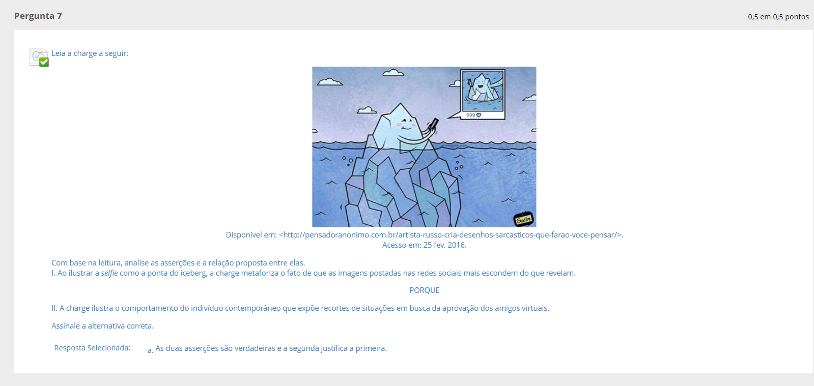 Leia a charge a seguir: Disponível Acesso em: 25 fev. 2016. Com base na leitura, analise as asserções e a relação proposta entre elas. I. Ao ilustrar a selfie como a ponta do iceberg, a charge metaforiza O fato de que as imagens postadas nas redes sociais mais escondem do que revelam. PORQUE II. A charge ilustra comportamento do indivíduo contemporâneo que expõe recortes de situações em busca da aprovação dos amigos virtuais. Assinale a alternativa correta. Resposta Selecionada: a. As duas asserções são verdadeiras e a segunda justifica a primeira.