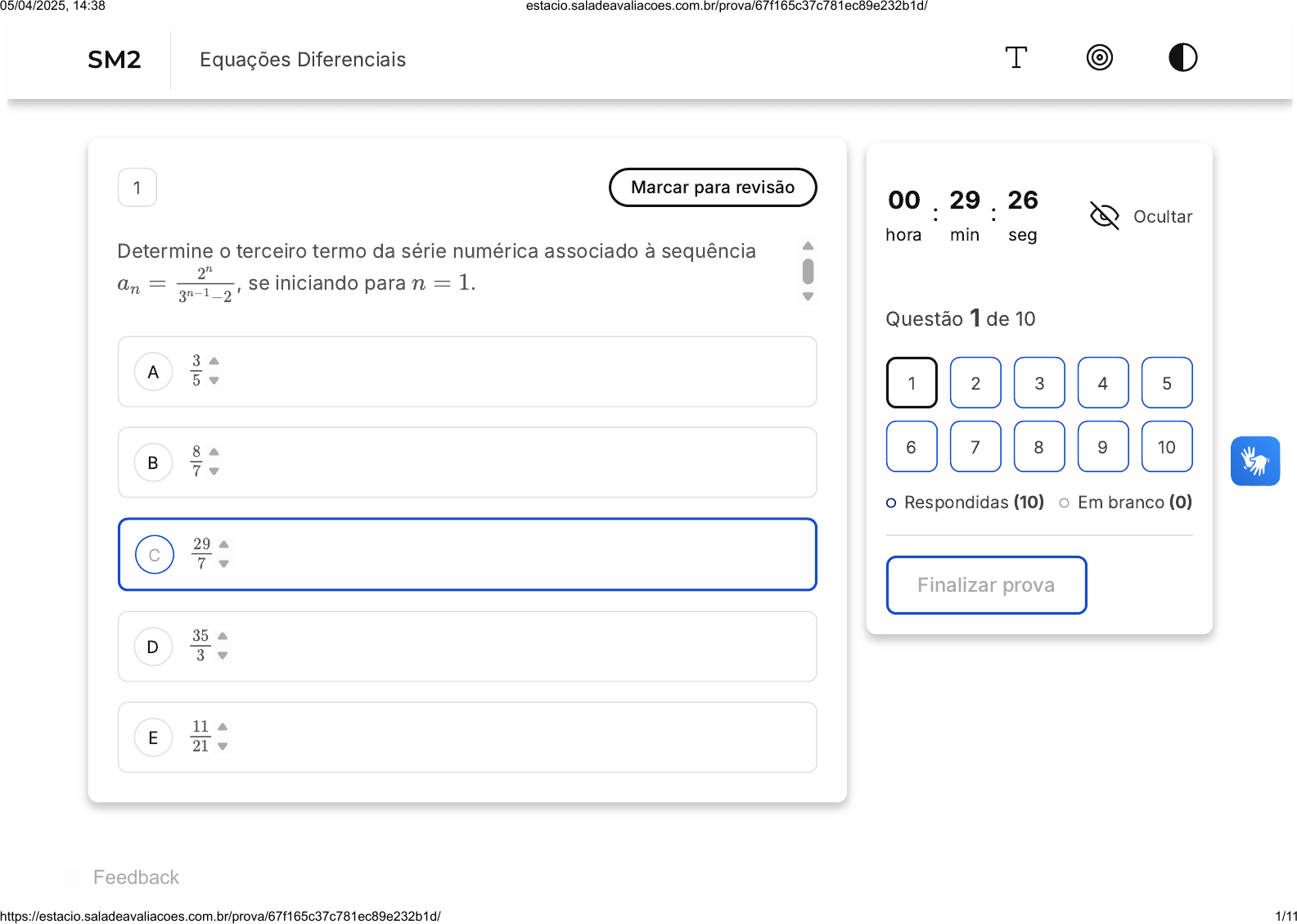 A B C D E 1 Marcar para revisão Determine o terceiro termo da série numérica associado à sequência , se iniciando para .an = 2n 3n−1−2 n = 1 3 5 8 7 29 7 35 3 11 21 00 hora : 29 min : 26 seg Ocultar Questão 1 de 10 Respondidas (10) Em branco (0) Finalizar prova 1 2 3 4 5 6 7 8 9 10 SM2 Equações Diferenciais Feedback 05/04/2025, 14:38 estacio.saladeavaliacoes.com.br/prova/67f165c37c781ec89e232b1d/ https://estacio.saladeavaliacoes.com.br/prova/67f165c37c781ec89e232b1d/ 1/11 A B C D E 2 Marcar para revisão Marque a alternativa correta em relação às séries e . sn = Σ∞ 1 (k+1)k+1 (k+1)! tn = Σ∞ 1 3k+2 k+1! Ambas são divergentes. Ambas são convergentes. A série é divergente e é convergente.sn tn A série é convergente e é divergente.sn tn Não é possível analisar a convergência das séries. 3 Marcar para revisão 05/04/2025, 14:38 estacio.saladeavaliacoes.com.br/prova/67f165c37c781ec89e232b1d/ https://estacio.saladeavaliacoes.com.br/prova/67f165c37c781ec89e232b1d/ 2/11 A B C D E Marque a alternativa correta em relação às séries e . sn = Σ∞ 1 n3+2n √n7+1 tn = Σ∞ 1 4 5n−1 Ambas são divergentes. Ambas são convergentes. A série é divergente e é convergente.sn tn A série é convergente e é divergente.sn tn Não é possível analisar a convergência das séries. 4 Marcar para revisão Determine o raio e o intervalo de convergência, respectivamente, da série de potência Σ∞ 1 (x+4)k (k+1)! 05/04/2025, 14:38 estacio.saladeavaliacoes.com.br/prova/67f165c37c781ec89e232b1d/ https://estacio.saladeavaliacoes.com.br/prova/67f165c37c781ec89e232b1d/ 3/11 A B C D E e ( − , ]1 2 1 2 1 2 1 e ( − , ]1 2 1 2 0 e [ ]1 2 e ( − 1, ]1 2 1 2 ∞ e (−∞, ∞) 5 Marcar para revisão Sabendo que a transformada de Laplace da função f(t) vale , sendo n um número inteiro, obtenha a transformada de Laplace de e t f(t). 1 (s2+4)(n+1) 3 05/04/2025, 14:38 estacio.saladeavaliacoes.com.br/prova/67f165c37c781ec89e232b1d/ https://estacio.saladeavaliacoes.com.br/prova/67f165c37c781ec89e232b1d/ 4/11 A B C D E s−4 (s2−6s+13)(n+4) s (s2−6s+13)(n+1) 1 (s2−6s+13)(n+1) s−4 (s2−6s+26)(n+1) 4 (s2+6s+26)(n+1) 6 Marcar para revisão Determine a transformada de Laplace da função g(t) = t cos t, sabendo que ℒ [ cos t] = 2 s s2+1 05/04/2025, 14:38 estacio.saladeavaliacoes.com.br/prova/67f165c37c781ec89e232b1d/ https://estacio.saladeavaliacoes.com.br/prova/67f165c37c781ec89e232b1d/ 5/11 A B C D E s(s2+3) (s2−1)3 2(s2−3) (s2−3) s(s2−3) (s2+1)3 2s(s2+3) (s2−1)3 2s(s2−3) (s2+1)3 7 Marcar para revisão A transformada de Laplace é usada para resolver equações diferenciais ordinárias com condições iniciais. Sabendo que é uma função seccionalmente contínua, definida sobre e cuja derivada é seccionalmente contínua e de ordem exponencial. E que e , calcule . f [0, +∞) f(0) = 1 L{f(t)}(s) = arctan(s) L{e2tf ′(t)} (s) 05/04/2025, 14:38 estacio.saladeavaliacoes.com.br/prova/67f165c37c781ec89e232b1d/ https://estacio.saladeavaliacoes.com.br/prova/67f165c37c781ec89e232b1d/ 6/11 A B C D E L [e2tf ′(t)] (s) = (s − 1) ⋅ arctan(s − 1) − 1. L [e2tf ′(t)] (s) = (s − 2) ⋅ arctan(s − 2) − 1. L [e2tf ′(t)] (s) = (s − 3) ⋅ arctan(s − 3) − 1. L [e2tf ′(t)] (s) = (s − 4) ⋅ arctan(s − 4) − 1. L [e2tf ′(t)] (s) = (s − 5) ⋅ arctan(s − 5) − 1. 8 Marcar para revisão Seja um circuito RC em série com resistência de 100Ω e capacitor de 1F. A tensão é fornecida por meio de uma fonte contínua de 50V ligada em t = 0s. Determine a corrente no capacitor após 2 s. 05/04/2025, 14:38 estacio.saladeavaliacoes.com.br/prova/67f165c37c781ec89e232b1d/ https://estacio.saladeavaliacoes.com.br/prova/67f165c37c781ec89e232b1d/ 7/11 A B C D E 0,25 e- 1 100 0,5 e - 1 50 0,5 e - 1 100 0,25 e - 1 50 0,25 e -1 9 Marcar para revisão Uma esfera com 20 C de temperatura é colocada totalmente em um líquido que está a 100 C. Sabendo que a constante de tempo de aquecimento vale 10 seg., determine a temperatura da esfera, em C, após 10 seg. 0 0 0 05/04/2025, 14:38 estacio.saladeavaliacoes.com.br/prova/67f165c37c781ec89e232b1d/ https://estacio.saladeavaliacoes.com.br/prova/67f165c37c781ec89e232b1d/ 8/11 A B C D E Entre 60 e 70 Entre 70 e 80 Entre 80 e 90 Entre 90 e 100 Entre 100 e 110 10 Marcar para revisão Você foi incumbido de delimitar um terreno retangular de 300 m usando muros externos e divisórias internas como mostrado na figura abaixo. 2 05/04/2025, 14:38 estacio.saladeavaliacoes.com.br/prova/67f165c37c781ec89e232b1d/ https://estacio.saladeavaliacoes.com.br/prova/67f165c37c781ec89e232b1d/ 9/11 A B C Sabendo-se que o preço do muro é de R 5,00/m, determine as dimensões do terreno de modo que o custo total seja o menor possível. 10, 00/meopreçodasdivisóriasédeR x = 5√6m e y = 10√6m. x = 6√10m e y = 5√6m. x = 6√10m e y = 6√10m. 05/04/2025, 14:38 estacio.saladeavaliacoes.com.br/prova/67f165c37c781ec89e232b1d/ https://estacio.saladeavaliacoes.com.br/prova/67f165c37c781ec89e232b1d/ 10/11 D E x = 5√10m e y = 6√10m. x = 10√10m e y = 10√10m. 05/04/2025, 14:38 estacio.saladeavaliacoes.com.br/prova/67f165c37c781ec89e232b1d/ https://estacio.saladeavaliacoes.com.br/prova/67f165c37c781ec89e232b1d/ 11/11