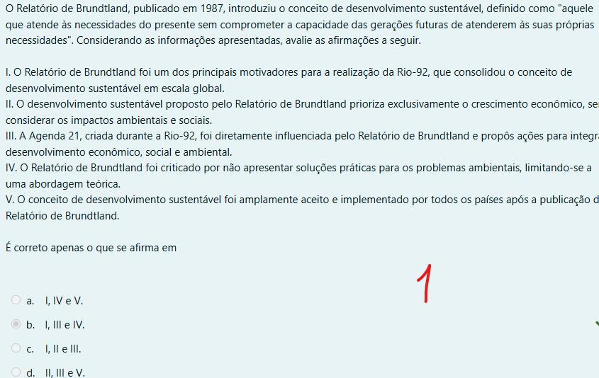 o Relatório de Brundtland, publicado em 1987, introduziu o conceito de desenvolvimento sustentável, definido como "aquele que atende às necessidades do presente sem comprometer a capacidade das gerações futuras de atenderem às suas próprias Considerando as informações apresentadas, avalie as afirmações a seguir. I. o Relatório de Brundtland foi um dos principais motivadores para a realização da Rio-92, que consolidou o conceito de desenvolvimento sustentável em escala global. II. o desenvolvimento sustentável proposto pelo Relatório de Brundtland prioriza exclusivamente crescimento econômico, se considerar os impactos ambientais e III. A Agenda 21, criada durante a Rio-92, foi diretamente influenciada pelo Relatório de Brundtland e propôs ações para desenvolvimento econômico, social e ambiental. IV. o Relatório de Brundtland foi criticado por não apresentar soluções práticas para os problemas ambientais, limitando-se a uma abordagem teórica. V. o conceito de desenvolvimento sustentável foi amplamente aceito e implementado por todos os países após a publicação d Relatório de Brundtland. É correto apenas que se afirma em 1 a. I, IV e V. b. I, III e IV. C. I, II e III. d. II, III e V.
