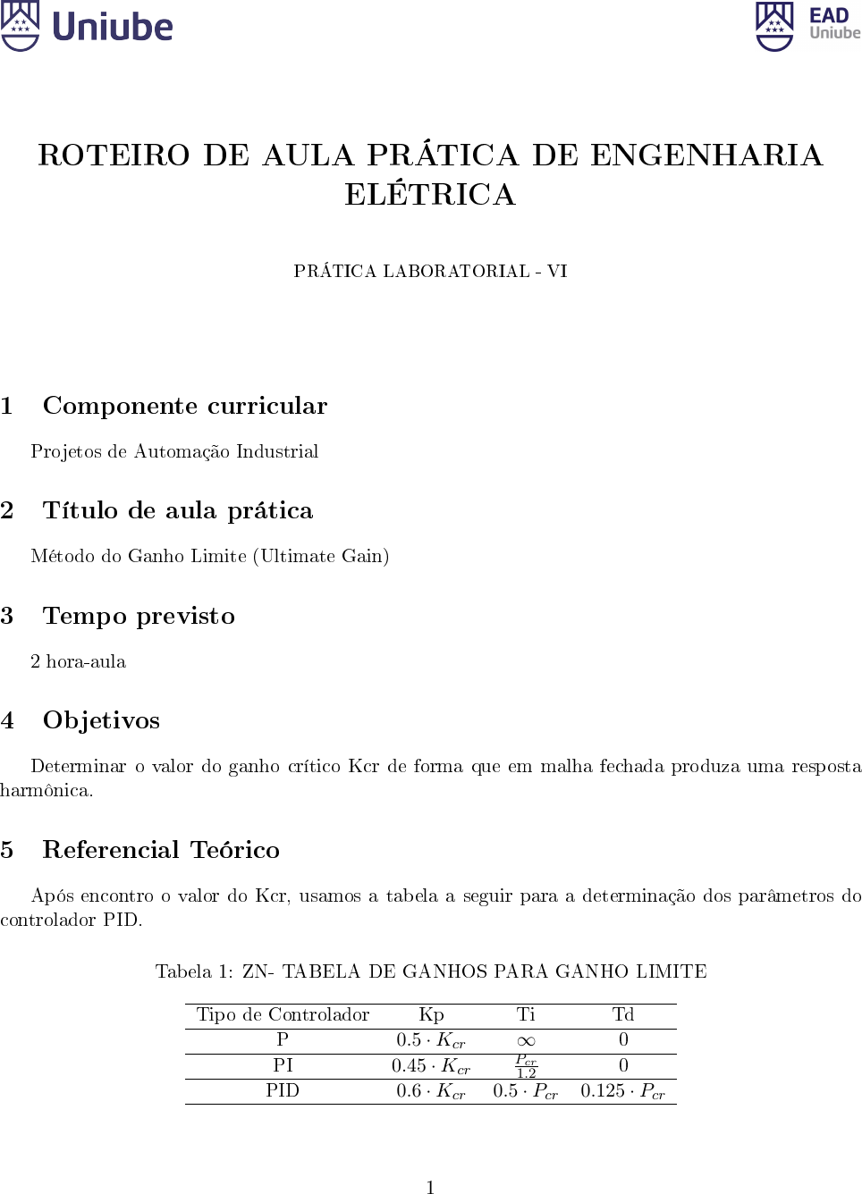 ROTEIRO DE AULA PRÁTICA DE ENGENHARIA ELÉTRICA PRÁTICA LABORATORIAL - VI 1 Componente curricular Projetos de Automação Industrial 2 Título de aula prática Método do Ganho Limite (Ultimate Gain) 3 Tempo previsto 2 hora-aula 4 Objetivos Determinar o valor do ganho crítico Kcr de forma que em malha fechada produza uma resposta harmônica. 5 Referencial Teórico Após encontro o valor do Kcr, usamos a tabela a seguir para a determinação dos parâmetros do controlador PID. Tabela 1: ZN- TABELA DE GANHOS PARA GANHO LIMITE Tipo de Controlador Kp Ti Td P 0.5 ·Kcr ∞ 0 PI 0.45 ·Kcr Pcr 1.2 0 PID 0.6 ·Kcr 0.5 · Pcr 0.125 · Pcr 1 Temos que a estrutura do PID é dada por: PID = Kp ( 1 + 1 Ti · s + Td · s ) = Kp + Ki s +Kd · s (1) 6 Equipamentos necessários Para a realização da prática, é necessário obter o(s) iten(s) apresentado(s) na tabela 2. Tabela 2: Relação de equipamentos utilizados na aula prática item Quant. Descrição 1 1 Scilab - www.scilab.org 2 1 Computador 7 Procedimentos experimentais Projete os controladores a seguir para a H(s) apresentada: � Proporcional; � Proporcional e integral; � Proposcional, Integral e Derivativo; H(s) = 2 · e−2s 7 · s+ 1 (2) 8 Cálculos e análises de resultados Levante a curva de resposta do controlador de todos os controladores. Referências [1] BOMFIM JUNIOR, Florisvaldo Cardozo. Modelagem de Funções de Transferência de Plantas Industriais em Malha Aberta e Fechada utilizando Algoritmos Genéticos. 2017. 51 f. Disserta- ção (Mestrado em Engenharia Elétrica)- Universidade Federal de Uberlândia, Uberlândia, 2017. Programa de Pós-graduação em Engenharia Elétrica. [2] Biradar, S., Hote, Y. V., and Saxena, S. (2016). Reduced-order modeling of linear time invariant systems using big bang big crunch optimization and time moment matching method. Applied Mathematical Modelling, 40(15�16):7225 � 7244. [3] Cabral, H. A. and de Melo, M. T. (2011). Using genetic algorithms for device modeling. IEEE Transactions on Magnetics, 47(5). [4] Deb, Kalyanmoy; Agrawal, R. B. (1995). Simulated binary crossover for continuous search space. Complex Systems, 9:115�148. [5] Goldberg, D. (1989). Genetic Algorithms in Search, Optimization and Machine Learning.Addison- Wesley Professional. 2 [6] He, T., Hong, L., Kaufman, A., and P�ster, H. (1996). Generation of transfer functions with stochastic search techniques. In Proceedings of the 7th Conference on Visualization'96, VIS '96, pages 227��., Los Alamitos, CA, USA. IEEE Computer Society Press. [7] Loyka, S. L. (1999). Applying genetic algorithm to modeling nonlinear transfer functions.In Te- lecommunications in Modern Satellite, Cable and Broadcasting Services, 1999.4th International Conference on, volume 1, pages 247�250 vol.1. [8] Marlin, T. E. (2014). Process Control: designing processes and control systems for dynamicper- formace. McGraw-Hill, Inc., 2 edition. [9] McCall, J. (2005). Genetic algorithms for modelling and optimisation. Journal of Computational and Applied Mathematics, 184:205�222. [10] Nedelea, L., Neag, M., Topa, M., Festila, L., and Topa, V. (2006). Analog �lter transfer function optimization based on a genetic algorithm. In Applied Electronics, Pielsen. [11] Tavakolpour, A. R., Darus, I. Z. M., Tokhi, O., and Mailah, M. (2010). Genetic algorithmbased identi�cation of transfer function parameters for a rectangular �exible plate system Engineering Applications of Arti�cial Intelligence. [12] MAYA, Paulo Alvaro, and Fabrizio LEONARDI. "Controle essencial."Ed Pearson Prentice Hall (2011). NBR 6023 [13] OGATA, Katsuhiko et al. Engenharia de Controle moderno; tradução Paulo Álvaro Maya; revisão técnica Fabrizio Leonardi.[et al]. São Paulo: Prentice Hall, v. 12, p. 15-17, 2003. [14] NISHIKAWA, Hiroaki. A �rst-order system approach for di�usion equation. I: Second-order residual-distribution schemes. Journal of Computational Physics, v. 227, n. 1, p. 315-352, 2007. [15] ARENALES, Selma; DAREZZO, Artur. Cálculo numérico: aprendizagem com apoio de software. Cengage Learning, 2008. [16] COLEY, David A. An introduction to genetic algorithms for scientists and engineers. World Scienti�c Publishing Co Inc, 1999. Elaboração do roteiro: Prof. Me. Florisvaldo C. Bom�m Jr Data: 15/05/2020 Revisão: Data: Organização: Prof. Me. Plauto Riccioppo Filho Data: 3