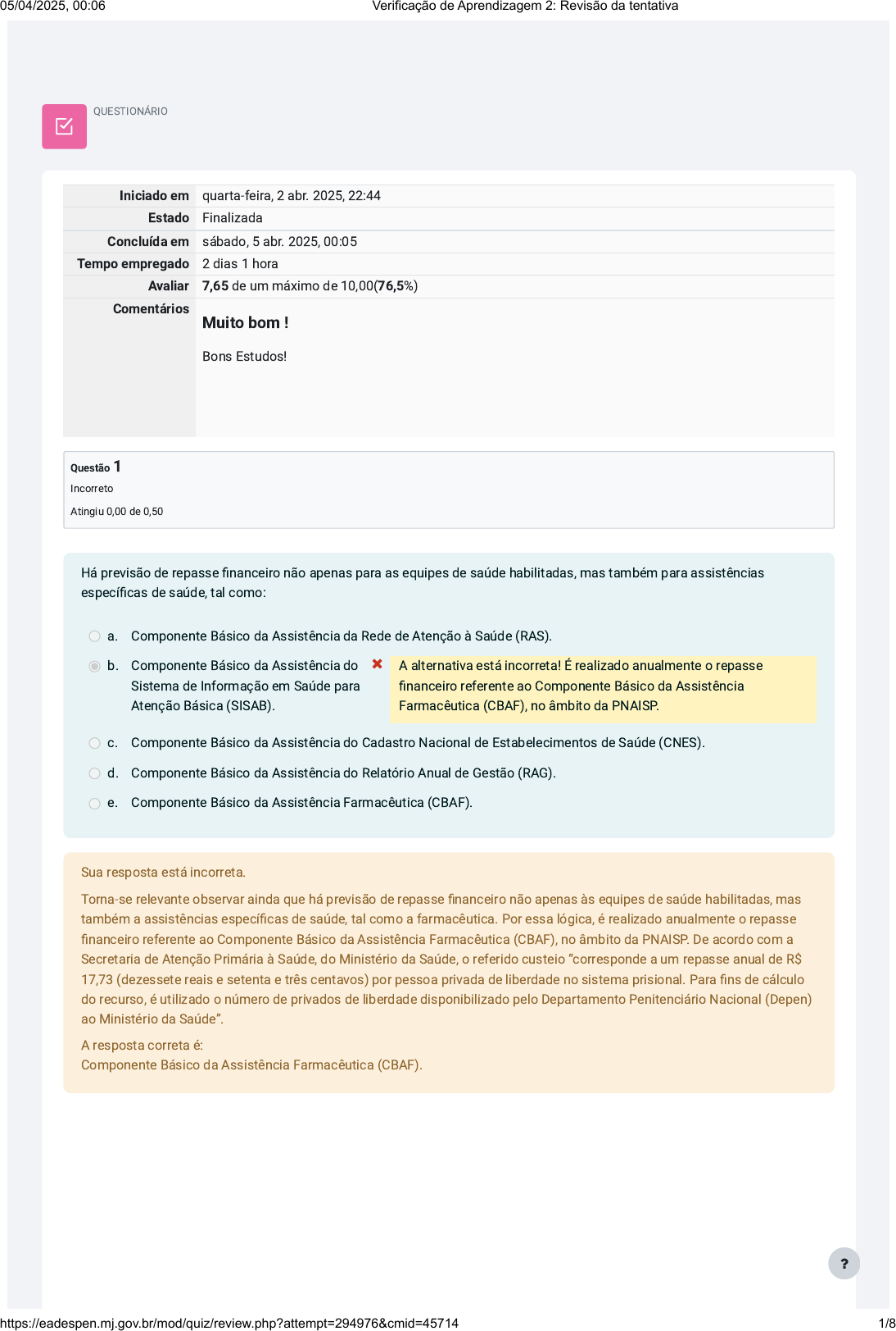 Iniciado em quarta-feira, 2 abr. 2025, 22:44 Estado Finalizada Concluída em sábado, 5 abr. 2025, 00:05 Tempo empregado 2 dias 1 hora Avaliar 7,65 de um máximo de 10,00(76,5%) Comentários Muito bom ! Bons Estudos! Questão 1 Incorreto Atingiu 0,00 de 0,50 QUESTIONÁRIO Há previsão de repasse financeiro não apenas para as equipes de saúde habilitadas, mas também para assistências específicas de saúde, tal como: a. Componente Básico da Assistência da Rede de Atenção à Saúde (RAS). b. Componente Básico da Assistência do Sistema de Informação em Saúde para Atenção Básica (SISAB). A alternativa está incorreta! É realizado anualmente o repasse financeiro referente ao Componente Básico da Assistência Farmacêutica (CBAF), no âmbito da PNAISP. c. Componente Básico da Assistência do Cadastro Nacional de Estabelecimentos de Saúde (CNES). d. Componente Básico da Assistência do Relatório Anual de Gestão (RAG). e. Componente Básico da Assistência Farmacêutica (CBAF). Sua resposta está incorreta. Torna-se relevante observar ainda que há previsão de repasse financeiro não apenas às equipes de saúde habilitadas, mas também a assistências específicas de saúde, tal como a farmacêutica. Por essa lógica, é realizado anualmente o repasse financeiro referente ao Componente Básico da Assistência Farmacêutica (CBAF), no âmbito da PNAISP. De acordo com a Secretaria de Atenção Primária à Saúde, do Ministério da Saúde, o referido custeio “corresponde a um repasse anual de R$ 17,73 (dezessete reais e setenta e três centavos) por pessoa privada de liberdade no sistema prisional. Para fins de cálculo do recurso, é utilizado o número de privados de liberdade disponibilizado pelo Departamento Penitenciário Nacional (Depen) ao Ministério da Saúde”. A resposta correta é: Componente Básico da Assistência Farmacêutica (CBAF). 05/04/2025, 00:06 Verificação de Aprendizagem 2: Revisão da tentativa https://eadespen.mj.gov.br/mod/quiz/review.php?attempt=294976&cmid=45714 1/8 Questão 2 Correto Atingiu 1,00 de 1,00 Quanto aos procedimentos para habilitação do financiamento das equipes de saúde, faça as associações. Está condicionada ao monitoramento e à avaliação dos serviços e das ações de saúde ofertados pelas equipes e à alimentação de dados no Sistema de Informação em Saúde para Atenção Básica (SISAB). Deverão obrigatoriamente comprometer-se a implantar a política em seu território a partir da apresentação de um Plano de Ação Estadual ou Municipal de assistência à saúde para as pessoas privadas de liberdade. Depende da adesão inicial à PNAISP por parte dos entes federados (estados/municípios). Indica, na portaria de habilitação, quais eAPP poderão ser credenciadas e farão jus ao repasse financeiro. Calculado com base na classificação e no quantitativo de equipes regularmente habilitadas. Manutenção do financiamento Entes federados (estados e/ou municípios) Habilitação das equipes de saúde Ministro da Saúde Incentivo financeiro de custeio mensal Sua resposta está correta. 1. Incentivo financeiro de custeio mensal: calculado com base na classificação e no quantitativo de equipes regularmente habilitadas. 2. Habilitação das equipes de saúde: depende da adesão inicial à PNAISP por parte dos entes federados (estados/municípios). 3. Entes federados (estados e/ou municípios): deverão obrigatoriamente comprometer-se a implantar a política em seu território a partir da apresentação de um Plano de Ação Estadual ou Municipal de assistência à saúde para as pessoas privadas de liberdade. 4. Ministro da Saúde: indica, na portaria de habilitação, quais eAPP poderão ser credenciadas e farão jus ao repasse financeiro. 5. Manutenção do financiamento: está condicionada ao monitoramento e à avaliação dos serviços e das ações de saúde ofertadas pelas equipes e à alimentação de dados no Sistema de Informação em Saúde para Atenção Básica (SISAB). Com a implementação da PNAISP, previu-se que a adesão às diretrizes emanadas por essa política poderia gerar um “incentivo financeiro de custeio mensal” calculado com base na classificação e no quantitativo de equipes regularmente habilitadas. Não obstante, a habilitação das equipes depende da adesão inicial à PNAISP, por parte dos entes federados (estados e/ou municípios), que deverão obrigatoriamente comprometer-se a implantar a política em seu território a partir da apresentação de um Plano de Ação Estadual ou Municipal de assistência à saúde para as pessoas privadas de liberdade. Para a formalização da adesão, publica-se seu extrato no Diário Oficial da União, sendo autorizado, posteriormente, o início do processo de habilitação das equipes. É importante frisar que, na portaria de habilitação, serão indicados pelo Ministro da Saúde quais eAPP poderão ser credenciadas e farão jus ao repasse financeiro via transferência do fundo nacional ao fundo estadual e/ou municipal a depender de quem estiver pactuando. A Portaria GM/MS nº 2.298/2021 prevê, ainda, que a manutenção do financiamento está condicionada ao monitoramento e à avaliação dos serviços e das ações de saúde ofertadas pelas equipes a partir do cadastramento destas no SCNES, bem como da alimentação de dados no Sistema de Informação em Saúde para Atenção Básica (SISAB). O ente federativo beneficiário também deve apresentar comprovação da aplicação dos recursos financeiros percebidos por meio do Relatório Anual de Gestão (RAG). A resposta correta é: Está condicionada ao monitoramento e à avaliação dos serviços e das ações de saúde ofertados pelas equipes e à alimentação de dados no Sistema de Informação em Saúde para Atenção Básica (SISAB). → Manutenção do financiamento, Deverão obrigatoriamente comprometer-se a implantar a política em seu território a partir da apresentação de um