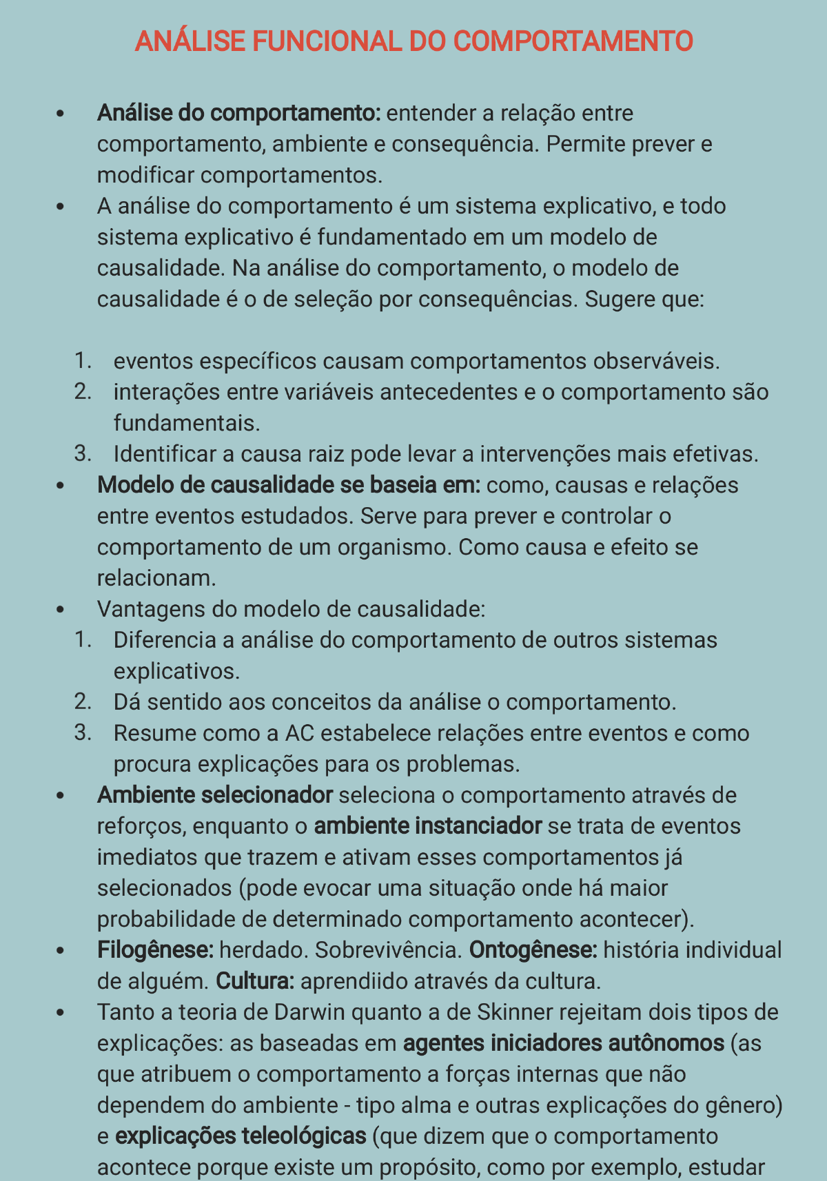 ANÁLISE FUNCIONAL DO COMPORTAMENTO Análise do comportamento: entender a relação entre comportamento, ambiente e consequência. Permite prever e modificar comportamentos. A análise do comportamento é um sistema explicativo, e todo sistema explicativo é fundamentado em um modelo de causalidade. Na análise do comportamento, o modelo de causalidade é o de seleção por consequências. Sugere que: 1. eventos específicos causam comportamentos observáveis. 2. interações entre variáveis antecedentes e o comportamento são fundamentais. 3. Identificar a causa raiz pode levar a intervenções mais efetivas. Modelo de causalidade se baseia em: como, causas e relações entre eventos estudados. Serve para prever e controlar o comportamento de um organismo. Como causa e efeito se relacionam. Vantagens do modelo de causalidade: 1. Diferencia a análise do comportamento de outros sistemas explicativos. 2. Dá sentido aos conceitos da análise comportamento. 3. Resume como a AC estabelece relações entre eventos e como procura explicações para os problemas. Ambiente selecionador seleciona o comportamento através de reforços, enquanto o ambiente instanciador se trata de eventos imediatos que trazem e ativam esses comportamentos já selecionados (pode evocar uma situação onde há maior probabilidade de determinado comportamento acontecer). Filogênese: herdado. Sobrevivência. Ontogênese: história individual de alguém. Cultura: aprendiido através da cultura. Tanto a teoria de Darwin quanto a de Skinner rejeitam dois tipos de explicações: as baseadas em agentes iniciadores autônomos (as que atribuem o comportamento a forças internas que não dependem do ambiente tipo alma e outras explicações do gênero) e explicações teleológicas (que dizem que comportamento acontece porque existe um propósito, como por exemplo, estudarporque quer passar na prova ou seja, sem a existência de um reforço que levou a tal comportamento). Reforço diferencial: reforçar comportamentos que quer e punir comportamentos que não quer. Ambiente é só aquilo que afeta o organismo e o comportamento. Não é separado do comportamento, mas sim parte do próprio fenômeno comportamental. Eventos ambientais: 1. Evocativa: não ensina um novo comportamento, apenas altera a probabilidade dele acontecer (a mesma coisa que o instanciador). Normalmente ligado a lembranças e emoções. 2. Alteradoras de repertório: ocorre quando o ambiente modifica o repertório comportamental do indivíduo de forma duradoura. Operações motivadoras: diminuem ou aumentam a efetividade de um estímulo (punindo ou reforçando). 1. Operações estabelecedoras (OE): AUMENTAM a efetividade reforçadora ou punidora da consequência. 2. Operações abolidoras (AO): DIMINUEM a efetividade reforçadora ou punidora da consequência. Operações motivadoras incondicionadas: são eventos aos quais os organismos já nascem sensíveis, sem necessidade de aprendizado prévio. Operações motivadoras condicionadas: são eventos que se tornam motivadores por meio da experiência e do aprendizado. Emoções: São respostas a estimulos internos ou externos. Uma predisposição para a ação. Não podem ser vistas como a causa para algum comportamento, porque também são comportamentos. Deve ser analisada em termos de relações entre organismo e ambiente e não se restringir às condições corporais momentâneas. Em um episódio emocional, há interação entre comportamento operante e respondente. Não é só o que sentimos, mas também a maneira como respondemos ao ambiente. Eliciado: comportamento respondente (automático/reflexo) Evocado: comportamento operante (modificado por consequências - reforços/punições). Condicionamento emocional: Quando se associa experiências emocionais com situações específicas. Ansiedade: automática e incondicionada.Supressão condicionada: quando o indivíduo reduz ou para completamente um comportamento quando um estímulo que foi pareado anteriormente a um evento aversivo está presente. Por que as pessoas se comportam de determinada maneira? A resposta está na história de interação da pessoa com o ambiente. Relação causau: tentar identificar o motivo, causa, como, quando e etc. Se nosso "efeito" é o comportamento humano, tudo o que possa afetá-lo de alguma forma deve ser tratado como "causa", e o que nos resta é o ambiente; Liberdade: nos sentimos livres quando somos positivamente reforçados, pois sentimos que estamos fazendo o que queremos, gostamos ou escolhemos. Reduzir a coerção aumenta a sensação de liberdade. Autocontrole: identificar e controlar algumas das variáveis que controlam seu próprio comportamento. A liberdade não existe porque: somos limitados por fatores sociais, econômicos e culturais.