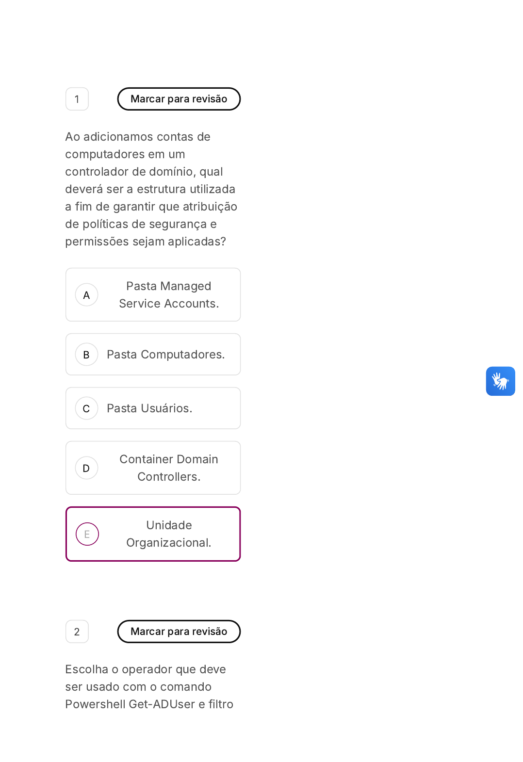 A B C D E 1 Marcar para revisão Ao adicionamos contas de computadores em um controlador de domínio, qual deverá ser a estrutura utilizada a fim de garantir que atribuição de políticas de segurança e permissões sejam aplicadas? Pasta Managed Service Accounts. Pasta Computadores. Pasta Usuários. Container Domain Controllers. Unidade Organizacional. 2 Marcar para revisão Escolha o operador que deve ser usado com o comando Powershell Get-ADUser e filtro A B C D E LDAPFilter para trazer um resultado "igual a": -ne -eq -gt -ge -like 3 Marcar para revisão Você é administrador de um ambiente Windows Server e recebe uma mensagem do suporte informando que não estão conseguindo encontrar os nomes referente a lista de IPs que você passou para eles, o que pode estar ocorrendo? A B C D E O suporte está digitando os endereços IPs no PowerShell por isso não está funcionando. Não é possível encontrar o nome de um Host tendo somente o endereço IP. Antes de encontrar o nome correspondente ao IP, primeiro deve ser feito uma configuração no Firewall do serviço de DNS. Você deve verificar se a Zona de Pesquisa Inversa está devidamente configurada. Esse tipo de consulta só deve ser feito por um Administrador. 4 Marcar para revisão Você é administrador de um ambiente Windows Server e acaba de instalar o IIS Internet Information Services no A B C D E servidor SRVIntranet-01 e gostaria de realizar um teste para saber se o serviço está funcionando, como você poderia realizar esse teste? O teste só será possível quando um site foi configurado. Basta abrir o navegador na sua estação de trabalho e digitar localhost. Abra o PowerShell e digite o comando ping -a SRVIntranet-01. Basta abrir o navegador na sua estação de trabalho e digitar 127.0.0.1. Estando logado no servidor SRVIntranet- 01, basta abrir o navegador e digitar localhost ou o IP 127.0.0.1. 5 Marcar para revisão (INSTITUTO AOCP - 2019 - UFFS - Analista de Tecnologia da Informação) Qual é o 00 hora : 44 min : 09 seg Ocultar Prova AV Gestão e Configuração De Serviç… A B C D E protocolo padrão mais utilizado no mercado para a gestão de diretórios, e que tem como uma de suas funcionalidades acessar um banco de informações de uma rede por meio de protocolos TCP/IP? DNS (Domain Name System) MGCP (Media Gateway Control Protocol) NAP (Network Access Protocol) NNTP (Network News Transfer Protocol) LDAP (Lightweight Directory Access Protocol) 6 Marcar para revisão Sobre as configurações das propriedades do servidor local usando a ferramenta Gerenciador do Servidor, analise as assertivas e marque o item correto. Questão 10 de 10 Respondidas (10) Em branco (0) Finalizar prova 1 2 3 4 5 6 7 8 9 10 A B C D E A propriedade Nome do Computador ao modificar para outra descrição o nome do servidor será aplicada instantaneamente. É possível alterar o nome do computador e o grupo de trabalho e as configurações serem aplicadas simultaneamente. Apenas a mudança do Grupo de Trabalho será necessário o reinício da máquina e nunca a alteração do nome do computador. As descrições do nome do computador e grupo de trabalho só podem ser definidas durante o processo de instalação do sistema operacional Windows Server. A mudança do nome do computador exige o reinício da máquina para efetivação da alteração. A B C D E 7 Marcar para revisão Assinale a alternativa que preencha corretamente a lacuna. Ao criarmos uma _______________, a mesma deve ser armazenada em uma unidade organizacional para que possa ser aplicadas diretivas de segurança para o referido computador/servidor. Conta de Usuário. Pasta compartilhada. Impressora. Senha. Conta de Computador. 8 Marcar para revisão Qual parâmetro você pode usar com o comando Search- ADAccount para retornar todas as contas desabilitadas? A B C D E A B C LockedOut. AccountInactive. PasswordExpiring. AccountExpired. AccountDisabled. 9 Marcar para revisão Existem vários softwares disponíveis no mercado para virtualização. Sobre o Virtual Box, julgue as assertivas e assinale o item correto. É um software de virtualização que roda apenas no Linux. É um software pago e o utilizador precisa adquirir uma licença de uso. Recomenda-se utilizá-lo para ambientes de testes apenas. D E Ao usá-lo você terá acesso irrestrito aos recursos da máquina hospedeira. A máquina virtual criada no Virtual Box não possui uma extensão específica. 10 Marcar para revisão (FCC - 2020 - AL/AP - Analista Legislativo - Administrador de Rede e Telecomunicações) O Lightweight Directory Access Protocol (LDAP): A B É um serviço de diretório transmitido nativamente de modo seguro sobre a camada de rede. Sua topologia em barramento permite liberdade de configuração, principalmente porque é processado usando o padrão X.500. Sua autenticação, por intermédio de uma autoridade certificadora (CA), é realizada na camada de aplicação. É um serviço de diretório transmitido de modo seguro sobre a camada de enlace. Sua topologia em anel permite liberdade de configuração, principalmente porque é processado usando o padrão X.509. C D Facilita o acesso a dados do usuário e estabelece um relacionamento entre este e os dados do ambiente computacional a que pertence. Os certificados digitais emitidos por uma autoridade certificadora (CA) garantem o acesso à informação de forma segura. Sendo executado sob o padrão X.509, é na camada de rede que a segurança é garantida. Cria um diretório adotando a topologia de barramento e é funcionalmente idêntico ao protocolo X.500. Executado nativamente de modo seguro sobre TCP/IP, sua autenticação, por intermédio de uma autoridade certificadora (CA), é realizada na camada de aplicação. E Cria um diretório adotando a topologia de árvore e é executado sobre o protocolo TCP/IP. Apesar de ser transmitido de modo não seguro, é possível torná-lo seguro usando as tecnologias Secure Sockets Layer (SSL) e Transport Laye