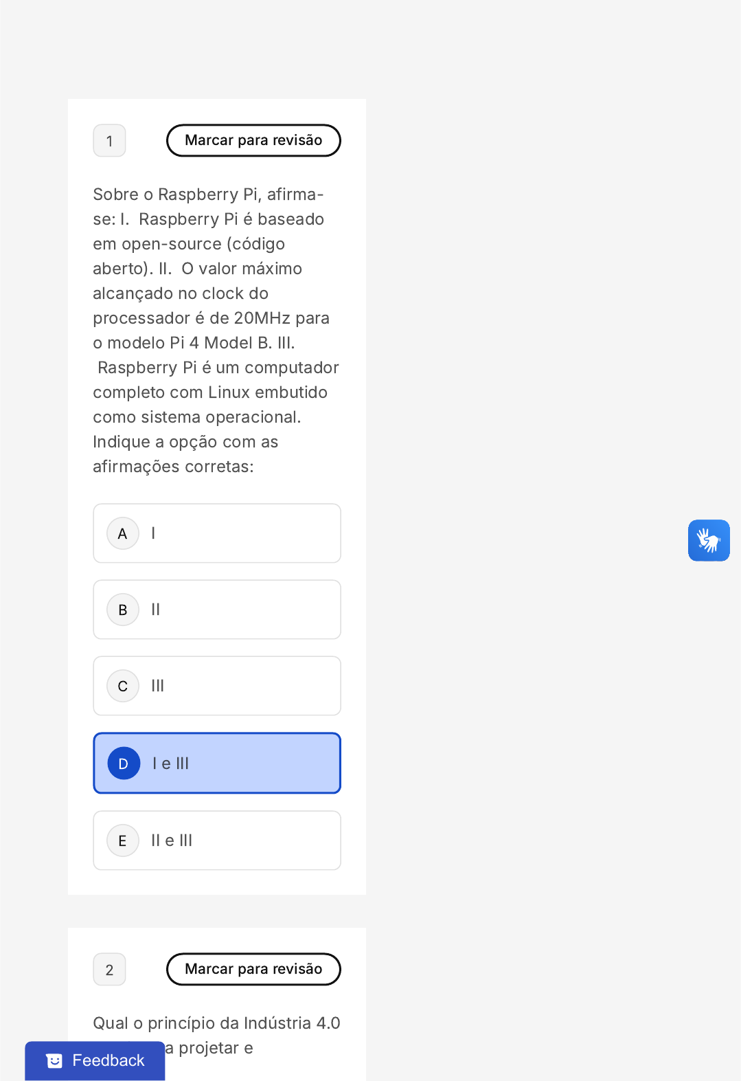 A B C D E 1 Marcar para revisão Sobre o Raspberry Pi, afirma- se: I. Raspberry Pi é baseado em open-source (código aberto). II. O valor máximo alcançado no clock do processador é de 20MHz para o modelo Pi 4 Model B. III. Raspberry Pi é um computador completo com Linux embutido como sistema operacional. Indique a opção com as afirmações corretas: I II III I e III II e III 2 Marcar para revisão Qual o princípio da Indústria 4.0 que busca projetar e Feedback A B C D E A B desenvolver processos de fabricação e produtos com impacto no meio ambiente próximo a zero e com a capacidade de reciclagem do produto próxima a 100%? Modularidade Interoperabilidade Sustentabilidade Conectividade Descentralização 3 Marcar para revisão Um dos objetivos das etapas de pré-processamento dos dados a serem analisados é fazer uma análise prévia para antecipar resultados. descartar alguns dados que se sabe não vai dar tempo para analisar. C D E A B tratar os dados recebidos, organizando-os para que possam ser analisados corretamente. reenviar os dados para fonte emissora. executar a redução de dimensões para evitar overfitting. 4 Marcar para revisão Marque a opção correta acerca da função cumprida pelas plataformas de IoT em uma arquitetura destinada à internet das coisas: Elas configuram outras plataformas de IoT para registrar automaticamente dispositivos de internet das coisas. Elas roteiam os pacotes de acordo com a prioridade marcada no header do pacote. C D E A B Elas expandem a capacidade dos dispositivos, já que eles são severamente limitados em processamento e memória. Elas sinalizam a capacidade do payload de pacotes. Elas implementam o nível de qualidade de serviço (QoS) das mensagens. 5 Marcar para revisão A arquitetura do protocolo MQTT possibilita que ele seja aplicado com sucesso em diversas plataformas de IoT. O MQTT consiste em alguns componentes básicos. A respeitos dos componentes básicos que formam o MQQT, selecione a opção CORRETA. Subscriber, o publisher e o broker. Confirmable, non- confirmable, reset e acknowledgement. C D E A B C D E Protocolos de Namespaces e de versionamento. Componentes de qualidade de serviço (QoS) e de segurança de comunicação. POST, GET, PUT e DELETE. 6 Marcar para revisão Selecione a opção correta que apresenta como é chamado um programa escrito com o IDE para Arduino. fonte IDE Sketch Criptografia Código-fonte Programa Arduino A B C D E 7 Marcar para revisão O Raspberry Pi é utilizado para diversos projetos, desde os de objetivos pedagógicos, aos comerciais. Por ser pequeno e versátil ele também é amplamente utilizado em projetos de automação residencial. Em relação ao Raspberry Pi, selecione a opção correta que o define adequadamente. Computador de baixo custo. Macrocomputador. Megacomputador. Nanocomputador. Uma extensão do Arduino. 8 Marcar para revisão Qual das opções é um benefício da realidade aumentada na Indústria 4.0? A B C D E Reduzir custo de mão de obra Reduzir consumo de energia Aumentar a quantidade de dados para análise Analisar mais rápido os dados Reduzir a ocorrência de erros em montagens ou manutenções 9 Marcar para revisão O XMPP é um protocolo aberto que é bastante utilizado em aplicações de IoT. Como todos os protocolos utilizados para este tipo de projeto, ele possui pontos fortes e fracos. A respeito dos pontos fortes do XMPP, selecione a opção que NÃO corresponde a uma vantagem. A B C D E Incorpora mecanismos de TLS que garantem a confidencialidade e integridade dos dados. Utiliza o esquema de endereçamento para reconhecer dispositivos na rede. Aplica a arquitetura cliente-servidor. Mensagens são baseadas em texto com criptografia ponta a ponta. Trabalha de modo descentralizado. 10 Marcar para revisão Assinale a opção incorreta sobre a plataforma AWS. A B C Disponibiliza o serviço AWS Lambda, que permite ao cliente carregar funções na nuvem e executá-las de forma transparente. Possui as seguintes categorias de serviço: Análise, Computação, Bancos de Dados, Blockchain, Robótica e Satélite. Implementa um marketplace em que usuários podem assinar serviços fornecidos por terceiros. D E Implementa um marketplace que permite que o usuário receba o produto ou serviço comprado diretamente do fornecedor, em vez da AWS. Possui o módulo chamado de IAM (Identify and Access Management), que é responsável pelas regras de segurança, autorização e identificação de acesso. 00 hora : 42 min : 24 seg Ocultar Questão 10 de 10 Respondidas (10) Em branco (0) Finalizar prova 1 2 3 4 5 6 7 8 9 10 Prova AV Internet Das Coisas
