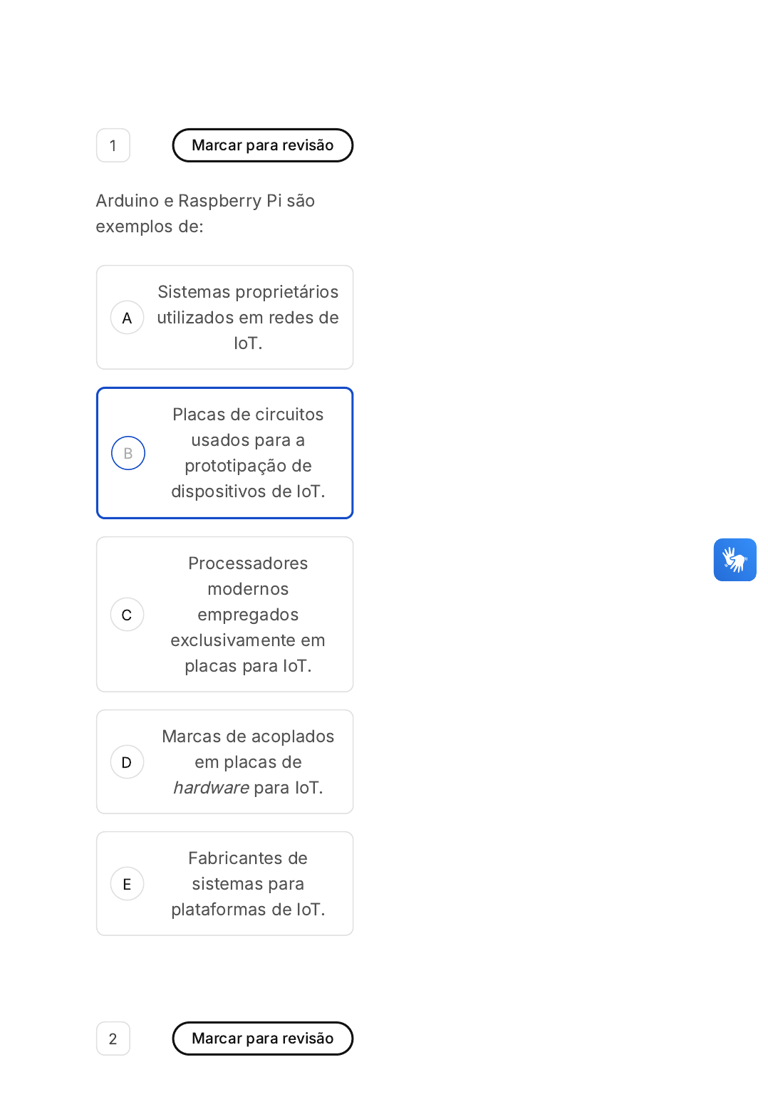 A B C D E 1 Marcar para revisão Arduino e Raspberry Pi são exemplos de: Sistemas proprietários utilizados em redes de IoT. Placas de circuitos usados para a prototipação de dispositivos de IoT. Processadores modernos empregados exclusivamente em placas para IoT. Marcas de acoplados em placas de hardware para IoT. Fabricantes de sistemas para plataformas de IoT. 2 Marcar para revisão A B C D E No contexto da plataforma de IoT do Google, provisionamento significa ... Processo de segurança destinado a detectar dispositivos com baixa performance. Processo de entrega dos serviços adquiridos na plataforma. Processo de envio de mensagens de controle para os dispositivos. Processo de adoção/registro dos equipamentos até que eles estejam prontos para uso. Processo de registro dos sensores em outras plataformas de IoT. 3 Marcar para revisão Sobre as vantagens e desvantagens de se estabelecer um padrão e A B C melhores práticas para IoT, aponte as opções verdadeiras. I. O esforço de desenvolver soluções completas fim a fim reduz o número de competidores no mercado. II. É interesse de governos, agências reguladoras e até mesmo dos fabricantes que padrões sejam definidos. III. Padronizar IoT retarda a evolução e a adoção de novas tecnologias. IV. Alguns fabricantes de IoT implementam estratégias de mercado que intencionalmente travam o consumidor nos seus ambientes. V. O crescimento vertiginoso da tecnologia IoT levou os fabricantes a uma disputa acirrada que provocou o aparecimento de diversas soluções proprietárias. A sequência correta é: V, V, F, F, F. V, V, F, F, V. V, V, F, V, V. D E A B C D E V, V, V, F, V. V, V, V, V, V. 4 Marcar para revisão Marque a opção que não representa uma plataforma de IoT: Salesforce IoT Cloud Arduino NANO 33 IoT Arduino Cloud IoT IBM Watson IoT platform Cisco IoT Cloud Connect 5 Marcar para revisão Leia atentamente as sentenças abaixo: I. Dispositivos sofisticados usados para aquisição de dados em tempo real. A B C D E II. Convertem medição física em sinais elétricos digitais ou analógicos. III. Alcance e precisão são importantes fatores na escolha. As descrições acima se referem respectivamente à/ao: Família de placas Arduino Dispositivos de IoT Plataformas de IoT Sensores ESP32 e seus antecessores 6 Marcar para revisão Um dos protocolos mais utilizados para desenvolver projetos de IoT é o MQTT. Cada protocolo tem uma orientação que é a base para o seu desenvolvimento. A respeito do protocolo MQTT, selecione a opção CORRETA. A B C D E É orientado para dados, pois gerencia o fluxo entre o servidor e os dispositivos da rede. É orientado para Mensagem, pois trata cada mensagem como um bloco de dados que vai ser operado pelo broker. É orientado para Rede, uma vez que considera aspectos específicos da internet. É orientado para dispositivo, dado que trata a heterogeneidade dos diversos componentes que podem se integrar no sistema. É orientado para comunicação segura, uma vez que utiliza de protocolos que reduzem os riscos de comunicação na rede. 00 hora : 36 min : 05 seg Ocultar Questão 10 de 10 Respondidas (10) Em branco (0) Finalizar prova 1 2 3 4 5 6 7 8 9 10 SM1 Aplic. De Cloud, Iot e Indústria 4.0 Em… A B C 7 Marcar para revisão (FGV - TJ/PI - 2016) O HTTPS (protocolo de transferência de hipertexto seguro) faz uso de criptografia como parte do seu mecanismo de segurança. Sobre a criptografia do HTTPS, é correto afirmar que: Faz uso de duas chaves, uma pública, disponível para todos os usuários de um site, e uma chave privada, conhecida apenas pelo destinatário das requisições HTTPS. É assimétrica e utiliza uma única chave. A criptografia simétrica utilizada disponibiliza uma chave privada para cada um dos usuários previamente cadastrados pelo destinatário da requisição HTTPS. p D E A B Faz uso de quatro chaves, uma privada e uma pública para cada usuário, e uma privada e uma pública para cada destinatário. Faz uso de duas chaves, uma pública, disponibilizada pelo destinatário, e uma privada, que fica de posse dos usuários de um site. 8 Marcar para revisão A plataforma ThingsSpeak possui diversas características que a tornam uma escolha muito interessante para projetos de IoT. No entanto, todas as plataformas possuem algum ponto fraco e, no caso do ThingsSpeak, infelizmente, não é diferente. Selecione o item que apresenta uma desvantagem do ThingsSpeak. Acesso à nuvem pública. API para armazenamento e análise de dados. C D E Suporte às operações matemáticas. Pouco suporte para conexão simultânea de dispositivos. Integração exclusiva com o Matlab. 9 Marcar para revisão Existem diversas plataformas para desenvolvimento de projetos de IoT. Cada uma dessas plataformas possui características que vão desde o tempo de resposta a eventos, gerenciamento de dados, segurança e custos, que devem ser consideradas para a escolha de uma plataforma específica. A ThingsBoard é uma dessas plataformas que, entre outras características, possui código aberto. Em relação à plataforma ThingsBoard, selecione a opção CORRETA: A B C D E É gratuita para uso pessoal, mas deve ser paga quando o uso for comercial. É disponível para a maioria das distribuições do Linux, mas não para o Windows. É uma plataforma do lado do servidor de código aberto que permite monitorar e controlar seus dispositivos IoT. Utiliza os protocolos CoAP, XMPP, HTTP. Ela precisa de aplicações de terceiros para fazer a integração entre dispositivos e aplicações WEB. 10 Marcar para revisão A plataforma OpenIoT fornece recursos para integrar dispositivos em rede WEB. O elemento da arquitetura responsável por isso é a Rede Global de Sensores (GSN). A B C D E Nesse sentido, selecione a opção CORRETA sobre o protocolo usado no GSN. Protocolo HTTP, uma vez que é o protocolo padrão para comunicação na WEB. Protocolo CoAP, dado que é um protocolo para trabalhar com dispositivos com l