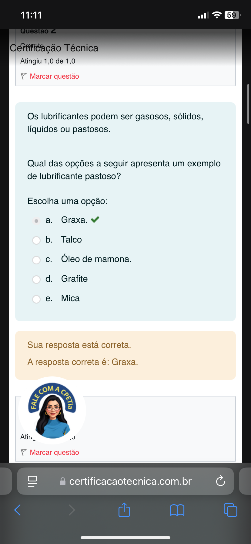 11:11 59 Questao Z Certificação Técnica Atingiu 1,0 de 1,0 Marcar questão Os lubrificantes podem ser gasosos, sólidos, líquidos ou pastosos. Qual das opções a seguir apresenta um exemplo de lubrificante pastoso? Escolha uma opção: a. Graxa. b. Talco C. Óleo de mamona. d. Grafite e. Mica Sua resposta está correta. A resposta correta é: Graxa. COM A Marcar questão certificacaotecnica.com.br